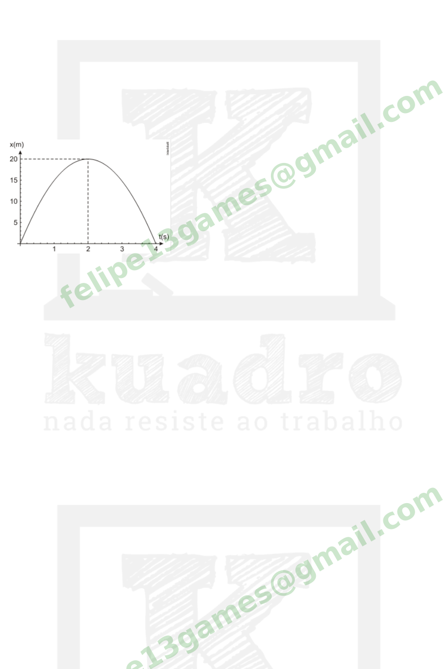 ITA18 - Física LF2A1-1 - Movimento uniformemente variado Questão 1 (Cefet MG 2014) Um objeto tem a sua posição (x) em função do tempo (t) descrito pela parábola conforme o gráfico. Analisando-se esse movimento, o módulo de sua velocidade inicial, em m/s, e de sua aceleração, em m/s2, são respectivamente iguais a a) 10 e 20. b) 10 e 30 c) 20 e 10 d) 20 e 30 e) 30 e 10 f) não sei felipe13games@gmail.c om Questão 2 (Fuvest 1994) A figura adiante representa as velocidades em função do tempo de dois corpos, que executam movimentos verticais. O corpo A, de massa M, é descrito por uma linha contínua; o corpo B, de massa 3M, por uma linha tracejada. Em um dos intervalos de tempo l istados adiante, ambos estão sobre a ação exclusiva de um campo gravitacional constante. Tal intervalo é: felipe13games@gmail.c om a) de 0 a T1 b) de T1 a T2 c) de T2 a T3 d) de T3 a T4 e) de T4 a T5 f) não sei felipe13games@gmail.c om Questão 3 (Fuvest 1995) Uma torneira mal fechada pinga a intervalos de tempo iguais. A figura a seguir mostra a situação no instante em que uma das gotas está se soltando. Supondo que cada pingo abandone a torneira com velocidade nula e desprezando a resistência do ar, pode-se afirmar que a razão entre a distância A e B mostrada na figura (fora de escala) vale: a) 2 b) 3 c) 4 felipe13games@gmail.c om d) 5 e) 6 f) não sei Questão 4 (Fuvest 1996) Dois veículos A e B deslocam-se em trajetórias reti l íneas e paralelas uma à outra. No instante t = 0 s eles se encontram lado a lado. O gráfico adiante representa as velocidades dos dois veículos, em função do tempo, a partir desse instante e durante os 1200 s seguintes. Os dois veículos estarão novamente lado a lado, pela primeira vez, no instante a) 400 s b) 500 s c) 600 s d) 800 s e) 1200 s f) não sei felipe13games@gmail.c om Questão 5 (Fuvest 1997) Um carro se desloca numa trajetória reti l ínea e sua velocidade em função do tempo, a partir do instante t = 10 s, está representada no gráfico a seguir. Se o carro partiu do repouso e manteve uma aceleração constante até t =15 s, a distância percorrida, desde sua partida até atingir a velocidade de 6 m/s, vale: felipe13games@gmail.c om a) 12,5 m b) 18,0 m c) 24,5 m d) 38,0 m e) 84,5 m felipe13games@gmail.c om Questão 6 (Fuvest 1998) Dois trens A e B fazem manobra em uma estação ferroviária deslocando-se paralelamente sobre tri lhos reti l íneos. No instante t = 0 s eles estão lado a lado. O gráfico representa as velocidades dos dois trens a partir do instante t = 0 s até t = 150 s, quando termina a manobra. A distância entre os dois trens no final da manobra é: a) 0 m b) 50 m c) 100 m d) 250 m e) 500 m f) não sei felipe13games@gmail.c om felipe13games@gmail.c om Questão 7 (Fuvest 1999) Na figura, estão representadas as velocidades em função do tempo, desenvolvidas por um atleta, em dois treinos A e B, para uma corrida de 100 m rasos. Com relação aos tempos gastos pelo atleta para percorrer os 100 m, podemos afirmar que, aproximadamente, a) no B levou 0,4 s a menos que no A. b) no A levou 0,4 s a menos que no B. c) no B levou 1,0 s a menos que no A. d) no A levou 1,0 s a menos que no B. e) no A e no B levou o mesmo tempo. f) não sei felipe13games@gmail.c om Questão 8 (Fuvest 2000) As velocidades de crescimento vertical de duas plantas A e B, de espécies diferentes, variaram, em função do tempo decorrido após o plantio de suas sementes, como mostra o gráfico. É possível afirmar que:felipe13games@gmail.c om a) A atinge uma altura final maior do que B b) B atinge uma altura final maior do que A c) A e B atingem a mesma altura final d) A e B atingem a mesma altura no instante t0 e) A e B mantêm altura constante entre os instantes t1 e t2 f) não sei felipe13games@gmail.c om Questão 9 (Ufscar 2001) Um partícula se move em uma reta com aceleração constante. Sabe-se que no intervalo de tempo de 10s ela passa duas vezes pelo mesmo ponto dessa reta, com velocidades de mesmo módulo, v=4,0m/s, em sentidos opostos. O módulo do deslocamento e o espaço percorrido pela partícula nesse intervalo de tempo são, respectivamente, a) 0,0 m e 10 m. b) 0,0 m e 20 m. c) 10 m e 5,0 m. d) 10 m e 10 m. e) 20 m e 20 m. f) não sei felipe13games@gmail.c om Questão 10 (Ufscar 2002) O diagrama mostra como varia o espaço s percorrido por um corpo que se desloca sobre uma trajetória reti l ínea, em função do tempo transcorrido t. O diagrama v × t, onde v é a velocidade do corpo, que melhor representa o movimento, no intervalo de tempo considerado, é: felipe13games@gmail.c om a) b) c) d) e) f) não sei felipe13games@gmail.c om Questão 11 (Ufscar 2004) Considere as quatro afirmações seguintes. 1. No MRUV, a velocidade varia l inearmente com o tempo. 2. Um carro em marcha à ré não pode realizar movimento acelerado. 3. O coeficiente angular da reta que você obtém ao construir o gráfico da velocidade × tempo fornece a velocidade inicial do móvel. 4. Pode-se determinar a velocidade de um móvel no MRUV, sem conhecer o tempo de percurso do móvel. Das afirmações apresentadas, são verdadeiras a) I e II, apenas. b) I e III, apenas. c) I e IV, apenas. d) II e IV, apenas. e) III e IV, apenas. f) não sei felipe13games@gmail.c om Questão 12 (Ufscar 2006) Em um fi lme, para explodir a parede da cadeia a fim de que seus comparsas pudessem escapar, o "bandido" ateia fogo a um pavio de 0,6 m de comprimento, que tem sua outra extremidade presa a um barri l contendo pólvora. Enquanto o pavio queima, o "bandido" se põe a correr em felipe13games@gmail.c om direção oposta e, no momento em que salta sobre uma rocha, o barri l explode. Ao planejar esta cena, o piroplasta uti l izou os dados gráficos obtidos cuidadosamente da análise das velocidades do dublê (que representa o bandido) e da chama no pavio, o que permitiu determinar que a rocha deveria estar a uma distância, relativamente ao ponto em que o pavio foi aceso, em m, de a