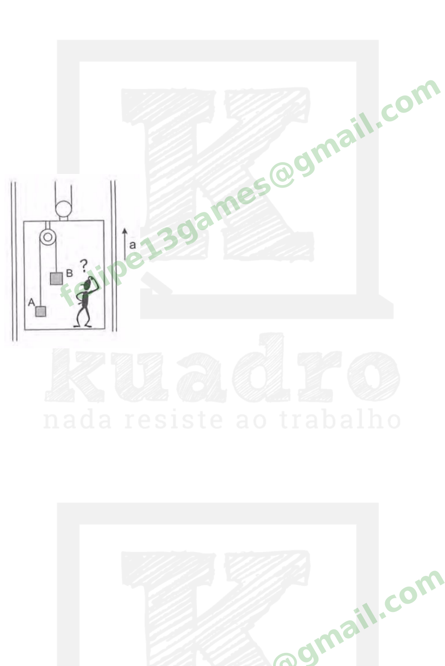 ITA18 - Física LF3B2 - Dinâmica no referencial não-inercial Questão 1 A figura mostra um elevador que se move para cima em movimento acelerado com aceleração a = 2 m/s2 num local onde a gravidade vale g = 10 N/kg. Os blocos A e B, de massas 2 kg e 6 kg, respectivamente, encontram-se l igados entre si por meio de um fio ideal que passa por uma polia presa ao teto do elevador. Determine a aceleração com que movem-se os bloquinhos para o observador dentro do elevador e a tração no cordão. a) 3 m/s2 ; 18 N b) 6 m/s2 ; 36 N c) 12 m/s2 ; 54N d) 18 m/s2 ; 72 N e) 24 m/s2 ; 108 N felipe13games@gmail.c om Questão 2 Na figura tem-se um elevador que se move com aceleração a = 5 m/s2 para cima. Um bloco inicialmente em repouso, em relação ao elevador, é abandonado do topo de um plano inclinado e escorrega ladeira abaixo, até atingir o piso do elevador. Admitindo g = 10 N/kg e desprezando atritos, determine a aceleração adquirida pelo bloco ladeira abaixo, em relação ao elevador, e quanto tempo o bloco gasta para descer toda a ladeira, admitindo que a mesma tenha altura vertical h = 2,7 m. Dado: senα = 0,60 e cosα = 0,80. felipe13games@gmail.c om a) 7 m/s2 e 1 s b) 8 m/s2 e 2 s c) 9 m/s2 e 1 s d) 10 m/s2 e 2 s e) 15 m/s2 e 2 s felipe13games@gmail.c om Questão 3 A figura mostra um trem que parte do repouso sobre tri lhos reti l íneos com aceleração constante a em relação à Terra. Uma caixa de massa m = 2 kg foi abandonada sobre uma rampa l isa que se encontra fixa ao piso desse trem. Assim, determine o valor da aceleração a para que a caixa permaneça em repouso em relação à rampa, durante o movimento do trem. Dado: g = 10 N/kg felipe13games@gmail.c om a) 7,5 m/s2 b) 5 m/s2 c) 2,5 m/s2 d) 1,5 m/s2 e) 0,5 m/s2 felipe13games@gmail.c om Questão 4 A figura mostra um trem que parte do repouso sobre tri lhos reti l íneos com aceleração constante a em relação à Terra. Uma caixa de massa m = 2 kg foi abandonada sobre uma rampa l isa que se encontra fixa ao piso desse trem. Assim, determine o valor da aceleração com que a caixa subirá a rampa, em relação ao trem, caso este se mova com aceleração a = 9 m/s2 em relação à Terra. Dado: g = 10 N/kg a) 6,0 m/s2 b) 4,8 m/s2 c) 3,6 m/s2 d) 2,4 m/s2 e) 1,2 m/s2 felipe13games@gmail.c om felipe13games@gmail.c om Questão 5 A figura mostra um elevador panorâmico que sobe com aceleração a = 2 m/s2. De repente, Dr Bruno percebe que a lâmpada se desprende do teto a 2,94 m de altura do piso do elevador e passa a cair verticalmente em direção ao piso. Quanto tempo ele dispõe para afastar o pé e não se machucar com o impacto da lâmpada no piso? Dado g = 10 N/kg a) 0,4 s b) 0,5 s c) 0,6 s d) 0,7 s e) 0,8 s felipe13games@gmail.c om Questão 6 Considere agora que o outro elevador esteja subindo com uma incrível velocidade constante V = 300 km/h. De repente, Dr. Bruno percebe que a lâmpada se desprende do teto a 3,2 m de altura do piso do elevador e passa a cair verticalmente em direção ao piso. quanto tempo ele dispões para afastar o pé e não se machucar com o impacto da lâmpada no piso? Dado g = 10 N/kg felipe13games@gmail.c om a) 0,4 s b) 0,5 s c) 0,6 s d) 0,7 s e) 0,8 s felipe13games@gmail.c om Questão 7 A figura mostra um pêndulo de comprimento L preso ao teto de um vagão que se move com aceleração constante a num local em que o campo gravitacional tem intensidade g. Se o pêndulo é posto a executar pequenas oscilações, o período dessas oscilações é dado por: a) felipe13games@gmail.c om b) c) d) Questão 8 (UFPA) Um ônibus caminha com velocidade constante em uma estrada horizontal quando, subitamente, o motorista acelera o veículo, fazendo com que os passageiros experimentem uma força que os impele para trás. Assinale a alternativa correta. a) a forca que os passageiros experimentam é de natureza fictícia ou inercial e proporcional ao peso de cada passageiro. b) a forca que os passageiros experimentam é de natureza fictícia ou inercial, mas independe do peso de cada passageiro. c) a forca que os passageiros experimentam é real, mas depende do campo gravitacional da Terra. d) a forca que os passageiros experimentam é real, mas independe do campo gravitacional da Terra. e) passageiros diferentes no interior do veículo experimentam forças fictícias de mesmo valor.felipe13games@gmail.c om Questão 9 (CEFET-CE) Medindo-se várias grandezas físicas referentes ao movimento de uma partícula em relação a distintos referenciais inerciais, verifica-se que algumas grandezas mudam com o referencial (relativas), enquanto outras não (absolutas). Constata-se que, no l imite de baixas velocidades da mecânica clássica: a) aceleração instantânea é relativa, enquanto velocidade instantânea é absoluta; b) força resultante é relativa, enquanto intervalo de tempo é absoluto; c) deslocamento é relativo, enquanto aceleração instantânea é absoluta; d) intervalo de tempo é relativo, enquanto deslocamento é absoluto; e) força resultante é relativa, enquanto velocidade instantânea é absoluta. felipe13games@gmail.c om felipe13games@gmail.c om felipe13games@gmail.c om Questão 10 (UECE 2008) Assinale a alternativa que, de acordo com a física newtoniana, contém apenas grandezas (físicas) que não dependem do referencial inercial adotado: a) trabalho e energia cinética b) força, massa e aceleração c) massa, energia cinética e aceleração d) temperatura e velocidade felipe13games@gmail.c om Questão 11 Sejam A e B dois referenciais inerciais (observadores inerciais) estudando o movimento de um móvel C. A Terra é admitida como um referencial inercial. Considerando os princípios da Mecânica Clássica, é errado afirmar que: a) mesmo A e B sendo referenciais inerciais, eles podem medir diferentes valores para a velocidade, a quantidade de movimento e para a energia cinética da bolinha C. Para isso, basta que A esteja se movendo em relação a B. b) os referenciais (observadores)