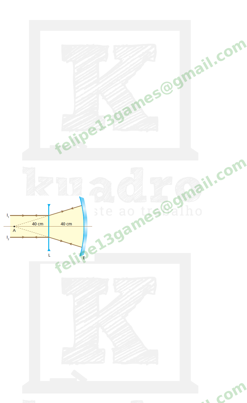 ITA18 - Física LF5C2-1 - Lentes esféricas Questão 1 (Fuvest-SP) Uma colher de plástico transparente, cheia de água e imersa no ar, pode funcionar como: a) lente convergente. b) lente divergente. c) espelho côncavo. d) microscópio composto. e) prisma. f) não sei felipe13games@gmail.c om Questão 2 (Univest-SP) Um feixe de raios paralelos, representado por I1 e I2, incide em uma lente bicôncava (L) para, em seguida, incidir em um espelho côncavo (E), conforme i lustra a figura. Na ref lexão, os raios retornam sobre si mesmos, convergindo para um ponto A, situado sobre o eixo principal comum. Com base nessas informações, é correto afirmar que, em valor absoluto, as abscissas focais de L e E valem, em centímetros, respectivamente: a) 40 e 20. b) 40 e 40. c) 40 e 80. d) 80 e 80. e) 80 e 120. a) 40 e 20 b) 40 e 40 c) 40 e 80 d) 80 e 80 e) 80 e 120 f) não sei felipe13games@gmail.c om Questão 3 felipe13games@gmail.c om (Ufla-MG) Coloca-se uma pequena lâmpada L no foco principal de uma lente biconvexa de índice de refração nL imersa em um líquido de índice de refração n1. Essa situação está esquematizada abaixo. Mantendo-se a posição da lâmpada em relação à lente e imergindo-se o conjunto em um outro l íquido de índice de refração n2, obteve-se o seguinte percurso para os raios luminosos: É correto afirmar que: a) n2 > n1 > nL b) n2 = nL > n1 c) nL > n2 > n1 d) n2 > nL > n1 e) nL = n1 > n2 f) não sei felipe13games@gmail.c om Questão 4 Desejando determinar a distância focal de uma lente esférica convergente, um estudante realiza um experimento no qual são empregadas, além da lente, duas lâminas iguais de vidro fosco (L1 e L2), em que estão pintadas duas faixas semicirculares de raios iguais e de concavidades voltadas para baixo. Movimentando as lâminas ao longo de um tri lho instalado sobre uma mesa, o estudante consegue posicioná- las de modo que a imagem de L1, projetada pela lente sobre L2, feche uma circunferência, conforme i lustrado a seguir: Nessas condições, que valor o estudante determinará para a distância focal da lente? a) 12 cm. b) 16 cm felipe13games@gmail.c om c) 18 cm d) 20 cm e) 25 cm f) não sei Questão 5 (PUC-SP) Leia com atenção a tira abaixo: Suponha que Bidu, para resolver o problema da amiga, que só tem 6 mm de altura, tenha uti l izado uma lente delgada convergente de distância focal 12 cm, colocada a 4 cm da formiguinha. Para o elefante, a altura da formiga, em cm, parecerá ser de: a) 0,6 b) 0,9 c) 1,2 d) 1,5 e) 1,8 f) não sei felipe13games@gmail.c om Questão 6 (Fuvest-SP) A figura abaixo mostra, numa mesma escala, o desenho de um objeto retangular e sua imagem, formada a 50 cm de uma lente convergente de distância focal f. O objeto e a imagem estão em planos perpendiculares ao eixo óptico da lente. Podemos afirmar que o objeto e a imagem: felipe13games@gmail.c om a) estão do mesmo lado da lente e que f = 150 cm. b) estão em lados opostos da lente e que f = 150 cm. c) estão do mesmo lado da lente e que f = 37,5 cm. d) estão em lados opostos da lente e que f = 37,5 cm. e) podem estar tanto do mesmo lado como em lados opostos da lente e que f = 37,5 cm. f) não sei felipe13games@gmail.c om Questão 7 Uma lente esférica convergente L e um espelho esférico côncavo E, ambos em operação de acordo com as condições de aproximação de Gauss, são dispostos coaxialmente conforme representa o esquema. Um anteparo retangular A e um objeto l inear O em forma de seta, ambos perpendiculares ao eixo do sistema, são posicionados nos locais indicados, i luminando-se o objeto por todos os lados. Sendo de 12 cm e 30 cm as distâncias focais de L e E, respectivamente, a melhor representação para a figura projetada em A é: a) b) c) felipe13games@gmail.c om d) e) f) não sei Questão 8 Uma lente plano-convexa de vidro em operação no ar apresenta distância focal f1 quando o raio de curvatura de sua face esférica tem medida R1. Desgastando-se essa lente, faz-se com que o raio de curvatura da face esférica adquira a medida R2, conforme indica a figura a seguir. Sendo f2 a distância focal da lente depois do desgaste, é correto afirmar que: a) f2 = f1/2 b) f2 = f1 c) f2 = 2f1 d) f2 = 3f1 e) o valor de f2 está indeterminado, já que não é conhecida a relação entre R2 e R1. f) não sei felipe13games@gmail.c om Questão 9 (Unifesp-SP) Um estudante observa uma gota de água em repouso sobre sua régua de acrí l ico, como ilustrado na figura. felipe13games@gmail.c om Curioso, percebe que, ao olhar para o caderno de anotações através dessa gota, as letras aumentam ou diminuem de tamanho conforme afasta ou aproxima a régua do caderno. Fazendo alguns testes e algumas considerações, ele percebe que a gota de água pode ser uti l izada como uma lente e que os efeitos ópticos do acrí l ico podem ser desprezados. Se a gota tem raio de curvatura de 2,5 mm e índice de refração 1,35 em relação ao ar, calcule a convergência C dessa lente. a) 100 di b) 120 di c) 140 di d) 170 di e) 200 di f) não sei felipe13games@gmail.c om Questão 10 (UFC-CE) Uma lente esférica delgada, construída de um material de índice de refração n, está imersa no ar (nar = 1,00). A lente tem distância focal f e suas superfícies esféricas têm raios de curvatura R1 e R2. Esses parâmetros obedecem a uma relação, conhecida como “equação dos fabricantes”, expressa por: Suponha uma lente biconvexa de raios de curvatura iguais (R1 = R2 = R), distância focal f0 e índice de refração n = 1,8 (figura I). Essa lente é partida ao meio, dando origem a duas lentes plano-convexas iguais (figura II). A distância focal de cada uma das novas lentes é: a) f0/2 b) 4f0/5 c) f0 d) 9f0/5 e) 2f0 f) não sei felipe13games@gmail.c om felipe13games@gmail.c om Questão 11 (Fuvest-SP) Um laser produz um feixe paralelo de luz, com 4 mm de diâmetro. Uti l izando um espelho plano e uma lente delgada convergente, deseja-se converter o feixe pa