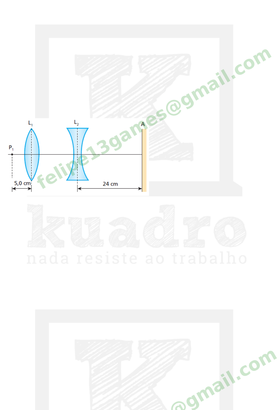ITA18 - Física LF5C2-2 - Lentes esféricas Questão 1 (ITA-SP – mod.) Considere um sistema composto de duas lentes circulares esféricas delgadas de 6,0 cm de diâmetro, dispostas coaxialmente, como indica a figura. L1 é uma lente convergente de distância focal de módulo igual a 5,0 cm e L2 é uma lente divergente de distância focal de módulo igual a 4,0 cm. No ponto P1, à esquerda do sistema, é colocado um objeto luminoso puntiforme a 5,0 cm de L1. À direita de L2, a uma distância d = 24 cm, é colocado um anteparo A, perpendicular ao eixo do sistema. Assim, temos que: a) sobre o anteparo A forma-se uma imagem real puntiforme de P1. b) sobre o anteparo A aparece uma região i luminada circular com 12 cm de diâmetro. c) sobre o anteparo aparece uma região i luminada circular com 6,0 cm de diâmetro. d) o anteparo f ica i luminado uniformemente em uma região muito grande. e) sobre o anteparo aparece uma região i luminada circular com 42 cm de diâmetro. f) não sei felipe13games@gmail.c om Questão 2 (ITA-SP) As duas faces de uma lente delgada biconvexa têm um raio de curvatura igual a 1,00 m. O índice de refração da lente para a luz vermelha é 1,60 e, para luz violeta, 1,64. Sabendo que a lente está imersa no ar, cujo índice de refração é 1,00, calcule a distância entre os focos de luz vermelha e de luz violeta, em centímetros. a) 2,4 cm b) 3,1 cm felipe13games@gmail.c om c) 4,2 cm d) 4,8 cm e) 5,2 cm f) não sei felipe13games@gmail.c om Questão 3 (IME-RJ) Um sistema óptico é constituído por duas lentes convergentes, 1 e 2, cujas distâncias focais são f e 2f, respectivamente. A lente 1 é fixa; a lente 2 está presa à lente 1 por uma mola cuja constante elástica é k. Com a mola em repouso (sem deformação), a distância entre as lentes é 2,5f. Determine o menor valor da força F para que o sistema produza uma imagem real de um objeto distante, situado à esquerda da lente 1. Despreze as forças de atrito. a) b) c) d) e) f) não sei felipe13games@gmail.c om Questão 4 (IME 2013) Um objeto puntiforme encontra-se a uma distância L de sua imagem, localizada em uma tela, como mostra a figura acima. Faz-se o objeto executar um movimento circular uniforme de raio (rprojeta, por meio de uma lente, a imagem do lustre do teto da sala de aula sobre o tampo da sua carteira. A respeito dessas imagens, em relação aos dispositivos ópticos referidos, pode-se afirmar que a) as três são virtuais. b) I e II são virtuais; III é real. c) I é virtual; II e III são reais. d) I é real; II e III são virtuais. e) as três são reais. f) não sei. felipe13games@gmail.c om Questão 14 (Fuvest 2008) Um sistema de duas lentes, sendo uma convergente e outra divergente, ambas com distâncias focais iguais a 8 cm, é montado para projetar círculos luminosos sobre um anteparo. O diâmetro desses círculos pode ser alterado, variando-se a posição das lentes. Em uma dessas montagens, um feixe de luz, inicialmente de raios paralelos e 4 cm de diâmetro, incide sobre a lente convergente, separada da divergente por 8 cm, atingindo finalmente o anteparo, 8 cm adiante da divergente. Nessa montagem específica, o círculo luminoso formado no anteparo é melhor representado por felipe13games@gmail.c om a) b) c) d) e) f) não sei. felipe13games@gmail.c om Questão 15 (Unifesp 2005) Tendo-se em vista que as lentes são, na prática, quase sempre usadas no ar, a equação dos fabricantes de lentes costuma ser escrita na forma: felipe13games@gmail.c om Nessas condições, pode-se afirmar que a convergência de uma lente plano-convexa de índice de refração n = 1,5 e cujo raio da face convexa é R = 20 cm é a) 0,50 di b) 1,0 di c) 1,5 di d) 2,0 di e) 2,5 di f) não sei. felipe13games@gmail.c om Questão 16 (Unifesp 2004) Uma lente convergente tem uma distância focal f = 20,0 cm quando o meio ambiente onde ela é uti l izada é o ar. Ao colocarmos um objeto a uma distância p = 40,0 cm da lente, uma imagem real e de mesmo tamanho que o objeto é formada a uma distância p' = 40,0 cm da lente. Quando essa lente passa a ser uti l izada na água, sua distância focal é modificada e passa a ser 65,0 cm. Se mantivermos o mesmo objeto à mesma distância da lente, agora no meio aquoso, é correto afirmar que a imagem será a) virtual, direita e maior. b) virtual, invertida e maior. c) real, direita e maior. d) real, invertida e menor. e) real, direita e menor. f) não sei. felipe13games@gmail.c om Questão 17 (Unesp 2003) Considere uma lente esférica delgada convergente de distância focal igual a 20 cm e um objeto real direito localizado no eixo principal da lente a uma distância de 25 cm do seu centro óptico. Pode-se afirmar que a imagem deste objeto é: a) real, invertida e maior que o objeto. b) real, direita e menor que o objeto. c) virtual, invertida e menor que o objeto. felipe13games@gmail.c om https://www.codecogs.com/eqnedit.php?latex=C&space;=&space;(n-1)&space;%5Ccdot&space;(%5Cfrac%7B1%7D%7BR_%7B1%7D%7D&space;+&space;%5Cfrac%7B1%7D%7BR_%7B2%7D%7D) d) virtual, direita e maior que o objeto. e) virtual, invertida e maior que o objeto. f) não sei. felipe13games@gmail.c om Questão 18 (Unesp 2003) Um objeto de 2 cm de altura é colocado a certa distância de uma lente convergente. Sabendo-se que a distância focal da lente é 20 cm e que a imagem se forma a 50 cm da lente, do mesmo lado que o objeto, pode-se afirmar que o tamanho da imagem é a) 0,07 cm. b) 0,6 cm. c) 7,0 cm. d) 33,3 cm. e) 60,0 cm. f) não sei. felipe13games@gmail.c om Questão 19 (Fuvest 2001) Uma pessoa segura uma lente delgada junto a um livro, mantendo seus olhos aproximadamente a 40cm da página, obtendo a imagem indicada na figura. Em seguida, sem mover a cabeça ou o l ivro, vai aproximando a lente de seus olhos. A imagem, formada pela lente, passará a ser a) sempre direita, cada vez menor. b) sempre direita, cada vez maior. felipe13games@gmail.c om c) direita cada vez menor, passando a invertida