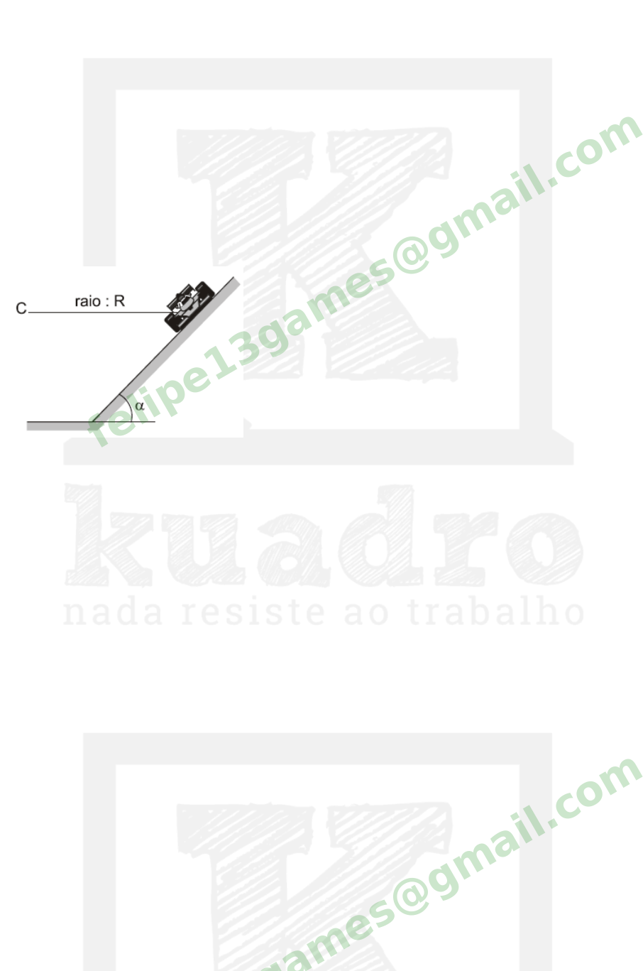 ITA18 - Física LF3B1-2 - Dinâmica do movimento curvilíneo Questão 1 (Unesp 2010) Curvas com ligeiras inclinações em circuitos automobil ísticos são indicadas para aumentar a segurança do carro a altas velocidades, como, por exemplo, no Talladega Superspeedway, um circuito uti l izado para corridas promovidas pela NASCAR (National Association for Stock Car Auto Racing). Considere um carro como sendo um ponto material percorrendo uma pista circular, de centro C, inclinada de um ângulo α e com raio R, constantes, como mostra a figura, que apresenta a frente do carro em um dos trechos da pista. Se a velocidade do carro tem módulo constante, é correto afirmar que o carro a) não possui aceleração vetorial. b) possui aceleração com módulo variável, direção radial e no sentido para o ponto C. c) possui aceleração com módulo variável e tangente à trajetória circular. d) possui aceleração com módulo constante, direção radial e no sentido para o ponto C. e) possui aceleração com módulo constante e tangente à trajetória circular. f) não sei. felipe13games@gmail.c om Questão 2 O esquema seguinte representa um disco horizontal que, acoplado rigidamente a um eixo vertical, gira uniformemente sem sofrer resistência do ar: felipe13games@gmail.c om Sobre o disco, estão apoiados dois blocos, A e B, constituídos de materiais diferentes, que distam do eixo 40 cm e 20 cm respectivamente. Sabendo que, nas condições do problema, os blocos estão na iminência de deslizar, obtenha: a) a relação vA/vB das velocidades l ineares de A e de B em relação ao eixo; b) a relação μA/μB dos coeficientes de atrito estático entre os blocos A e B e o disco. a) a) vA / vB = 2; b) μA / μB = 1/2 b) a) vA / vB = 1/2; b) μA / μB = 1/2 c) a) vA / vB = 2; b) μA / μB = 2 d) a) vA / vB = 1/2; b) μA / μB = 2 e) a) vA / vB = 4; b) μA / μB = 2 f) não sei felipe13games@gmail.c om Questão 3 (UFLA-MG) Um dos fatores que influem no desempenho de um carro de Fórmula 1 é o “efeito asa”. Esse efeito, que pode ser mais ou menos acentuado, surge na interação do ar com a geometria do carro. Quando se altera o ângulo de inclinação dos aerofólios, surge uma força vertical para baixo, de forma que o carro f ica mais preso ao solo. Considerando-se um carro com “efeito asa” igual ao seu peso, coeficiente de atrito estático μe = 1,25 entre pneus e asfalto e g = 10 m/s2, esse carro pode fazer uma curva plana horizontal de raio de curvatura 100 m, sem deslizar, com velocidade escalar máxima de: a) 90 km/h b) 144 km/h c) 180 km/h d) 216 km/h e) 252 km/h f) não sei felipe13games@gmail.c om felipe13games@gmail.c om felipe13games@gmail.c om Questão 4 Na figura a seguir, representa-se um pêndulo fixo em O, oscilando num plano vertical. No local, despreza-se a influência do ar e adota-se g = 10 m/s2. A esfera tem massa de 3,0 kg e o fio é leve e inextensível, apresentando comprimento de 1,5 m. Se, na posição A, o fio forma com a direção vertical um ângulo de 53° e a esfera tem velocidade igual a 2,0 m/s, determine a intensidade da força de tração no fio. Dados: sen 53° = 0,80; cos 53° = 0,60. a) 10 N b) 16 N c) 26 N d) 32 N e) 50 N f) não sei felipe13games@gmail.c om Questão 5 No esquema a seguir, representa-se um pêndulo cônico operando em condições ideais. A esfera pendular descreve movimento circular e uniforme, num plano horizontal, de modo que o afastamento angular do fio em relação à vertical é θ. Sendo g o módulo do campo gravitacional do local e r o raio da circunferência descrita pela esfera pendular: felipe13games@gmail.c om Calcule o período de revolução do pêndulo. a) b) c) d) e) f) não sei felipe13games@gmail.c om Questão 6 Em alguns parques de diversões, existe um brinquedo chamado rotor, que consiste em um cil indro oco, de eixo vertical, dentro do qual é introduzida uma pessoa: De início, a pessoa apoia-se sobre um suporte, que é retirado automaticamente quando o rotor gira com uma velocidade adequada. Admita que o coeficiente de atrito estático entre o corpo da pessoa e a parede interna do rotor valha μ. Suponha que o módulo da aceleração da gravidade seja g e que o rotor tenha raio R. Calcule a mínima velocidade angular do rotor, de modo que, com o suporte felipe13games@gmail.c om http://www.codecogs.com/eqnedit.php?latex=2%5Cpi%5Csqrt%7B%5Cdfrac%7B%5Ctext%7Br%7D%5Ctan&space;%5Ctheta&space;%7D%7B%5Ctext%7Bg%7D&space;%7D%7D http://www.codecogs.com/eqnedit.php?latex=2%5Cpi%5Csqrt%7B%5Cdfrac%7B%5Ctext%7Br%7D%5Ccot&space;%5Ctheta&space;%7D%7B%5Ctext%7Bg%7D&space;%7D%7D http://www.codecogs.com/eqnedit.php?latex=2%5Cpi%5Csqrt%7B%5Cdfrac%7B%5Ctext%7Br%7D%5Csin&space;%5Ctheta&space;%7D%7B%5Ctext%7Bg%7D&space;%7D%7D http://www.codecogs.com/eqnedit.php?latex=2%5Cpi%5Csqrt%7B%5Cdfrac%7B%5Ctext%7Br%7D%5Csec&space;%5Ctheta&space;%7D%7B%5Ctext%7Bg%7D&space;%7D%7D http://www.codecogs.com/eqnedit.php?latex=2%5Cpi%5Csqrt%7B%5Cdfrac%7B%5Ctext%7Br%7D%5Ccos&space;%5Ctheta&space;%7D%7B%5Ctext%7Bg%7D&space;%7D%7D retirado, a pessoa não escorregue em relação à parede. a) b) c) d) e) f) não sei Questão 7 Considere uma superfície, em forma de tronco de cone, fixa sobre uma mesa, conforme representa a figura. Seja α o ângulo formado entre a parede externa da superfície e a mesa. Uma partícula de massa m percorre a parede interna da superfície em movimento uniforme, descrevendo uma circunferência de raio R, contida em um plano horizontal. Desprezando todos os atritos e adotando para a aceleração da gravidade o valor g, calcule a intensidade da velocidade l inear da partícula. a) b) c) felipe13games@gmail.c om http://www.codecogs.com/eqnedit.php?latex=2%5Cpi%5Csqrt%7B%5Cdfrac%7B%5Ctext%7BR%7D%7D%7B%5Cmu%5Ctext%7Bg%7D&space;%7D%7D http://www.codecogs.com/eqnedit.php?latex=2%5Cpi%5Csqrt%7B%5Cdfrac%7B%5Ctext%7Bg%7D%7D%7B%5Cmu%5Ctext%7Bg%7D&space;%7D%7D http://www.codecogs.com/eqnedit.php?latex=2%5Cpi%5Csqrt%7B%5Cdfrac%7B%5Ctext%