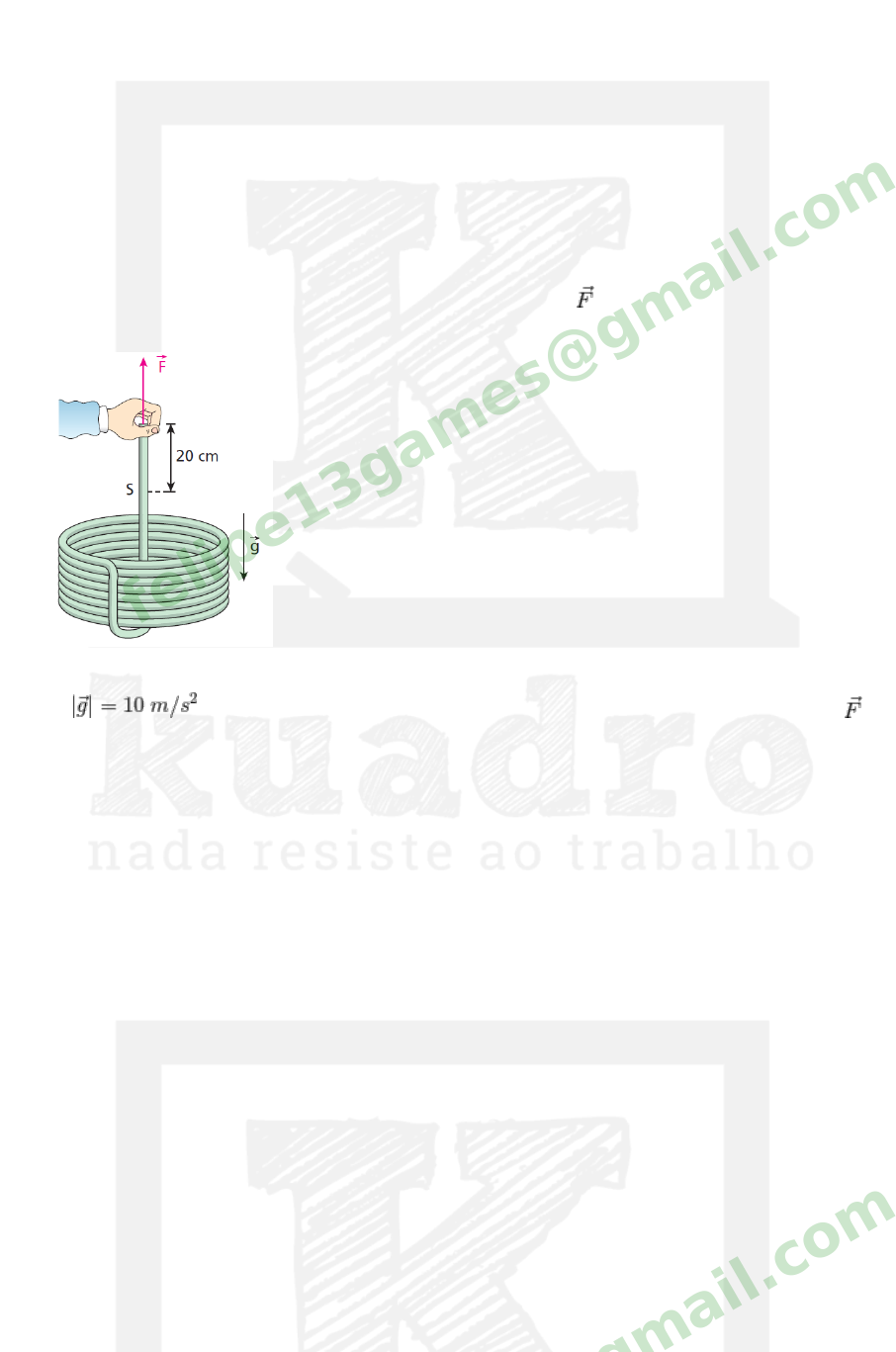 ITA18 - Física LF1B2-3 - Leis de Newton Questão 1 Depois de regar o jardim de sua casa, José Raimundo enrolou cuidadosamente os 10 m de mangueira flexível uti l izada na operação, deixando um arremate de 60 cm emergido do centro do rolo, conforme ilustra a figura. Querendo guardar o acessório em uma prateleira elevada, o rapaz puxou o rolo para cima, exercendo, por alguns instantes, uma força vertical de intensidade 30,0 N na extremidade do arremate. Sabendo que a densidade l inear da mangueira (massa por unidade de comprimento) é igual a 250 g/m e que , calcule, durante o breve intervalo de tempo de atuação da força , o módulo da aceleração adquirida pela mangueira e a intensidade da força de tração em uma seção S do arremate situada 20 cm abaixa da mão de José Raimundo. a) 2,5 m/s2 e 29,4 N; b) 2,0 m/s2 e 29,4 N; c) 2,0 m/s2 e 35,4 N; d) 2,5 m/s2 e 35,4 N; e) 1,5 m/s2 e 29,4 N. f) não sei. felipe13games@gmail.c om Questão 2 Na Máquina de Atwood da figura abaixo, o fio (inextensível) e a polia têm pesos desprezíveis, a influência do ar é insignificante e a aceleração da gravidade tem módulo g. As massas dos blocos A e B são, respectivamente, M e m, com M > m. felipe13games@gmail.c om Sendo a o módulo da aceleração dos blocos e D1 e D2 as indicações dos dinamômetros ideais (1) e (2), analise as proposições seguintes: I. aAB e jato (3) no trecho BC. c) Jatos (3) e (1) no trecho AB e jato (2) no trecho BC. d) Jatos (1) e (3) no trecho AB e jato (2) no trecho BC. e) Jatos (2) e (1) no trecho AB e jato (3) no trecho BC. f) não sei. felipe13games@gmail.c om Questão 11 Uma corda flexível, homogênea, de seção transversal constante e de comprimento igual a L será posta a deslizar no interior de uma canaleta perfeitamente l isa, inclinada de um ângulo θ = 30o em relação à horizontal, conforme representa a figura. Na situação, a influência do ar é desprezível e a aceleração da gravidade tem intensidade g = 10 m/s2. No instante em que o comprimento pendente na vertical for igual a , a intensidade da aceleração da corda: a) valerá 2,5 m/s2; b) valerá 5,0 m/s2; c) valerá 7,5 m/s2; d) valerá 10 m/s2; e) estará indeterminada, pois não foi dado o valor numérico de L. f) não sei. felipe13games@gmail.c om felipe13games@gmail.c om Questão 12 Na figura seguinte, a locomotiva interage com os tri lhos, recebendo deles uma força horizontal, dirigida para a direita e de intensidade 60 000 N. Essa força acelera os vagões A e B e a própria locomotiva, que parte do repouso no instante t0 = 0. No local do movimento, a estrada de ferro é plana, reta e horizontal. No instante t = 20 s, o vagão B desacopla-se da composição, o mesmo ocorrendo com o vagão A no instante t = 40 s. Avalie as afirmações abaixo I. O módulo da aceleração do trem no instante t = 10 s é 0.5 m/s2. II. A força de tração no engate entre a Locomotiva e o vagão A é de 60 kN III. A força de tração entre os vagões A e B é 90 kN É (são) verdadeira (s) a) I b) II c) III d) I e II e) II e III f) não sei felipe13games@gmail.c om Questão 13 Na figura seguinte, os pesos da polia, do fio e da mola são desprezíveis. No local, o efeito do ar é desprezível e assume-se g = 10 m/s2. felipe13games@gmail.c om Sendo mA = 40 kg e mB = 24 kg, a deformação da mola de 50 cm e a intensidade de igual a 720 N, avalie as afirmações abaixo: I. a constante elástica da mola é 720 N/m II. os módulos das acelerações de A, B e do eixo da polia são, respectivamente, 5 m/s2, 10 m/s2 e 2.5 m/s2 III. a indicação da balança sobre a qual repousam, inicialmente, os dois blocos é 40 N É (são) verdadeira(s) a) I b) II c) III d) I e III e) II e III f) não sei felipe13games@gmail.c om Questão 14 Na situação esquematizada na figura, o bloco A de massa m está apoiado sobre o prisma B de massa M. O bloco A deverá ser mantido em repouso em relação ao prisma B. Para tanto, uti l iza-se um fio ideal paralelo à face do prisma inclinada de um ângulo θ em relação à superfície de apoio do sistema, considerada plana e horizontal. Todos os atritos são desprezíveis e a aceleração da gravidade local tem módulo g. felipe13games@gmail.c om Aplica-se em B uma força constante horizontal e o sistema é acelerado para a esquerda. Admitindo que A não perde o contato com B, a máxima intensidade admissível para é: a) b) c) d) e) não sei felipe13games@gmail.c om Questão 15 No plano inclinado da figura, os corpos A e B , cujos pesos são de 200 N e 400 N , respectivamente, estão l igados por um fio que passa por uma polia l isa. O coeficiente de atrito entre os corpos e os planos é 0, 25 . Para que o movimento se torne iminente, deve ser aplicada ao corpo A uma força F de: a) b) c) d) felipe13games@gmail.c om e) ITA18 - Física LF1B2-3 - Leis de Newton