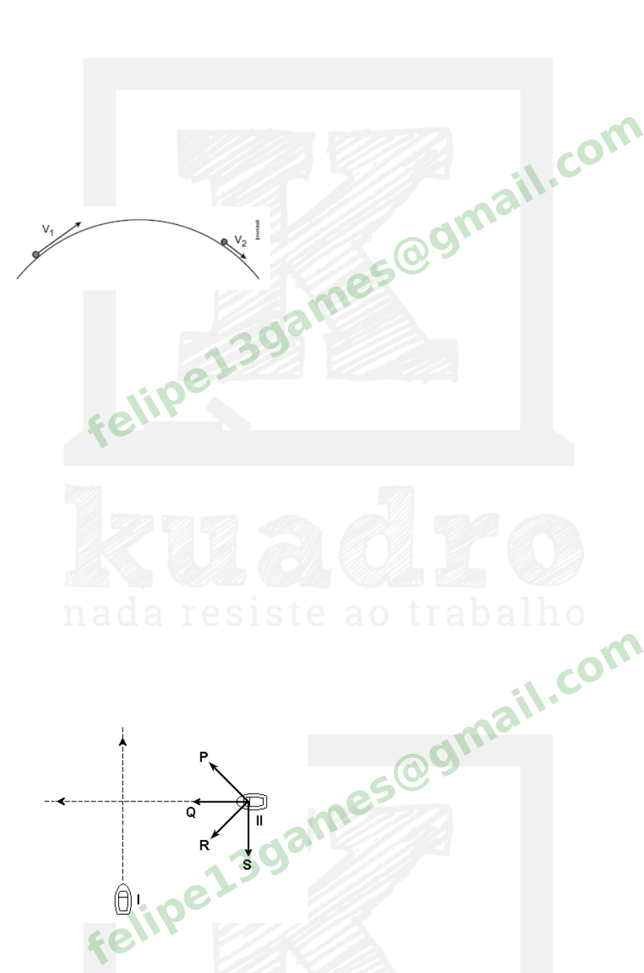 ITA18 - Física LF3A1-1 - Cinemática vetorial Questão 1 (Ufrgs 2012) A figura a seguir apresenta, em dois instantes, as velocidades v1 e v2 de um automóvel que, em um plano horizontal, se desloca numa pista circular. Com base nos dados da figura, e sabendo-se que os módulos dessas velocidades são tais que v1>v2 é correto afirmar que a) a componente centrípeta da aceleração é diferente de zero. b) a componente tangencial da aceleração apresenta a mesma direção e o mesmo sentido da velocidade. c) o movimento do automóvel é circular uniforme. d) o movimento do automóvel é uniformemente acelerado. e) os vetores velocidade e aceleração são perpendiculares entre si. f) não sei. felipe13games@gmail.c om Questão 2 (Ufmg 2007) Dois barcos - I e II - movem-se, em um lago, com velocidade constante, de mesmo módulo, como representado na figura: Em relação à água, a direção do movimento do barco I é perpendicular à do barco II e as linhas tracejadas indicam o sentido do deslocamento dos barcos.felipe13games@gmail.c om Considerando-se essas informações, é CORRETO afirmar que a velocidade do barco II, medida por uma pessoa que está no barco I, é mais bem representada pelo vetor a) P. b) Q. c) R. d) S. e) não sei. felipe13games@gmail.c om Questão 3 (Ufscar 2007) O submarino navegava com velocidade constante, nivelado a 150 m de profundidade, quando seu capitão decide levar lentamente a embarcação à tona, sem contudo abandonar o movimento à frente. Comunica a intenção ao timoneiro, que procede ao esvaziamento dos tanques de lastro, controlando-os de tal modo que a velocidade de subida da nave fosse constante. Se a velocidade horizontal antes da manobra era de 18,0 km/h e foi mantida, supondo que a subida tenha se dado com velocidade constante de 0,9 km/h, o deslocamento horizontal que a nave realizou, do momento em que o timoneiro iniciou a operação até o instante em que a nau chegou à superfície foi, em m, de a) 4 800. b) 3 000. c) 2 500. d) 1 600. e) 1 200. f) não sei. felipe13games@gmail.c om Questão 4 (Ufmg 2001) Um menino flutua em uma boia que está se movimentando, levada pela correnteza de um felipe13games@gmail.c om rio. Uma outra boia, que flutua no mesmo rio a uma certa distância do menino, também está descendo com a correnteza. A posição das duas boias e o sentido da correnteza estão indicados nesta figura: Considere que a velocidade da correnteza é a mesma em todos os pontos do rio. Nesse caso, para alcançar a segunda boia, o menino deve nadar na direção indicada pela l inha a) K. b) L. c) M. d) N. e) não sei. felipe13games@gmail.c om Questão 5 (Mackenzie 2001) Uma lancha, subindo um rio, percorre, em relação às margens, 2,34 km em 1 hora e 18 minutos. Ao descer o rio, percorre a mesma distância em 26 minutos. Observa-se que, tanto na subida como na descida, o módulo da velocidade da lancha em relação à água é o mesmo. O módulo da velocidade da correnteza, em relação às margens é: a) 5,4 km/h. b) 4,5 km/h. c) 3,6 km/h. d) 2,7 km/h. e) 1,8 km/h. f) não sei. felipe13games@gmail.c om Questão 6 (Unesp 2001) Nas provas dos 200 m rasos, no atletismo, os atletas partem de marcas localizadas em posições diferentes na parte curva da pista e não podem sair de suas raias até a l inha de chegada. felipe13games@gmail.c om Dessa forma, podemos afirmar que, durante a prova, para todos os atletas, o a) espaço percorrido é o mesmo, mas o deslocamento e a velocidade vetorial média são diferentes. b) espaço percorrido e o deslocamento são os mesmos, mas a velocidade vetorial média é diferente. c) deslocamento é o mesmo, mas o espaço percorrido e a velocidade vetorial média são diferentes. d) deslocamento e a velocidade vetorial média são iguais, mas o espaço percorrido é diferente. e) espaço percorrido, o deslocamento e a velocidade vetorial média são iguais. f) não sei. felipe13games@gmail.c om Questão 7 (Ufscar 2000) Nos esquemas estão representadas a velocidade e a aceleração do ponto material P. Assinale a alternativa em que o módulo da velocidade desse ponto material permanece constante. a) b) c) d) e) f) não sei. felipe13games@gmail.c om Questão 8 (Fatec 2003) felipe13games@gmail.c om http://www.codecogs.com/eqnedit.php?latex=%5Coverrightarrow%7BV%7D http://www.codecogs.com/eqnedit.php?latex=%5Coverrightarrow%7Ba%7D Num certo instante, estão representadas a aceleração e a velocidade vetoriais de uma partícula. Os módulos dessas grandezas estão também indicados na figura. Dados: sen 60° = 0,87 cos 60° = 0,50 No instante considerado, o módulo da aceleração escalar, em m/s2, e o raio de curvatura, em metros, são, respectivamente, a) 3,5 e 25. b) 2,0 e 2,8. c) 4,0 e 36. d) 2,0 e 29. e) 4,0 e 58. f) não sei. felipe13games@gmail.c om Questão 9 Na figura, estão representadas as velocidades vetoriais v1 e v2 de uma bola de sinuca, imediatamente antes e imediatamente depois de uma colisão contra uma das bordas da mesa. Sabendo que v1 e v2 têm intensidades iguais a v, aponte a alternativa que melhor caracteriza a intensidade, a direção e o sentido da variação da velocidade vetorial da bola no ato da colisão: felipe13games@gmail.c om a) b) c) d) e) Vetor nulo f) Não sei felipe13games@gmail.c om Questão 10 Analise as proposições a seguir: (01) A velocidade vetorial média entre dois pontos de uma trajetória tem sempre a mesma direção e o mesmo sentido do deslocamento vetorial entre esses pontos. (02) A velocidade vetorial é, em cada instante, tangente à trajetória e orientada no sentido do movimento. (04) Nos movimentos uniformes, a velocidade vetorial é constante. (08) Nos movimentos reti l íneos, a velocidade vetorial é constante. (16) A velocidade vetorial de uma partícula só é constante nas situações de repouso e de movimento reti l íneo e uniforme. Dê como resposta a soma dos números associados às proposições corretas. a) 03 b) 06 c) 10 d) 19 e) 20 felip