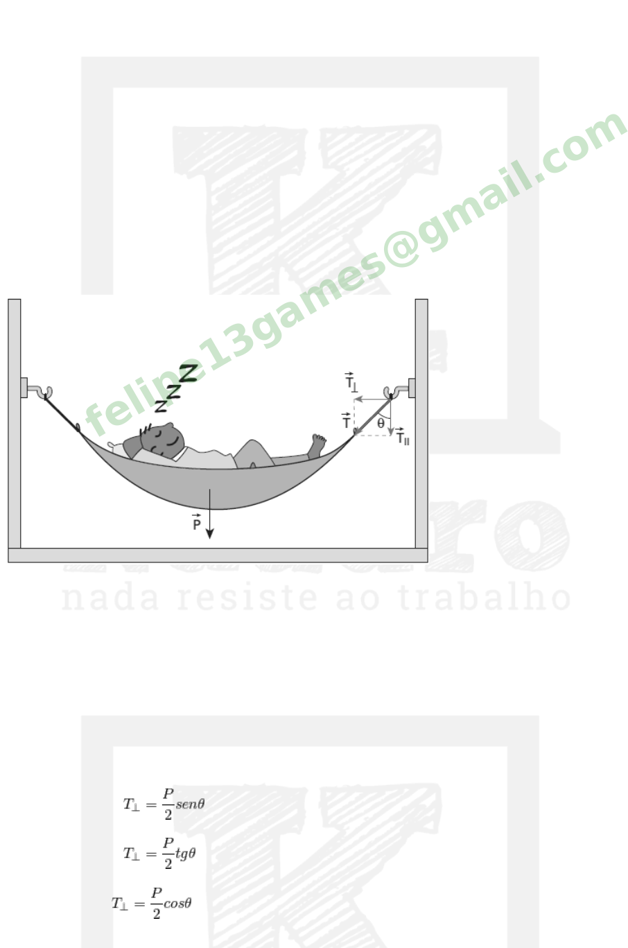 ITA18 - Física LF5A1-1 - Estática Questão 1 (UFRN) O lendário Macunaíma, personagem criado por Mário de Andrade, costuma desfrutar do aconchego de sua “redinha”. Ávido por um descanso, Macunaíma, nosso anti-herói, está sempre improvisando um gancho para armar sua rede. Ele soube que sua segurança ao deitar-se na rede está relacionada com o ângulo θ, de inclinação dos punhos da rede com a parede e que essa inclinação pode ser mudada alterando-se o tamanho dos punhos, por exemplo, com auxíl io de cordas. A figura abaixo i lustra um desses momentos de descanso da personagem. Nessa figura, a força T , exercida pela corda da rede sobre o gancho do armador, preso na parede, aparece decomposta em componentes, TII (paralela à parede) e TI (perpendicular à parede). Considere-se que: I. o peso, P , de Macunaíma está bem distribuído e o centro de gravidade do conjunto está no meio da rede; II. as massas da rede e da corda são desprezíveis; III. o armador pode ser arrancado somente em decorrência de um maior valor da componente TI da força T . Podemos afirmar que, para uma maior segurança, Macunaíma deve escolher uma inclinação θ relativamente: a) pequena, pois ; b) pequena, pois c) grande, pois ; felipe13games@gmail.c om d) grande, pois . e) Não sei. Questão 2 A figura abaixo representa um quadro retangular e homogêneo dependurado em uma parede e em equil íbrio. Qual das retas, a, b, c ou d, melhor representa a l inha de ação da força que a parede exerce no quadro? a) a b) b c) c d) d e) não sei felipe13games@gmail.c om Questão 3 A figura representa um paralelepípedo homogêneo em repouso num plano inclinado. M é o ponto médio do segmento PQ. A força normal resultante que o paralelepípedo recebe do plano está aplicada: felipe13games@gmail.c om a) No ponto M b) No ponto Q c) Entre os pontos P e M d) Entre os pontos M e Q e) Talvez no ponto P f) não sei felipe13games@gmail.c om Questão 4 Uma bolinha de aço, de peso P, encontra-se em repouso presa em um fio suposto ideal, de comprimento L, e apoiada em um hemisfério fixo de raio R, praticamente sem atrito. Sendo d a distância do polo do hemisfério ao ponto de suspensão do fio, determine a intensidade da força de tração exercida pelo fio em função de P, L, d e R. a) PL/R b) PL/d c) PL/(d + R) felipe13games@gmail.c om d) e) não sei f) Questão 5 (Mack-SP) Uma tábua rígida é colocada sobre um cil indro fixo, ficando em equil íbrio e na iminência de escorregar, como mostra a figura. Determine o coeficiente de atrito estático entre a tábua e o cil indro: a) sen 30° b) sen 60° c) tg 30° d) tg 60º e) sec 30° f) não sei felipe13games@gmail.c om Questão 6 Na figura abaixo, temos um cano metálico horizontal e duas argolas leves, A e B, nas quais está amarrado um fio considerado ideal, de 1,20 m de comprimento. Desse fio, está suspenso, em equil íbrio, um corpo C de massa 10 kg por meio de uma pequena polia também considerada ideal. felipe13games@gmail.c om Determine a máxima distância d permitida entre as argolas para que o sistema permaneça em equil íbrio, sendo 0,75 o coeficiente de atrito estático entre cada argola e o cano. a) 36 cm b) 45 cm c) 60 cm d) 72 cm e) 90 cm f) não sei felipe13games@gmail.c om Questão 7 Uma barra ci l índrica e homogênea, de comprimento igual a 300 cm, encontra-se em equil íbrio sustentada por uma corda de comprimento igual a 400 cm e apoiada em uma parede vertical praticamente sem atrito, como representa a figura. Determine a distância x entre o ponto da parede onde a corda está amarrada e o ponto da parede onde a barra se apoia. a) 132 cm b) 153 cm felipe13games@gmail.c om c) 161 cm d) 172 cm e) 185 cm f) não sei Questão 8 (Aman-RJ) Veja a figura seguinte. A tração máxima que a corda superior pode suportar é de 400√2 N e a compressão máxima que a escora pode aguentar é de 600√2 N. A corda vertical é suficientemente resistente para tolerar qualquer peso envolvido no problema. O maior peso de um corpo em repouso que pode ser sustentado pela estrutura da figura, considerando desprezível o peso da escora, é: a) 800 N b) 1000 N c) 200 N d) 600 N e) 400 N f) não sei felipe13games@gmail.c om Questão 9 felipe13games@gmail.c om (IME 2012) A figura acima mostra um corpo cúbico de 50 cm de aresta suspenso por dois cabos AB e AC em equil íbrio. Sabe-se que o peso específico volumétrico do material do corpo cúbico, a rigidez da mola do cabo AC e o comprimento do cabo AC antes da colocação do corpo cúbico são iguais a 22,4 kN/m³ , 10,0 kN/m e 0,5 m. O valor do comprimento do cabo AB, em metros, após a colocação do corpo cúbico é: Adote: √3 = 1,73 e √2 = 1,41. a) 1,0 b) 1,5 c) 2,0 d) 2,5 e) 3,0 f) não sei felipe13games@gmail.c om Questão 10 (ITA 2004) Um atleta mantém-se suspenso em equil íbrio, forçando as mãos contra duas paredes verticais, perpendiculares entre si, dispondo seu corpo simetricamente em relação ao canto e mantendo seus braços horizontalmente alinhados, como mostra a figura. Sendo m a massa do corpo do atleta e μ o coeficiente de atrito estático interveniente, assinale a opção correta que indica o módulo mínimo da força exercida pelo atleta em cada parede. felipe13games@gmail.c om a) b) c) d) e) n.d.a. f) não sei felipe13games@gmail.c om Questão 11 (IME 2014) A figura acima mostra uma viga em equil íbrio. Essa viga mede 4 m e seu peso é desprezível. Sobre ela, há duas cargas concentradas, sendo uma fixa e outra variável. A carga fixa de 20 kN está posicionada a 1 m do apoio A , enquanto a carga variável só pode se posicionar entre a carga fixa e o apoio B. Para que as reações verticais (de baixo para cima) dos apoios A e B sejam iguais a 25 kN e 35 kN, respectivamente, a posição da carga variável, em relação ao apoio B, e o seu módulo devemfelipe13games@gmail.c om ser: a) 1,0 m e 50 kN b) 1,0 m e 40 kN c) 1,5 m e 40 kN d) 1,5 m e 50 kN e) 2,0 m e 40 kN f) não 