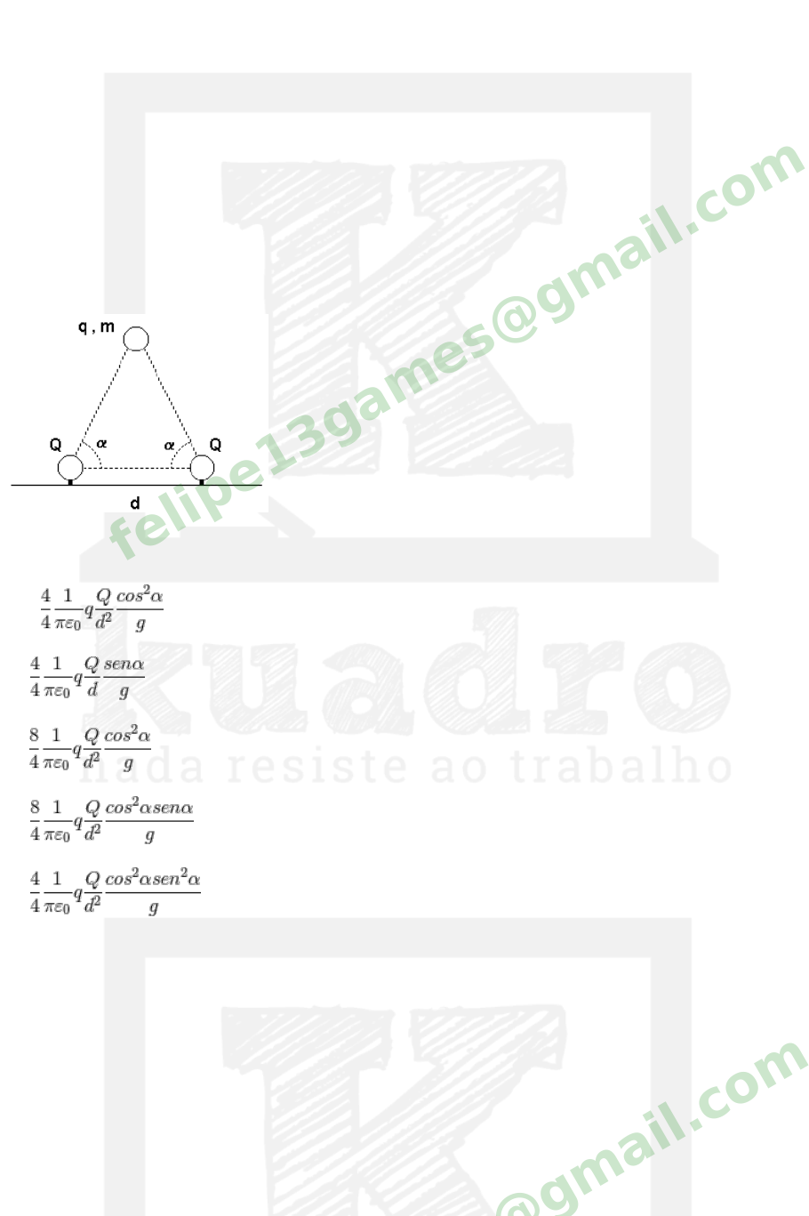 ITA18 - Física LF2D1-2 - Campo elétrico Questão 1 (Ita 1997) Uma pequena esfera de massa m e carga q, sob a influência da gravidade e da interação eletrostática, encontra-se suspensa por duas cargas Q fixas, colocadas a uma distância d no plano horizontal, como mostrado na figura. Considere que a esfera e as duas cargas fixas estejam no mesmo plano vertical, e que sejam iguais a á os respectivos ângulos entre a horizontal e cada reta passando pelos centros das cargas fixas e da esfera. A massa da esfera é então: a) b) c) d) e) f) não sei. felipe13games@gmail.c om Questão 2 (Ita 1999) Uma carga puntual P é mostrada na figura adiante com duas superfícies gaussianas A e B, de raios a e b=2a, respectivamente. Sobre o fluxo elétrico que passa pelas superfícies de áreas A e B, pode-se concluir que: felipe13games@gmail.c om a) o fluxo elétrico que atravessa a área B é duas, vezes maior que o fluxo que passa pela área A. b) o fluxo elétrico que atravessa a área B é a metade do fluxo que passa pela área A. c) o fluxo elétrico que atravessa a área B é do fluxo que passa pela área A. d) o fluxo elétrico que atravessa a área B é quatro vezes maior que o fluxo que passa pela área A. e) o fluxo elétrico que atravessa a área B é igual ao fluxo que atravessa a área A. f) não sei. felipe13games@gmail.c om Questão 3 (Ita 1999) Uma esfera homogênea de carga q e massa m de 2 g está suspensa por um fio de massa desprezível em um campo elétrico cujas componentes x e y têm intensidades Ex= × 105 N/C e Ey = 1 × 105 N/C, respectivamente, como mostra a figura a seguir. Considerando que a esfera está em equil íbrio para θ = 60°, qual é a força de tração no fio? a) 9,80 × 10-3 N. b) 1,96 × 10-2 N. c) nula. d) 1,70 × 10-3 N. e) 7,17 × 10-3 N. felipe13games@gmail.c om f) não sei. Questão 4 (Ita 1999) No instante t = 0s, um elétron é projetado em um ângulo de 30° em relação ao eixo x, com velocidade v0 de 4×105m/s, conforme o esquema a seguir. Considerando que o elétron se move num campo elétrico constante E=100N/C, o tempo que o elétron levará para cruzar novamente o eixo x é de: Dados: e: 1,6 · 10-19C; me: 9,1 · 10–31kg a) 10 ns. b) 15 ns. c) 23 ns. d) 12 ns. e) 18 ns. f) não sei. felipe13games@gmail.c om Questão 5 (Ita 2005) Em uma impressora a jato de tinta, gotas de certo tamanho são ejetadas de um pulverizador em movimento, passam por uma unidade eletrostática onde perdem alguns elétrons, adquirindo uma carga q, e, a seguir, se deslocam no espaço entre placas planas paralelas eletricamente carregadas, pouco antes da impressão. Considere gotas de raio igual a 10 µm lançadas com velocidade de módulo v = 20 m/s entre placas de comprimento igual a 2,0 cm, no interior das quais existe um campo elétrico vertical uniforme, cujo módulo é E=8,0x104N/C (veja figura). Considerando que a densidade da gota seja de 1000 kg/m3 e sabendo-se que a mesma sofre um desvio de 0,30 mm ao atingir o final do percurso, o módulo da sua carga elétrica é de felipe13games@gmail.c om a) 2,0 x 10-14 C. b) 3,1 x 10-14 C. c) 6,3 x 10-14 C. d) 3,1 x 10-11 C. e) 1,1 x 10-10 C. f) não sei. felipe13games@gmail.c om Questão 6 (ITA-SP) Em uma região onde existe um campo elétrico uniforme E = 1,0x102 N/C, dirigido verticalmente para cima, penetra um elétron com velocidade inicial vo = 4,0x105 m/s, segundo uma direção que faz um ângulo de 30º com a horizontal, como mostra a figura. Sendo a massa do elétron 9,1x10-31kg e a carga -1,6x10-19C, podemos afirmar que a) O tempo de subida do elétron será 1,14x10-8s b) o alcance horizontal do elétron será 5,0x10-1m c) a aceleração do elétron será 2,0 m/s2 felipe13games@gmail.c om d) o elétron será acelerado continuamente para cima, até escapar do campo elétrico e) o ponto mais elevado alcançado pelo elétron será 5,0x10-1m f) não sei Questão 7 (ITA-SP) A figura mostra uma carga positiva q puntiforme próxima de uma barra de metal. O campo elétrico nas vizinhanças da carga puntiforme e da barra está representado pelas l inhas de campo mostradas na figura. Sobre o módulo da carga da barra |Qbar|, comparativamente ao módulo da carga puntiforme positiva | q |, e sobre a carga l íquida da barra Qbar, respectivamente, pode-se concluir que: a) |Qbar| > |q| e Qbar > 0. b) |Qbar| |q| e Qbar 0. f) Não sei. felipe13games@gmail.c om Questão 8 (Fuvest 2009) Uma barra isolante possui quatro encaixes, nos quais são colocadas cargas elétricas de mesmo módulo, sendo as positivas nos encaixes claros e as negativas nos encaixes escuros. A certa distância da barra, a direção do campo elétrico está indicada na figura 1. Uma armação foi construída com quatro dessas barras, formando um quadrado, como representado na figura 2. Se uma carga positiva for colocada no centro P da armação, a força elétrica que agirá sobre a carga terá sua direção e sentido indicados por: Desconsidere eventuais efeitos de cargas induzidas. felipe13games@gmail.c om a) b) c) d) e) f) não sei. felipe13games@gmail.c om Questão 9 (Fuvest 2006) Um pequeno objeto, com carga elétrica positiva, é largado da parte superior de um plano inclinado, no ponto A, e desliza, sem ser desviado, até atingir o ponto P. Sobre o plano, estão fixados 4 pequenos discos com cargas elétricas de mesmo módulo. As figuras representam os discos e os sinais das cargas, vendo-se o plano de cima. Das configurações a seguir, a única compatível com a trajetória reti l ínea do objeto é a) b) felipe13games@gmail.c om c) d) e) f) não sei. felipe13games@gmail.c om Questão 10 (Fuvest 1995) O campo elétrico de uma carga puntiforme em repouso tem, nos pontos A e B, as direções e sentidos indicados pelas flechas na figura a seguir. O módulo do campo elétrico no ponto B vale 24 O módulo do campo elétrico no ponto P da figura vale, em volt por metro: a) 3. b) 4. c) d) 6. e) 12. f) não sei. felipe13games@gmail.c om felipe13games@gmail