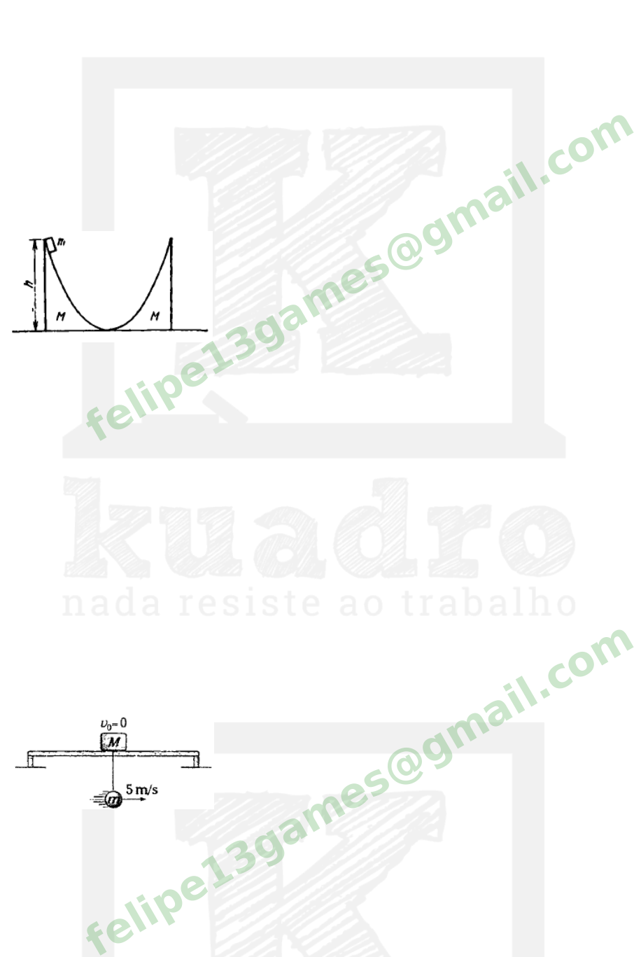 ITA18 - Física LF5B1-3 - Impulso e quantidade de movimento Questão 1 Dois blocos de superfície inclinada de massa M são dispostos como na figura abaixo. No bloco da esquerda, é largada do repouso uma pequena carga de massa m a partir de uma altura h. Despreze todos os atritos. Qual altura máxima a carga alcançará quando estiver em contato com o bloco da direita? a) hm/M b) hm/(m+2M) c) hm²/M² d) hM²/(m+M)² e) hm²/(m+2M)² f) não sei felipe13games@gmail.c om Questão 2 Na figura mostrada, desprezando-se as forças de atrito, qual a velocidade do bloco quando a esfera alcança sua altura máxima? Sabe-se que M = 4m = 80 g. a) 1 m/s b) 2 m/s c) 3 m/s felipe13games@gmail.c om d) 4 m/s e) 1,5 m/s f) não sei felipe13games@gmail.c om Questão 3 (Ita 1998) Uma massa m em repouso divide-se em duas partes, uma com massa 2m/3 e outra com massa m/3. Após a divisão, a parte com massa m/3 move-se para a direita com uma velocidade de módulo v1. Se a massa m estivesse se movendo para a esquerda com velocidade de módulo v antes da divisão, a velocidade da parte m/3 depois da divisão seria: a) (1/3 v1 - v) para a esquerda. b) (v1 - v) para a esquerda. c) (v1 - v) para a direita. d) (1/3 v1 - v) para a direita. e) (v1 + v) para a direita. f) não sei felipe13games@gmail.c om Questão 4 (ITA 2000) Uma lâmina de material muito leve de massa m está em repouso sobre uma superfície sem atrito. A extremidade esquerda da lâmina está a 1 cm de uma parede. Uma formiga considerada como um ponto, de massa m/5, está inicialmente em repouso sobre essa extremidade, como mostra a figura. A seguir, a formiga caminha para frente muito lentamente, sobre a lâmina. A que distância d da parede estará a formiga no momento em que a lâmina tocar a parede? a) 2 cm b) 3 cm c) 4 cm d) 5 cm e) 6 cm felipe13games@gmail.c om f) não sei Questão 5 (ITA 2000) Deixa-se cair continuamente areia de um reservatório a uma taxa de 3,0 kg/s diretamente sobre uma esteira que se move na direção horizontal com velocidade V . Considere que a camada de areia depositada sobre a esteira se locomove com a mesma velocidade V , devido ao atrito. Desprezando a existência de quaisquer outros atritos, conclui-se que a potência em watts, requerida para manter a esteira movendo-se a 4,0 m/s, é: a) 0 b) 3 c) 12 d) 24 e) 48 f) não sei felipe13games@gmail.c om Questão 6 (ITA 2005) Um vagão-caçamba de massa M se desprende da locomotiva e corre sobre tri lhos horizontais com velocidade constante v = 72,0 km/h (portanto, sem resistência de qualquer espécie ao movimento). Em dado instante, a caçamba é preenchida com uma carga de grãos de massa igual a 4M, despejada verticalmente a partir do repouso de uma altura de 6,00 m (veja figura). Supondo que toda a energia l iberada no processo seja integralmente convertida em calor para o aquecimento exclusivo dos grãos, então, a quantidade de calor por unidade de massa recebido pelos grãos é: felipe13games@gmail.c om a) 15 J/kg b) 80 J/kg c) 100 J/kg d) 463 J/kg e) 578 J/kg f) não sei felipe13games@gmail.c om Questão 7 (IME 2010) Um soldado em pé sobre um lago congelado (sem atrito) atira horizontalmente com uma bazuca. A massa total do soldado e da bazuca é 100 kg e a massa do projéti l é 1 kg. Considerando que a bazuca seja uma máquina térmica com rendimento de 5% e que o calor fornecido a ela no instante do disparo é 100 kJ, a velocidade de recuo do soldado é, em m/s: a) 0,1 b) 0,5 c) 1 d) 10 e) 100 f) não sei felipe13games@gmail.c om Questão 8 (IME 2014) Dois corpos iguais deslizam na mesma direção e em sentidos opostos em um movimento reti l íneo uniforme, ambos na mesma velocidade em módulo e à mesma temperatura. Em seguida, os corpos colidem. A colisão é perfeitamente inelástica, toda energia l iberada no choque sendo util izada para aumentar a temperatura dos corpos em 2K. Diante do exposto, o módulo da velocidade inicial do corpo, em m/s, é: Dado: Calor específico dos corpos: c = 2 J/kg.K a) b) 2 c) d) 4 felipe13games@gmail.c om e) 6 f) não sei felipe13games@gmail.c om Questão 9 (Esc. Naval 2015) Analise a figura abaixo A figura acima mostra o gráfico das energias cinéticas de dois carrinhos, A e B respectivamente, que deslizam sem atrito ao longo de um tri lho horizontal reti l íneo. No instante t = 3s ocorre uma colisão entre os carrinhos. Sendo assim, assinale a opção que pode representar um gráfico para as velocidades dos carrinhos antes e depois da colisão. a) b) c) felipe13games@gmail.c om d) e) f) Não sei Questão 10 (Ufrgs 2010) Um cubo de massa específica ρ1 desliza com velocidade de módulo v0 sobre uma mesa horizontal, sem atrito, em direção a um segundo cubo de iguais dimensões, inicialmente em repouso. Após a colisão frontal, os cubos se movem juntos sobre a mesa, ainda sem atrito, com velocidade de módulo vf = 3v0/4. Com base nessas informações, é correto afirmar que a massa específica do segundo cubo é igual a a) 4ρ1/3 b) 9ρ1/7 c) 7ρ1/9 d) 3ρ1/4 e) ρ1/3 f) Não sei felipe13games@gmail.c om Questão 11 (Ita 2012) Apoiado sobre patins numa superfície horizontal sem atrito, um atirador dispara um projéti l de massa m com velocidade v contra um alvo a uma distância d. Antes do disparo, a massa total do atirador e seus equipamentos é M. Sendo vs a velocidade do som no ar e desprezando a perda de energia em todo o processo, quanto tempo após o disparo o atirador ouviria o ruído do impacto do projéti l no alvo? felipe13games@gmail.c om a) b) c) d) e) felipe13games@gmail.c om Questão 12 (Ita 2008) Na figura, um gato de massa m encontra-se parado próximo a uma das extremidades de uma prancha de massa M que flutua em repouso na superfície de um lago. A seguir, o gato salta e alcança uma nova posição na prancha, à distância L. Desprezando o atrito entre a água e a prancha, sendo è o ângulo entre a velocidade inicial do gato e a horizontal, e g a aceleração da gravidade, indique qual deve se