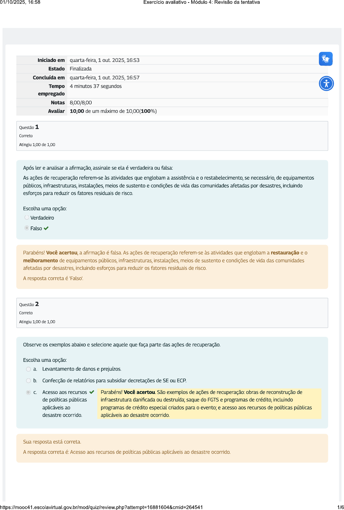 01/10/2025, 16:58 Exercício avaliativo Módulo 4: Revisão da tentativa Iniciado em quarta-feira, 1 out. 2025, 16:53 Estado Finalizada Concluída em quarta-feira, 1 out. 2025, 16:57 Tempo 4 minutos 37 segundos empregado Notas 8,00/8,00 Avaliar 10,00 de um máximo de 10,00(100%) Questão 1 Correto Atingiu 1,00 de 1,00 Após ler e analisar a afirmação, assinale se ela é verdadeira ou falsa: As ações de recuperação referem-se às atividades que englobam a assistência e restabelecimento, se necessário, de equipamentos públicos, infraestruturas, instalações, meios de sustento e condições de vida das comunidades afetadas por desastres, incluindo esforços para reduzir os fatores residuais de risco. Escolha uma opção: Verdadeiro Falso Parabéns! Você acertou, a afirmação é falsa. As ações de recuperação referem-se às atividades que englobam a restauração e melhoramento de equipamentos públicos, infraestruturas, instalações, meios de sustento e condições de vida das comunidades afetadas por desastres, incluindo esforços para reduzir fatores residuais de risco. A resposta correta é 'Falso'. Questão 2 Correto Atingiu 1,00 de 1,00 Observe exemplos abaixo e selecione aquele que faça parte das ações de recuperação. Escolha uma opção: a. Levantamento de danos e prejuízos. b. Confecção de relatórios para subsidiar decretações de SE ou ECP. Acesso aos recursos Parabéns! Você acertou. São exemplos de ações de recuperação: obras de reconstrução de de políticas públicas infraestrutura danificada ou destruída; saque do FGTS e programas de crédito, incluindo aplicáveis ao programas de crédito especial criados para evento; e acesso aos recursos de políticas públicas desastre ocorrido. aplicáveis ao desastre ocorrido. Sua resposta está correta. A resposta correta é: Acesso aos recursos de políticas públicas aplicáveis ao desastre ocorrido. 1/601/10/2025, 16:58 Exercício avaliativo Módulo 4: Revisão da tentativa Questão Correto Atingiu 1,00 de 1,00 Preencha as lacunas do texto com termos que estão soltos. As ações que incluem obras de reconstrução são definidas como "medidas desenvolvidas após desastre para retornar à situação de normalidade que abrangem a reconstrução de infraestrutura danificada ou destruída anormalidade localidade resposta mitigação planejada recuperação restaurada Sua resposta está correta. A escrita correta da frase é: As ações que incluem obras de reconstrução são definidas como "medidas desenvolvidas após desastre para retornar à situação de normalidade, que abrangem a reconstrução de infraestrutura danificada ou destruída". A resposta correta é: Preencha as lacunas do texto com termos que estão soltos. As ações que incluem obras de [reconstrução] são definidas como "medidas desenvolvidas após desastre para retornar à situação de [normalidade], que abrangem a reconstrução de infraestrutura [danificada] ou [destruída]". 2/601/10/2025, 16:58 Exercício avaliativo Módulo 4: Revisão da tentativa Questão 4 Correto Atingiu 1,00 de 1,00 É muito importante saber as diferenças entre as obras de reconstrução e de restabelecimento. Por isso, relacione as colunas indicando conteúdo que se refere a cada uma delas. (1) Obras de restabelecimento (2) Obras de reconstrução 1 = Viabilização de trafegabilidade em vias e construção de acessos alternativos. São obras que possuem caráter de urgência com vistas a restabelecer serviços essenciais e, conforme contexto, 1 = podem ter caráter transitório. 2 = Reconstrução de estruturas públicas como ginásios, prédios públicos, entre outras. 1 = Em geral, são projetos simples (de pequeno porte) e de execução rápida. 2 São obras de caráter definitivo e necessitam de projetos destinados a recuperar cenário destruído pelo desastre. Sua resposta está correta. As OBRAS DE possuem caráter de urgência com vistas a restabelecer serviços essenciais e, conforme contexto, podem ter caráter transitório; em geral, são projetos simples (de pequeno porte) e de execução rápida, a exemplo da viabilização de trafegabilidade em vias e da construção de acessos alternativos. Já as OBRAS DE RECONSTRUÇÃO são obras de caráter definitivo e necessitam de projetos destinados a recuperar 0 cenário destruído pelo desastre, a exemplo da reconstrução de estruturas públicas como ginásios, prédios públicos, entre outras. A resposta correta é: Viabilização de trafegabilidade em vias e construção de acessos alternativos. 1, São obras que possuem caráter de urgência com vistas a restabelecer serviços essenciais e, conforme 0 contexto, podem ter caráter transitório. 1, Reconstrução de estruturas públicas como ginásios, prédios públicos, entre outras. 2, Em geral, são projetos simples (de pequeno porte) e de execução rápida. 1, São obras de caráter definitivo e necessitam de projetos destinados a recuperar cenário destruído pelo desastre. 2. 3/601/10/2025, 16:58 Exercício avaliativo Módulo 4: Revisão da tentativa Questão 5 Correto Atingiu 1,00 de 1,00 As obras de reconstrução têm propósito de resolver por definitivo a destruição e danos de infraestrutura gerados pela ocorrência de um desastre, sendo uma ótima oportunidade para aplicação do princípio: Escolha uma opção: a. "compreensão do risco de desastres". b. "fortalecimento da governança do risco de desastres" para gerenciar risco de desastres. "reconstruir melhor" ao Parabéns! Você acertou. As obras de reconstrução têm propósito de resolver por planejar obras que não apenas definitivo a destruição e danos de infraestrutura gerados pela ocorrência de um resolvam os estragos gerados desastre, sendo uma ótima oportunidade para aplicação do princípio "reconstruir pelo desastre, mas que melhor" ao planejar obras que não apenas resolvam os estragos gerados pelo desastre, resistam a possíveis mas que resistam a possí