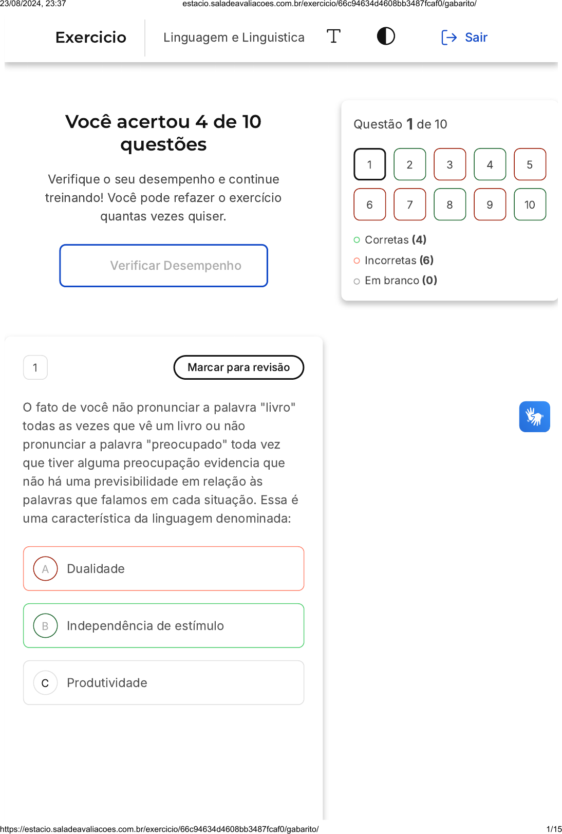 Você acertou 4 de 10 questões Verifique o seu desempenho e continue treinando! Você pode refazer o exercício quantas vezes quiser. Verificar Desempenho A B C 1 Marcar para revisão O fato de você não pronunciar a palavra "livro" todas as vezes que vê um livro ou não pronunciar a palavra "preocupado" toda vez que tiver alguma preocupação evidencia que não há uma previsibilidade em relação às palavras que falamos em cada situação. Essa é uma característica da linguagem denominada: Dualidade Independência de estímulo Produtividade Questão 1 de 10 Corretas �4� Incorretas �6� Em branco �0� 1 2 3 4 5 6 7 8 9 10 Exercicio Linguagem e Linguistica Sair 23/08/2024, 23:37 estacio.saladeavaliacoes.com.br/exercicio/66c94634d4608bb3487fcaf0/gabarito/ https://estacio.saladeavaliacoes.com.br/exercicio/66c94634d4608bb3487fcaf0/gabarito/ 1/15 D E Dupla articulação Arbitrariedade Resposta incorreta Opa! A alternativa correta é a letra B. Confira o gabarito comentado! Gabarito Comentado A característica da linguagem que permite que não haja uma previsibilidade em relação às palavras que falamos em cada situação é chamada de "Independência de estímulo". Isso significa que não há uma relação direta e obrigatória entre o estímulo (por exemplo, ver um livro ou sentir preocupação) e a resposta verbal (pronunciar as palavras "livro" ou "preocupado"). A linguagem permite uma grande flexibilidade e variação nas respostas verbais a um mesmo estímulo. 2 Marcar para revisão Na Linguística, o trabalho do linguista deve ser corretamente identificado com: 23/08/2024, 23:37 estacio.saladeavaliacoes.com.br/exercicio/66c94634d4608bb3487fcaf0/gabarito/ https://estacio.saladeavaliacoes.com.br/exercicio/66c94634d4608bb3487fcaf0/gabarito/ 2/15 A B C D E A elaboração de uma gramática normativa ou prescritiva a fim de estabelecer a correção gramatical. O estabelecimento de métodos históricos e comparativistas para a descoberta da etimologia das palavras. A definição de quais línguas são superiores e quais são inferiores. Intuições e percepções subjetivas sobre a linguagem a fim de relacioná- las com uma teoria filosófica. O estabelecimento de teoria linguística e criação de métodos rigorosos para a descrição das línguas. Resposta correta Parabéns, você selecionou a alternativa correta. Confira o gabarito comentado! Gabarito Comentado O trabalho de um linguista não se limita à elaboração de uma gramática normativa ou prescritiva, nem ao estabelecimento de métodos históricos e comparativistas para a descoberta da etimologia das palavras. Também não envolve a definição de quais línguas são superiores e quais são inferiores, nem se baseia em intuições e percepções subjetivas sobre a linguagem para relacioná-las com uma teoria filosófica. O papel de um linguista é, na 23/08/2024, 23:37 estacio.saladeavaliacoes.com.br/exercicio/66c94634d4608bb3487fcaf0/gabarito/ https://estacio.saladeavaliacoes.com.br/exercicio/66c94634d4608bb3487fcaf0/gabarito/ 3/15 A B C D E verdade, estabelecer uma teoria linguística e criar métodos rigorosos para a descrição das línguas. Portanto, a alternativa correta é a E� "O estabelecimento de teoria linguística e criação de métodos rigorosos para a descrição das línguas". 3 Marcar para revisão Os estudos sobre a linguagem no século XIX devem ser corretamente identificados com: O desinteresse pela mudança das línguas e a descoberta de sua história. A linguística histórica e a gramática comparada. A inexistência de uma linguagem própria para tratar exatamente da linguagem. A ausência símbolos e de desenvolvimento de recursos para descrição de uma língua. O fortalecimento da linguística moderna e do caráter científico do estudo da linguagem. Resposta incorreta Opa! A alternativa correta é a letra B. Confira o gabarito comentado! 23/08/2024, 23:37 estacio.saladeavaliacoes.com.br/exercicio/66c94634d4608bb3487fcaf0/gabarito/ https://estacio.saladeavaliacoes.com.br/exercicio/66c94634d4608bb3487fcaf0/gabarito/ 4/15 A B C Gabarito Comentado Os estudos sobre a linguagem no século XIX foram marcados pelo surgimento da linguística histórica e da gramática comparada, que se preocuparam com a mudança das línguas e com a descoberta de sua história. 4 Marcar para revisão Considere as seguintes afirmações sobre a dualidade ou dupla articulação da língua. I � A dupla articulação ou dualidade acontece porque as unidades mínimas se combinam ou se articulam em dois níveis: o dos morfemas e o dos fonemas. II � A língua é articulada porque as sentenças são o resultado da união de elementos menores. III � A primeira articulação refere-se às combinações dos sons da língua e não possuem significação ou sentido gramatical. IV � A segunda articulação refere-se às relações combinatórias dos fonemas e tem apenas função distintiva. Estão corretas somente as afirmativas: I e III. I e IV. I, II e III. 23/08/2024, 23:37 estacio.saladeavaliacoes.com.br/exercicio/66c94634d4608bb3487fcaf0/gabarito/ https://estacio.saladeavaliacoes.com.br/exercicio/66c94634d4608bb3487fcaf0/gabarito/ 5/15 D E I, II e IV. I, III e IV. Resposta correta Parabéns, você selecionou a alternativa correta. Confira o gabarito comentado! Gabarito Comentado A resposta correta é: I, II e IV. A afirmação I é correta porque a dupla articulação ou dualidade acontece porque as unidades mínimas se combinam ou se articulam em dois níveis: o dos morfemas e o dos fonemas. A afirmação II é correta porque a língua é articulada porque as sentenças são o resultado da união de elementos menores. A afirmação III é correta porque a primeira articulação refere-se às combinações dos sons da língua e não possuem significação ou sentido gramatical. A afirmação IV é correta porque a segunda articulação refere-se às relações combinatórias dos fonemas e tem apenas função 
