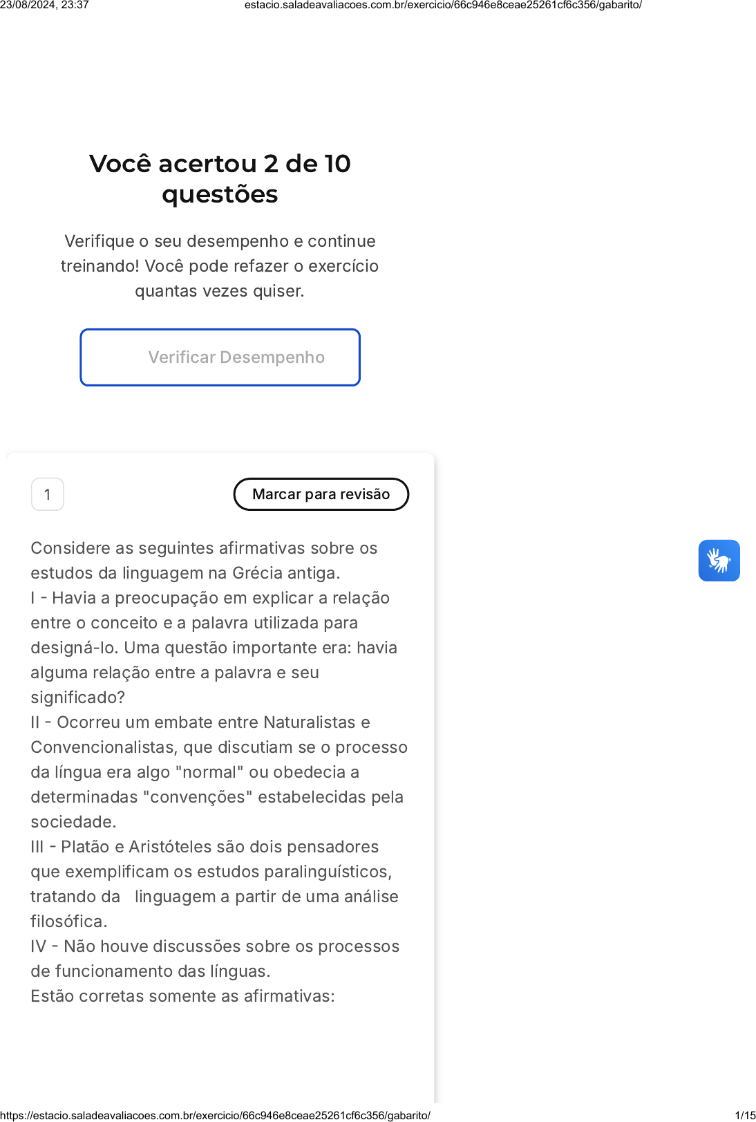 Você acertou 2 de 10 questões Verifique o seu desempenho e continue treinando! Você pode refazer o exercício quantas vezes quiser. Verificar Desempenho 1 Marcar para revisão Considere as seguintes afirmativas sobre os estudos da linguagem na Grécia antiga. I � Havia a preocupação em explicar a relação entre o conceito e a palavra utilizada para designá-lo. Uma questão importante era: havia alguma relação entre a palavra e seu significado? II � Ocorreu um embate entre Naturalistas e Convencionalistas, que discutiam se o processo da língua era algo "normal" ou obedecia a determinadas "convenções" estabelecidas pela sociedade. III � Platão e Aristóteles são dois pensadores que exemplificam os estudos paralinguísticos, tratando da linguagem a partir de uma análise filosófica. IV � Não houve discussões sobre os processos de funcionamento das línguas. Estão corretas somente as afirmativas: 23/08/2024, 23:37 estacio.saladeavaliacoes.com.br/exercicio/66c946e8ceae25261cf6c356/gabarito/ https://estacio.saladeavaliacoes.com.br/exercicio/66c946e8ceae25261cf6c356/gabarito/ 1/15 usuario Realce usuario Realce A B C D E I e II. I e III. I, II e III. I, II e IV. I, III e IV. Resposta incorreta Opa! A alternativa correta é a letra C. Confira o gabarito comentado! Gabarito Comentado A resposta correta é: I, II e III. A afirmativa I está correta porque os estudos da linguagem na Grécia antiga estavam preocupados em explicar a relação entre o conceito e a palavra utilizada para designá-lo. A afirmativa II está correta porque houve um embate entre Naturalistas e Convencionalistas, que discutiam se o processo da língua era algo "normal" ou obedecia a determinadas "convenções" estabelecidas pela sociedade. A afirmativa III está correta porque Platão e Aristóteles são dois pensadores que exemplificam os estudos paralinguísticos, tratando da linguagem a partir de uma análise filosófica. A afirmativa IV está incorreta porque houve discussões sobre os processos de funcionamento das línguas. 23/08/2024, 23:37 estacio.saladeavaliacoes.com.br/exercicio/66c946e8ceae25261cf6c356/gabarito/ https://estacio.saladeavaliacoes.com.br/exercicio/66c946e8ceae25261cf6c356/gabarito/ 2/15 A B C D E ----- 2 Marcar para revisão Os estudos sobre a linguagem no século XIX devem ser corretamente identificados com: O desinteresse pela mudança das línguas e a descoberta de sua história. A linguística histórica e a gramática comparada. A inexistência de uma linguagem própria para tratar exatamente da linguagem. A ausência símbolos e de desenvolvimento de recursos para descrição de uma língua. O fortalecimento da linguística moderna e do caráter científico do estudo da linguagem. Resposta incorreta Opa! A alternativa correta é a letra B. Confira o gabarito comentado! Gabarito Comentado Os estudos sobre a linguagem no século XIX foram marcados pelo surgimento da linguística histórica e da gramática comparada, que se preocuparam com a 23/08/2024, 23:37 estacio.saladeavaliacoes.com.br/exercicio/66c946e8ceae25261cf6c356/gabarito/ https://estacio.saladeavaliacoes.com.br/exercicio/66c946e8ceae25261cf6c356/gabarito/ 3/15 A B C D E mudança das línguas e com a descoberta de sua história. 3 Marcar para revisão Entre a chamada linguagem não verbal, encontramos signos que são denominados ícones, como pode ser exemplificado No uso do desenho de uma caveira representando perigo porque a imagem tem alguma relação de semelhança com o objeto que representa e foi elaborada com a intenção de transmitir uma informação. Na nuvem escura no céu, porque ela tem a intenção de estabelecer a comunicação de que provavelmente vai chover. No uso da palavra escrita, porque ela simboliza alguma coisa que está ausente. No uso da palavra falada, porque ela cria uma imagem na mente de quem a ouve. Na marca de freada de um carro, porque se constitui numa imagem no asfalto que tem existência concreta. Resposta incorreta Questão 3 de 10 Corretas �2� Incorretas �8� Em branco �0� 1 2 3 4 5 6 7 8 9 10 Exercicio Linguagem e Linguistica Sair 23/08/2024, 23:37 estacio.saladeavaliacoes.com.br/exercicio/66c946e8ceae25261cf6c356/gabarito/ https://estacio.saladeavaliacoes.com.br/exercicio/66c946e8ceae25261cf6c356/gabarito/ 4/15 A B C Opa! A alternativa correta é a letra A. Confira o gabarito comentado! Gabarito Comentado A alternativa correta é a letra A, que se refere ao uso do desenho de uma caveira para representar perigo. Este é um exemplo de ícone, um tipo de signo na linguagem não verbal. O ícone tem uma relação de semelhança com o objeto que representa, neste caso, o perigo. A imagem da caveira foi elaborada com a intenção de transmitir uma informação específica, tornando-se assim um ícone na linguagem não verbal. 4 Marcar para revisão Assinale a alternativa que apresenta uma afirmação correta sobre a linguagem. O conceito de linguagem é restrito e objetivo, ou seja, se aplica apenas à escrita e à fala. A linguagem engloba todos os sinais ou signos utilizados na expressão ou na comunicação, incluindo linguagem verbal e não verbal. A língua é a única manifestação de linguagem, por isso mesmo pode ser identificada com a linguagem verbal. 23/08/2024, 23:37 estacio.saladeavaliacoes.com.br/exercicio/66c946e8ceae25261cf6c356/gabarito/ https://estacio.saladeavaliacoes.com.br/exercicio/66c946e8ceae25261cf6c356/gabarito/ 5/15 D E A língua é uma das manifestações de linguagem, por isso mesmo pode ser identificada com a linguagem não verbal. Linguagem é um conceito que deve ser entendido do mesmo modo e com o mesmo sentido tanto em relação aos seres humanos quanto em relação aos animais. Resposta correta Parabéns, você selecionou a alternativa correta. Confira o gabarito comentado! Gabarito Comentado A alternativa correta é a B, que afirma que a linguagem engloba todos os sinais ou signos utilizados na expressão ou na comunicação, inc