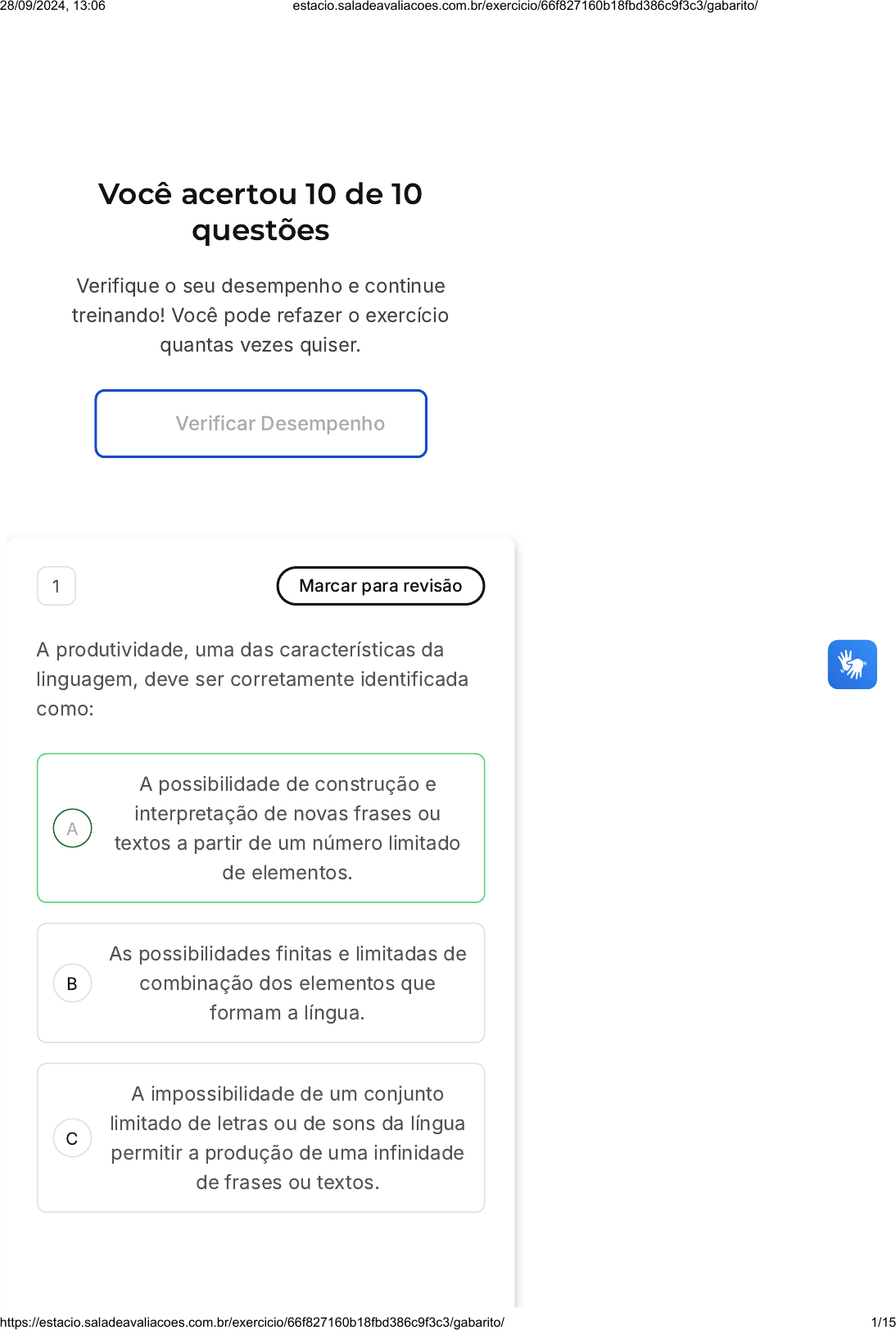 Você acertou 10 de 10 questões Verifique o seu desempenho e continue treinando! Você pode refazer o exercício quantas vezes quiser. Verificar Desempenho A B C 1 Marcar para revisão A produtividade, uma das características da linguagem, deve ser corretamente identificada como: A possibilidade de construção e interpretação de novas frases ou textos a partir de um número limitado de elementos. As possibilidades finitas e limitadas de combinação dos elementos que formam a língua. A impossibilidade de um conjunto limitado de letras ou de sons da língua permitir a produção de uma infinidade de frases ou textos. 28/09/2024, 13:06 estacio.saladeavaliacoes.com.br/exercicio/66f827160b18fbd386c9f3c3/gabarito/ https://estacio.saladeavaliacoes.com.br/exercicio/66f827160b18fbd386c9f3c3/gabarito/ 1/15 D E A impossibilidade de apenas 26 letras do nosso alfabeto permitir escrever tudo o que quisermos ou imaginarmos. A possibilidade de desmembrar ou segmentar os diferentes elementos ou distintas unidades que formam as palavras de uma língua. Resposta correta Parabéns, você selecionou a alternativa correta. Confira o gabarito comentado! Gabarito Comentado A produtividade é a capacidade de uma língua de produzir um número infinito de frases ou textos a partir de um número limitado de elementos. 2 Marcar para revisão Considere as seguintes afirmações sobre a dualidade ou dupla articulação da língua. I � A dupla articulação ou dualidade acontece porque as unidades mínimas se combinam ou se articulam em dois níveis: o dos morfemas e o dos fonemas. II � A língua é articulada porque as sentenças são o resultado da união de elementos menores. III � A primeira articulação refere-se às combinações dos sons da língua e não possuem significação ou sentido gramatical. IV � A segunda articulação refere-se às relações combinatórias dos fonemas e tem 28/09/2024, 13:06 estacio.saladeavaliacoes.com.br/exercicio/66f827160b18fbd386c9f3c3/gabarito/ https://estacio.saladeavaliacoes.com.br/exercicio/66f827160b18fbd386c9f3c3/gabarito/ 2/15 A B C D E apenas função distintiva. Estão corretas somente as afirmativas: I e III. I e IV. I, II e III. I, II e IV. I, III e IV. Resposta correta Parabéns, você selecionou a alternativa correta. Confira o gabarito comentado! Gabarito Comentado A resposta correta é: I, II e IV. A afirmação I é correta porque a dupla articulação ou dualidade acontece porque as unidades mínimas se combinam ou se articulam em dois níveis: o dos morfemas e o dos fonemas. A afirmação II é correta porque a língua é articulada porque as sentenças são o resultado da união de elementos menores. A afirmação III é correta porque a primeira articulação refere-se às combinações dos sons da língua e não possuem significação ou sentido gramatical. A afirmação IV é correta porque a segunda articulação refere-se às relações 28/09/2024, 13:06 estacio.saladeavaliacoes.com.br/exercicio/66f827160b18fbd386c9f3c3/gabarito/ https://estacio.saladeavaliacoes.com.br/exercicio/66f827160b18fbd386c9f3c3/gabarito/ 3/15 A B C D E combinatórias dos fonemas e tem apenas função distintiva. Portanto, a resposta correta é: I, II e IV. ----- 3 Marcar para revisão Marque a alternativa que descreve adequadamente a Linguística. A Linguística leva em conta a língua como seu objeto de estudo de forma empírica, por meio da observação dos fatos linguísticos, e a partir de sua fundamentação teórica específica. A Linguística não pode ser considerada ciência, mas uma arte que descreve como falar e escrever melhor. A Linguística tem um objeto concreto de estudo, mas falta um arcabouço teórico para sua fundamentação, o que não impede seu caráter científico. A Linguística ainda caminha para se tornar autônoma e assumir seu caráter científico. A Linguística é uma ciência nova que ainda busca o seu objeto concreto de estudo. 28/09/2024, 13:06 estacio.saladeavaliacoes.com.br/exercicio/66f827160b18fbd386c9f3c3/gabarito/ https://estacio.saladeavaliacoes.com.br/exercicio/66f827160b18fbd386c9f3c3/gabarito/ 4/15 Resposta correta Parabéns, você selecionou a alternativa correta. Confira o gabarito comentado! Gabarito Comentado A alternativa correta é a A. A Linguística é uma ciência que estuda a língua de forma empírica, ou seja, baseada na experiência e na observação dos fatos linguísticos. Além disso, ela possui uma fundamentação teórica específica que a sustenta. As demais alternativas apresentam conceitos equivocados ou incompletos sobre a Linguística. A alternativa B, por exemplo, erra ao afirmar que a Linguística é uma arte e não uma ciência. A alternativa C erra ao afirmar que a Linguística não possui um arcabouço teórico para sua fundamentação. A alternativa D erra ao afirmar que a Linguística ainda está caminhando para se tornar uma ciência, quando na verdade ela já é reconhecida como tal. Por fim, a alternativa E erra ao afirmar que a Linguística ainda busca seu objeto de estudo, quando na verdade seu objeto de estudo é a língua. 4 Marcar para revisão Entre a chamada linguagem não verbal, encontramos signos que são denominados ícones, como pode ser exemplificado 28/09/2024, 13:06 estacio.saladeavaliacoes.com.br/exercicio/66f827160b18fbd386c9f3c3/gabarito/ https://estacio.saladeavaliacoes.com.br/exercicio/66f827160b18fbd386c9f3c3/gabarito/ 5/15 A B C D E No uso do desenho de uma caveira representando perigo porque a imagem tem alguma relação de semelhança com o objeto que representa e foi elaborada com a intenção de transmitir uma informação. Na nuvem escura no céu, porque ela tem a intenção de estabelecer a comunicação de que provavelmente vai chover. No uso da palavra escrita, porque ela simboliza alguma coisa que está ausente. No uso da palavra falada, porque ela cria uma imagem na mente de quem a ouve. Na marca de freada de um carro, porque se constitui numa imagem no as
