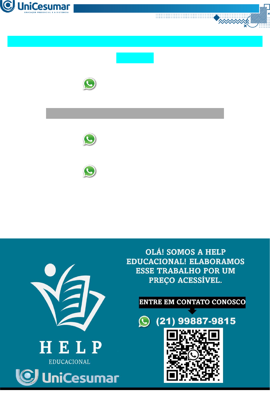 ATIVIDADE 2 – BEDU – ESTÁGIO SUPERVISIONADO V - 54_2025 (21) 99887-9815 ASSESSORIA NOS SEUS TRABALHOS (21) 99887-9815 (21) 99887-9815 Este ambiente será utilizado para o envio da Atividade de Estudo 2 – TARDE DE RECREA- ÇÃO do Estágio Supervisionado V do curso de Educação Física – Bacharelado. As Organizações Não Governamentais (ONG) exercem um papel importante no apoio a crian- ças e adolescentes em situação de vulnerabilidade social, promovendo ações que estimulam o desenvolvimento físico, social e emocional por meio de atividades esportivas, recreativas e cul- turais. Pensando nisso, estudante do curso de Educação Física, você foi convidado a planejar e condu- zir uma TARDE DE RECREAÇÃO para as crianças atendidas por uma ONG da sua cidade. Essa é uma oportunidade valiosa para aplicar seus conhecimentos, contribuir com a comuni- dade e proporcionar momentos de lazer, interação e aprendizado para os participantes. Leia com atenção as orientações a seguir: - Assista à aula conceitual disponível no seu ambiente virtual Studeo que contém as explicações dessa atividade. - Baixe o modelo da atividade no Material da disciplina e leia atentamente todas as orienta- ções sobre como realizar a atividade. O uso do modelo é obrigatório. - A atividade é individual. Em caso de cópias ou atividades similares entre estudantes, a ativi- dade será zerada. Em caso de cópias de livros ou sites da internet, a atividade será zerada por plágio. - O envio deve ser feito em um único arquivo, no formato Word (.doc ou .docx). Apenas esse formato será aceito para análise e correção; portanto, não entregue em outro formato. ANTES DE FINALIZAR SUA ATIVIDADE, CERTIFIQUE-SE DE QUE O ARQUIVO ESTÁ COR- RETO, POIS NÃO SERÁ POSSÍVEL REENVIO! O SISTEMA SÓ PERMITE O ENVIO DE UM ÚNICO ARQUIVO A IES não se responsabiliza por arquivos de atividades não finalizadas, sendo, portanto, não re- cebidas por motivos de ordem técnica dos computadores OLÁ! SOMOS A HELP EDUCACIONAL! ELABORAMOS ESSE TRABALHO POR UM PREÇO ACESSÍVEL. ENTRE EM CONTATO CONOSCO (21) 99887-9815