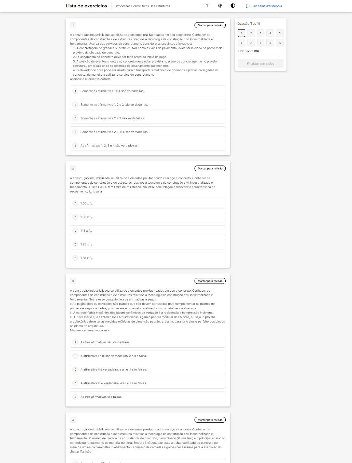 Lista de exercícios Processos Construtivos Das Estruturas T Sair e finalizar depois Questão de 10 1 Marcar para revisão 1 2 3 4 5 A construção industrializada se utiliza de elementos pré-fabricados em aço e concreto. Conhecer os componentes de construção e de estruturas relativos à tecnologia da construção civil industrializada é fundamental. Acerca dos serviços de concretagem, considere as seguintes afirmativas: 6 7 8 9 10 1. A concretagem de grandes superfícies, tais como as lajes de pavimento, deve ser iniciada no ponto mais próximo da chegada do concreto. Em branco (10) 2.0 lançamento do concreto deve ser feito antes do início da pega. 3. A posição de eventuais juntas no concreto deve estar prevista no plano de concretagem e no projeto Finalizar exercícios estrutural, em locais onde esforços de cisalhamento são menores. 4.0 elevador de obra pode ser usado para transporte simultâneo de operários e jericas carregadas de concreto, de maneira a agilizar serviço de concretagem. Assinale a alternativa correta. A Somente as afirmativas e 4 são verdadeiras. Somente as afirmativas 1, 2 e 3 são verdadeiras. Somente as afirmativas 2 e 3 são verdadeiras. D Somente as afirmativas 2, 3 e 4 são verdadeiras. E As afirmativas 1, 2, 3 e 4 são verdadeiras. 2 Marcar para revisão A construção industrializada se utiliza de elementos pré-fabricados em aço e concreto. Conhecer componentes de construção e de estruturas relativos à tecnologia da construção civil industrializada é fundamental. aço CA-50 tem limite de resistência em MPA, com relação a resistência característica de escoamento, fy, igual a A 1,00 1,08 fy. 1,18 fy. D 1,25 E 1,38 3 Marcar para revisão A construção industrializada se utiliza de elementos pré-fabricados em aço e concreto. Conhecer componentes de construção e de estruturas relativos à tecnologia da construção civil industrializada é fundamental. Sobre esse contexto, leia as afirmativas a seguir: I. As paginações ou elevações são plantas que não devem ser usadas para complementar as plantas de primeira e segunda fiadas, pois nessas é possível visualizar todos os detalhes da alvenaria. II. A característica mecânica dos blocos cerâmicos de vedação é a resistência à compressão individual. III. necessário que as dimensões arquitetônicas sigam padrão modular dos blocos, ou seja, projeto arquitetônico deve ter as medidas múltiplas de dimensão padrão, e, assim, garantir ajuste perfeito dos blocos na planta de arquitetura. Marque a alternativa correta: A As três afirmativas são verdadeiras. A afirmativa e III são verdadeiras, e a é falsa. A afirmativa é verdadeira, e a e III são falsas. D A afirmativa III é verdadeira, e a e são falsas. E As três afirmativas são falsas. 4 Marcar para revisão A construção industrializada se utiliza de elementos pré-fabricados em aço e concreto. Conhecer os componentes de construção e de estruturas relativos à tecnologia da construção civil industrializada é fundamental. ensaio de medida de consistência do concreto, denominado Slump Test, é principal ensaio no controle de recebimento do material na obra. Embora limitado, expressa a trabalhabilidade do concreto por meio de um único parâmetro: abatimento. número de camadas e golpes necessários para a execução do Slump Test sãoA 4 camadas de 25 goipes cada. 4 camadas de 30 golpes cada. C 3 camadas de 30 golpes cada. D 3 camadas de 25 golpes cada. E 4 camadas de 15 golpes cada. 5 Marcar para revisão A construção industrializada se utiliza de elementos pré-fabricados em aço e concreto. Conhecer componentes de construção e de estruturas relativos à tecnologia da construção civil industrializada é fundamental. sistema construtivo caracterizado pela conformação do "esqueleto estrutural", estruturado em perfis leves de aço galvanizado conformados a frio, com fechamentos em chapas delgadas, geralmente painéis cimentícios, autoportante, sendo capaz de suportar as cargas da edificação, denomina-se A Steel-framing. Wood-framing. Dry-wall. D Tilt up. E Pré-moldado. 6 Marcar para revisão A construção industrializada se utiliza de elementos pré-fabricados em aço e concreto. Conhecer componentes de construção e de estruturas relativos à tecnologia da construção civil industrializada é fundamental. A respeito de escoramento e de formas para estruturas de concreto armado, assinale a alternativa correta. A Somente formas para estruturas de concreto aparente devem ser tratadas com desmoldantes. As distâncias máximas recomendadas para posicionamento dos elementos verticais de suporte são 3,0 m X 3,0 m, sendo que vãos maiores poderão ser utilizados desde que justificados pelo projetista da estrutura de concreto. As formas devem ser projetadas para serem utilizadas apenas uma única vez. D escoramento deve ser apoiado sempre sobre solo, independentemente da respectiva resistência. As formas devem ser executadas rigorosamente, de acordo com as dimensões indicadas no projeto, e E ter a resistência necessária. 7 Marcar para revisão A construção industrializada se utiliza de elementos pré-fabricados em aço e concreto. Conhecer componentes de construção e de estruturas relativos à tecnologia da construção civil industrializada é fundamental. Na aplicação das técnicas de execução de lajes de concreto do tipo ALVEOLARES, CONVENCIONAIS, PROTENDIDAS, STEEL DECK e NERVURADAS, é correto afirmar: Uma laje alveolar é uma laje moldada in loco que, através da incorporação de vazios ou de elementos A de massa reduzida e de volumes padronizados, retira carga excessiva de peso próprio da laje, aumentando sua resistência final. Dentre as muitas vantagens para a construção, as lajes nervuradas destacam-se pela alta qualidade B do acabamento da laje, dispensa escoramento, aumenta a rapidez da construção, é fácil de instalar e executar. A laje convencional é uma laje do tipo mi