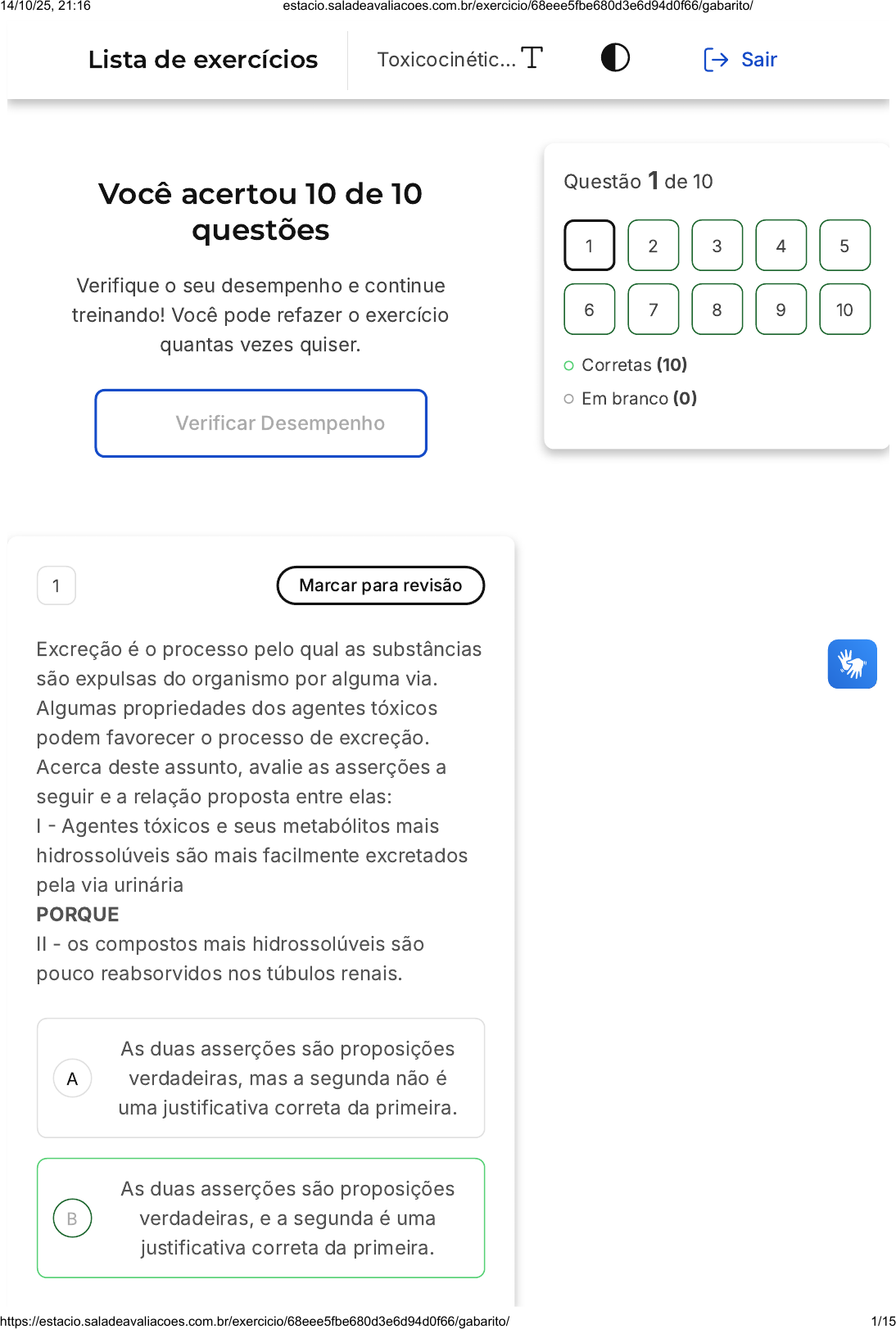 Você acertou 10 de 10 questões Verifique o seu desempenho e continue treinando! Você pode refazer o exercício quantas vezes quiser. Verificar Desempenho A B 1 Marcar para revisão Excreção é o processo pelo qual as substâncias são expulsas do organismo por alguma via. Algumas propriedades dos agentes tóxicos podem favorecer o processo de excreção. Acerca deste assunto, avalie as asserções a seguir e a relação proposta entre elas: I - Agentes tóxicos e seus metabólitos mais hidrossolúveis são mais facilmente excretados pela via urinária PORQUE II - os compostos mais hidrossolúveis são pouco reabsorvidos nos túbulos renais. As duas asserções são proposições verdadeiras, mas a segunda não é uma justificativa correta da primeira. As duas asserções são proposições verdadeiras, e a segunda é uma justificativa correta da primeira. Questão 1 de 10 Corretas (10) Em branco (0) 1 2 3 4 5 6 7 8 9 10 Lista de exercícios Toxicocinétic… Sair 14/10/25, 21:16 estacio.saladeavaliacoes.com.br/exercicio/68eee5fbe680d3e6d94d0f66/gabarito/ https://estacio.saladeavaliacoes.com.br/exercicio/68eee5fbe680d3e6d94d0f66/gabarito/ 1/15 C D E Tanto a primeira quanto a segunda asserções são proposições falsas. A primeira asserção é uma proposição falsa, e a segunda, uma proposição verdadeira. A primeira asserção é uma proposição verdadeira, e a segunda, uma proposição falsa. Resposta correta Parabéns, você selecionou a alternativa correta. Confira o gabarito comentado! Gabarito Comentado As duas asserções são proposições verdadeiras, e a segunda justifica corretamente a primeira. A excreção é um processo vital que permite ao organismo eliminar substâncias tóxicas e metabólitos. Agentes tóxicos e seus metabólitos mais hidrossolúveis são mais facilmente excretados pela via urinária porque os compostos mais hidrossolúveis são pouco reabsorvidos nos túbulos renais. Isso ocorre porque esses compostos são mais polares e, portanto, têm dificuldade em atravessar as membranas celulares. Essa característica favorece o processo de excreção urinária, uma vez que compostos com essas características sofrem pouca reabsorção renal, facilitando assim a sua eliminação do organismo. 14/10/25, 21:16 estacio.saladeavaliacoes.com.br/exercicio/68eee5fbe680d3e6d94d0f66/gabarito/ https://estacio.saladeavaliacoes.com.br/exercicio/68eee5fbe680d3e6d94d0f66/gabarito/ 2/15 A B C D E 2 Marcar para revisão A biotransformação corresponde a qualquer alteração na estrutura química do agente tóxico por mecanismos bioquímicos que envolvem reações catalisadas por enzimas. Assinale a alternativa que apresenta uma das consequências do processo de biotransformação. Favorecer a eliminação dos agentes tóxicos por formação de compostos mais lipossolúveis. Aumentar a absorção dos agentes tóxicos por formação e compostos mais lipossolúveis. Reduzir a toxicidade dos agentes tóxicos por formação de metabólitos mais ativos. Favorecer a eliminação dos agentes tóxicos por formação de metabólitos mais hidrossolúveis. Reduzir a toxicidade dos agentes tóxicos por formação de radicais livres. Resposta correta Parabéns, você selecionou a alternativa correta. Confira o gabarito comentado! Gabarito Comentado 14/10/25, 21:16 estacio.saladeavaliacoes.com.br/exercicio/68eee5fbe680d3e6d94d0f66/gabarito/ https://estacio.saladeavaliacoes.com.br/exercicio/68eee5fbe680d3e6d94d0f66/gabarito/ 3/15 A B C A alternativa correta é a letra D: "Favorecer a eliminação dos agentes tóxicos por formação de metabólitos mais hidrossolúveis". A biotransformação de substâncias estranhas ao organismo, conhecidas como xenobióticos, resulta principalmente na formação de metabólitos mais hidrossolúveis. Isso ocorre porque compostos hidrossolúveis são mais facilmente eliminados pelo organismo, especialmente através da excreção renal, reduzindo assim a toxicidade desses agentes. Os radicais livres que podem ser formados durante o processo de biotransformação, ao contrário, podem causar danos ao organismo e, portanto, não contribuem para a redução da toxicidade dos agentes tóxicos. 3 Marcar para revisão O processo de biotransformação de agentes tóxicos pode sofrer interferência de alguns fatores classificados como internos ou externos ao organismo. A esse respeito, assinale a alternativa que corresponde a um fator externo que interfere na biotransformação. Gênero. Idade. Indução enzimática. 14/10/25, 21:16 estacio.saladeavaliacoes.com.br/exercicio/68eee5fbe680d3e6d94d0f66/gabarito/ https://estacio.saladeavaliacoes.com.br/exercicio/68eee5fbe680d3e6d94d0f66/gabarito/ 4/15 D E Estado patológico. Estado nutricional. Resposta correta Parabéns, você selecionou a alternativa correta. Confira o gabarito comentado! Gabarito Comentado Gabarito: Indução enzimática. Comentário: A indução enzimática é um fator externo que pode interferir no processo de biotransformação de agentes tóxicos. Isso ocorre porque a indução enzimática pode aumentar a capacidade do organismo de metabolizar esses agentes. Por outro lado, o gênero, a idade, o estado patológico e o estado nutricional também são fatores que influenciam a biotransformação. No entanto, esses são considerados fatores internos, pois estão diretamente ligados ao organismo e suas características individuais. 4 Marcar para revisão Ao atuar sobre os receptores, os agentes tóxicos podem produzir efeitos por diferentes mecanismos. Em razão de sua estrutura, bem como do mecanismo efetor imediato, os receptores foram agrupados em superfamílias. A esse respeito, assinale a alternativa que não 14/10/25, 21:16 estacio.saladeavaliacoes.com.br/exercicio/68eee5fbe680d3e6d94d0f66/gabarito/ https://estacio.saladeavaliacoes.com.br/exercicio/68eee5fbe680d3e6d94d0f66/gabarito/ 5/15 A B C D E corresponde a uma família de receptores celulares. Receptores ligados a canais iônicos. Recept