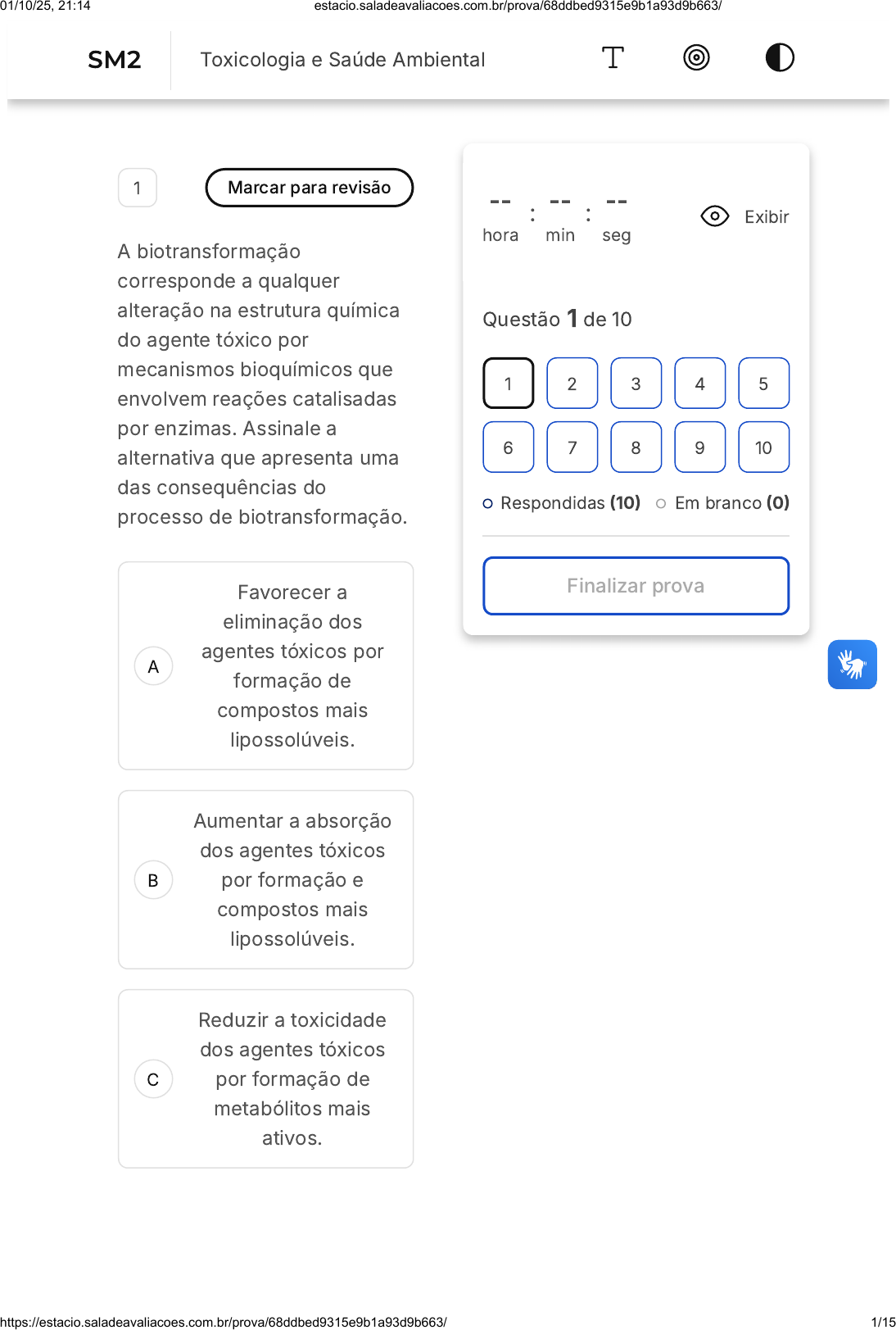 A B C 1 Marcar para revisão A biotransformação corresponde a qualquer alteração na estrutura química do agente tóxico por mecanismos bioquímicos que envolvem reações catalisadas por enzimas. Assinale a alternativa que apresenta uma das consequências do processo de biotransformação. Favorecer a eliminação dos agentes tóxicos por formação de compostos mais lipossolúveis. Aumentar a absorção dos agentes tóxicos por formação e compostos mais lipossolúveis. Reduzir a toxicidade dos agentes tóxicos por formação de metabólitos mais ativos. -- hora : -- min : -- seg Exibir Questão 1 de 10 Respondidas (10) Em branco (0) Finalizar prova 1 2 3 4 5 6 7 8 9 10 SM2 Toxicologia e Saúde Ambiental 01/10/25, 21:14 estacio.saladeavaliacoes.com.br/prova/68ddbed9315e9b1a93d9b663/ https://estacio.saladeavaliacoes.com.br/prova/68ddbed9315e9b1a93d9b663/ 1/15 D E Favorecer a eliminação dos agentes tóxicos por formação de metabólitos mais hidrossolúveis. Reduzir a toxicidade dos agentes tóxicos por formação de radicais livres. 2 Marcar para revisão A ação seletiva das substâncias químicas sobre o organismo é um parâmetro desejado, em especial no desenvolvimento de medicamentos com alvos cada vez mais específicos. No que diz respeito aos agentes tóxicos, o conhecimento da localização preferencial da ação pode auxiliar no tratamento das intoxicações. A esse respeito, assinale a alternativa que apresenta os fatores relacionados à distribuição seletiva dos agentes tóxicos e sua relação com os efeitos. 01/10/25, 21:14 estacio.saladeavaliacoes.com.br/prova/68ddbed9315e9b1a93d9b663/ https://estacio.saladeavaliacoes.com.br/prova/68ddbed9315e9b1a93d9b663/ 2/15 A B C A porosidade do endotélio capilar que favorece a toxicidade em órgão menos irrigados. A afinidade dos agentes tóxicos com compostos intracelulares específicos o que pode determinar uma ação tóxica seletiva. A alta taxa de ligação às proteínas plasmáticas, o que favorece a distribuição dos agentes tóxicos e aumenta sua toxicidade. 01/10/25, 21:14 estacio.saladeavaliacoes.com.br/prova/68ddbed9315e9b1a93d9b663/ https://estacio.saladeavaliacoes.com.br/prova/68ddbed9315e9b1a93d9b663/ 3/15 D E Mecanismos de transporte de membrana não específicos, o que favorece a distribuição de muitos agentes tóxicos para os tecidos, tornando os efeitos mais seletivos. O alto volume de distribuição de um agente tóxico, o que favorece sua ação sobre tecidos menos irrigados. 3 Marcar para revisão O uso abusivo de substâncias químicas é um problema mundial com impactos devastadores na saúde e qualidade de vida dos indivíduos. A associação de drogas de abuso com outras substâncias, como medicamentos, pode desenvolver quadro de intoxicações agudos como resultado dessas interações. A esse respeito, assinale a alternativa correta. 01/10/25, 21:14 estacio.saladeavaliacoes.com.br/prova/68ddbed9315e9b1a93d9b663/ https://estacio.saladeavaliacoes.com.br/prova/68ddbed9315e9b1a93d9b663/ 4/15 A B C D E A associação de bebidas alcoólicas com substâncias que são inibidoras enzimáticas pode aumentar os efeitos depressores do álcool. A associação de álcool com outras drogas depressoras reduz os efeitos depressores do etanol. A associação de cocaína com outras drogas estimulantes não causa alterações significativas nos seus efeitos. A associação de bebidas alcoólicas com medicamentos é segura, desde que se beba com moderação. Os metais tóxicos têm seus efeitos aumentados quando associados aos agentes quelantes. 01/10/25, 21:14 estacio.saladeavaliacoes.com.br/prova/68ddbed9315e9b1a93d9b663/ https://estacio.saladeavaliacoes.com.br/prova/68ddbed9315e9b1a93d9b663/ 5/15 4 Marcar para revisão A Toxicologia Ambiental é uma área da Toxicologia que estuda os danos aos organismos vivos, incluindo a saúde humana, decorrentes da presença de contaminantes no meio ambiente. A esse respeito, considere as seguintes afirmativas. I. A poluição ambiental se refere unicamente à contaminação dos compartimentos ambientais (ar, água, solo) por substâncias químicas, sem alusão à contaminação de alimentos. II. O ciclo biogeoquímico dos agentes tóxicos auxilia o Toxicologista ambiental a compreender de que forma esse xenobiótico interage com os organismos vivos e o meio ambiente. III. A Toxicologia ambiental estuda os efeitos nocivos ocasionados por substâncias químicas contaminantes do ambiente de trabalho. IV. A Contaminação ambiental decorre exclusivamente de atividade humana, como por exemplo, queima de combustível, esgoto, agrotóxico e resíduos industriais. V. Poluentes propagados no meio ambiente podem se combinar quimicamente e formar compostos de maior 01/10/25, 21:14 estacio.saladeavaliacoes.com.br/prova/68ddbed9315e9b1a93d9b663/ https://estacio.saladeavaliacoes.com.br/prova/68ddbed9315e9b1a93d9b663/ 6/15 A B C D E A B toxicidade em relação às substâncias originais. Assinale a alternativa que corresponde às afirmativas corretas. I e II. II e III. III e IV. I e IV II e V 5 Marcar para revisão A respeito da avaliação do potencial tóxico dos poluentes, assinale a alternativa que corresponde à probabilidade de um poluente causar dano potencial ao ecossistema em certas condições de uso. Dano potencial. Risco. 01/10/25, 21:14 estacio.saladeavaliacoes.com.br/prova/68ddbed9315e9b1a93d9b663/ https://estacio.saladeavaliacoes.com.br/prova/68ddbed9315e9b1a93d9b663/ 7/15 C D E A B Toxicidade. Concentração. Potencial de periculosidade. 6 Marcar para revisão O tabagismo passivo é a inalação da fumaça de derivados do tabaco, tais como cigarro, por indivíduos não fumantes, mas que convivem com fumantes em diferentes ambientes respirando as mesmas substâncias tóxicas que o fumante inala. Em relação ao tabagismo passivo, assinale a alternativa correta: A fumaça do tabaco liberada no ambiente contém concentrações mínimas de substâncias tóxicas e cancerígen