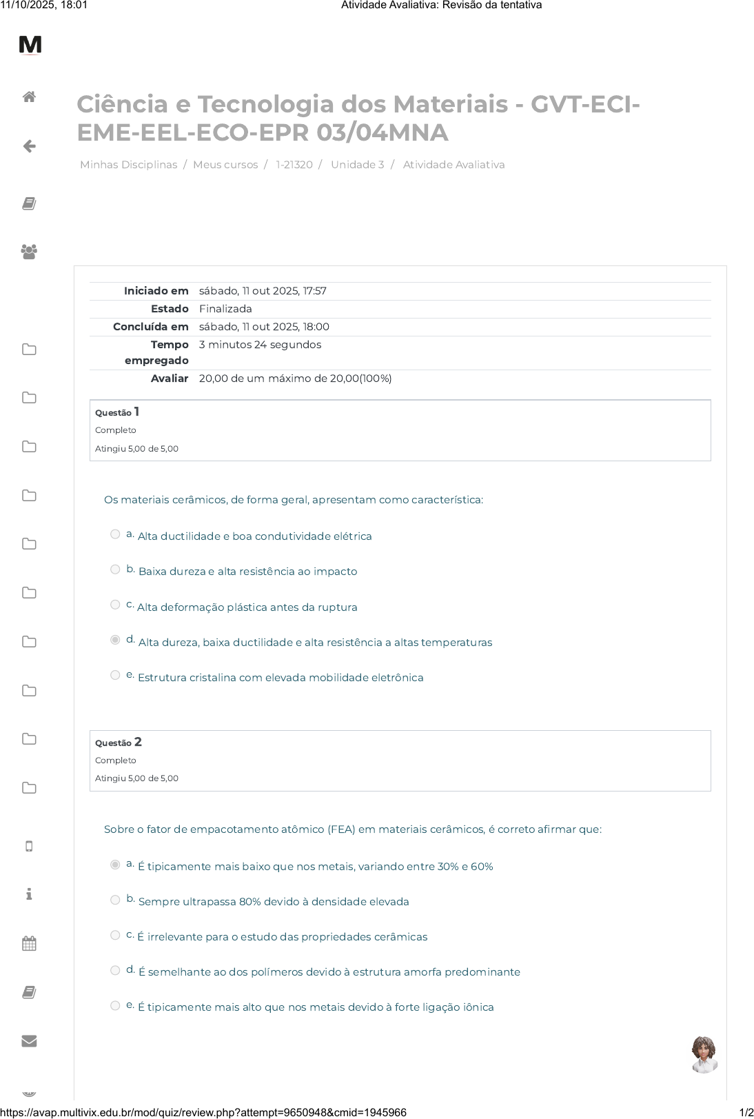 Minhas Disciplinas / Meus cursos / 1-21320 / Unidade 3 / Atividade Avaliativa Ciência e Tecnologia dos Materiais - GVT-ECI- EME-EEL-ECO-EPR 03/04MNA Iniciado em sábado, 11 out 2025, 17:57 Estado Finalizada Concluída em sábado, 11 out 2025, 18:00 Tempo empregado 3 minutos 24 segundos Avaliar 20,00 de um máximo de 20,00(100%) Questão 1 Completo Atingiu 5,00 de 5,00 Questão 2 Completo Atingiu 5,00 de 5,00 Os materiais cerâmicos, de forma geral, apresentam como característica: a. Alta ductilidade e boa condutividade elétrica b. Baixa dureza e alta resistência ao impacto c. Alta deformação plástica antes da ruptura d. Alta dureza, baixa ductilidade e alta resistência a altas temperaturas e. Estrutura cristalina com elevada mobilidade eletrônica Sobre o fator de empacotamento atômico (FEA) em materiais cerâmicos, é correto afirmar que: a. É tipicamente mais baixo que nos metais, variando entre 30% e 60% b. Sempre ultrapassa 80% devido à densidade elevada c. É irrelevante para o estudo das propriedades cerâmicas d. É semelhante ao dos polímeros devido à estrutura amorfa predominante e. É tipicamente mais alto que nos metais devido à forte ligação iônica 11/10/2025, 18:01 Atividade Avaliativa: Revisão da tentativa https://avap.multivix.edu.br/mod/quiz/review.php?attempt=9650948&cmid=1945966 1/2 https://avap.multivix.edu.br/my/ https://avap.multivix.edu.br/course/view.php?id=35646 https://avap.multivix.edu.br/course/view.php?id=35646§ion=4 https://avap.multivix.edu.br/mod/quiz/view.php?id=1945966 https://avap.multivix.edu.br/my/ https://avap.multivix.edu.br/course/view.php?id=35646 https://avap.multivix.edu.br/user/index.php?id=35646 https://avap.multivix.edu.br/course/view.php?id=35646§ion=1 https://avap.multivix.edu.br/course/view.php?id=35646§ion=2 https://avap.multivix.edu.br/course/view.php?id=35646§ion=3 https://avap.multivix.edu.br/course/view.php?id=35646§ion=4 https://avap.multivix.edu.br/course/view.php?id=35646§ion=5 https://avap.multivix.edu.br/course/view.php?id=35646§ion=6 https://avap.multivix.edu.br/course/view.php?id=35646§ion=7 https://avap.multivix.edu.br/course/view.php?id=35646§ion=8 https://avap.multivix.edu.br/course/view.php?id=35646§ion=9 https://avap.multivix.edu.br/course/view.php?id=35646§ion=10 https://avap.multivix.edu.br/hooks/portal/ https://avap.multivix.edu.br/mod/page/view.php?id=1252%2F%22%20target%3D%22_blank https://avap.multivix.edu.br/calendar/view.php/ https://avap.multivix.edu.br/local/staticpage/view.php?page=biblioteca https://multivix.edu.br/office-365/ https://multivix.edu.br/acessibilidade/ https://avap.multivix.edu.br/ https://avap.multivix.edu.br/ https://avap.multivix.edu.br/ Questão 3 Completo Atingiu 5,00 de 5,00 Questão 4 Completo Atingiu 5,00 de 5,00 A tendência de cristalização é maior em polímeros com estrutura linear porque: a. Cadeias lineares permitem melhor alinhamento e empacotamento molecular b. As ramificações aumentam o empacotamento das cadeias c. Polímeros lineares não apresentam forças intermoleculares significativas d. Cadeias lineares apresentam maior rigidez e, portanto, menor organização e. A estrutura linear sempre possui maior densidade que a ramificada A fragilidade do diamante, mesmo sendo um dos materiais mais duros conhecidos, está relacionada principalmente a: a. Rigidez das ligações covalentes e ausência de ductilidade b. Sua estrutura amorfa e porosa c. Alta presença de impurezas e defeitos cristalinos d. Alta condutividade elétrica, que enfraquece a rede cristalina e. Baixo módulo de elasticidade e baixa densidade ◄ Referências Bibliográficas Seguir para... Acesso a Aula Remota via Microsoft Teams ► 11/10/2025, 18:01 Atividade Avaliativa: Revisão da tentativa https://avap.multivix.edu.br/mod/quiz/review.php?attempt=9650948&cmid=1945966 2/2 https://avap.multivix.edu.br/mod/page/view.php?id=1945965&forceview=1 https://avap.multivix.edu.br/mod/url/view.php?id=1945967&forceview=1 https://avap.multivix.edu.br/my/ https://avap.multivix.edu.br/course/view.php?id=35646 https://avap.multivix.edu.br/user/index.php?id=35646 https://avap.multivix.edu.br/course/view.php?id=35646§ion=1 https://avap.multivix.edu.br/course/view.php?id=35646§ion=2 https://avap.multivix.edu.br/course/view.php?id=35646§ion=3 https://avap.multivix.edu.br/course/view.php?id=35646§ion=4 https://avap.multivix.edu.br/course/view.php?id=35646§ion=5 https://avap.multivix.edu.br/course/view.php?id=35646§ion=6 https://avap.multivix.edu.br/course/view.php?id=35646§ion=7 https://avap.multivix.edu.br/course/view.php?id=35646§ion=8 https://avap.multivix.edu.br/course/view.php?id=35646§ion=9 https://avap.multivix.edu.br/course/view.php?id=35646§ion=10 https://avap.multivix.edu.br/hooks/portal/ https://avap.multivix.edu.br/mod/page/view.php?id=1252%2F%22%20target%3D%22_blank https://avap.multivix.edu.br/calendar/view.php/ https://avap.multivix.edu.br/local/staticpage/view.php?page=biblioteca https://multivix.edu.br/office-365/ https://multivix.edu.br/acessibilidade/ https://avap.multivix.edu.br/ https://avap.multivix.edu.br/ https://avap.multivix.edu.br/