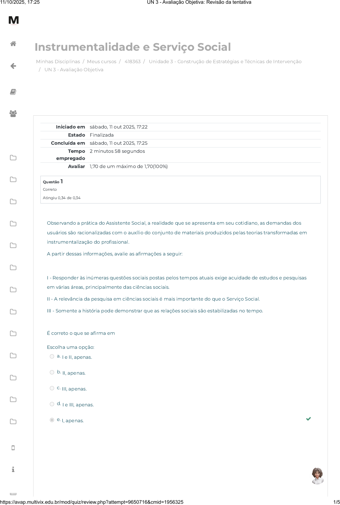 Minhas Disciplinas / Meus cursos / 418363 / Unidade 3 - Construção de Estratégias e Técnicas de Intervenção / UN 3 - Avaliação Objetiva Instrumentalidade e Serviço Social Iniciado em sábado, 11 out 2025, 17:22 Estado Finalizada Concluída em sábado, 11 out 2025, 17:25 Tempo empregado 2 minutos 58 segundos Avaliar 1,70 de um máximo de 1,70(100%) Questão 1 Correto Atingiu 0,34 de 0,34 Observando a prática do Assistente Social, a realidade que se apresenta em seu cotidiano, as demandas dos usuários são racionalizadas com o auxílio do conjunto de materiais produzidos pelas teorias transformadas em instrumentalização do profissional. A partir dessas informações, avalie as afirmações a seguir: I - Responder às inúmeras questões sociais postas pelos tempos atuais exige acuidade de estudos e pesquisas em várias áreas, principalmente das ciências sociais. II - A relevância da pesquisa em ciências sociais é mais importante do que o Serviço Social. III - Somente a história pode demonstrar que as relações sociais são estabilizadas no tempo. É correto o que se afirma em Escolha uma opção: a. I e II, apenas. b. II, apenas. c. III, apenas. d. I e III, apenas. e. I, apenas. 11/10/2025, 17:25 UN 3 - Avaliação Objetiva: Revisão da tentativa https://avap.multivix.edu.br/mod/quiz/review.php?attempt=9650716&cmid=1956325 1/5 https://avap.multivix.edu.br/my/ https://avap.multivix.edu.br/course/view.php?id=36055 https://avap.multivix.edu.br/course/view.php?id=36055§ion=4 https://avap.multivix.edu.br/mod/quiz/view.php?id=1956325 https://avap.multivix.edu.br/my/ https://avap.multivix.edu.br/course/view.php?id=36055 https://avap.multivix.edu.br/user/index.php?id=36055 https://avap.multivix.edu.br/course/view.php?id=36055§ion=1 https://avap.multivix.edu.br/course/view.php?id=36055§ion=2 https://avap.multivix.edu.br/course/view.php?id=36055§ion=3 https://avap.multivix.edu.br/course/view.php?id=36055§ion=4 https://avap.multivix.edu.br/course/view.php?id=36055§ion=5 https://avap.multivix.edu.br/course/view.php?id=36055§ion=6 https://avap.multivix.edu.br/course/view.php?id=36055§ion=7 https://avap.multivix.edu.br/course/view.php?id=36055§ion=8 https://avap.multivix.edu.br/course/view.php?id=36055§ion=9 https://avap.multivix.edu.br/course/view.php?id=36055§ion=10 https://avap.multivix.edu.br/course/view.php?id=36055§ion=11 https://avap.multivix.edu.br/course/view.php?id=36055§ion=12 https://avap.multivix.edu.br/course/view.php?id=36055§ion=13 https://avap.multivix.edu.br/hooks/portal/ https://avap.multivix.edu.br/mod/page/view.php?id=1252%2F%22%20target%3D%22_blank https://avap.multivix.edu.br/calendar/view.php/ https://avap.multivix.edu.br/ https://avap.multivix.edu.br/ https://avap.multivix.edu.br/ https://avap.multivix.edu.br/ https://avap.multivix.edu.br/ https://avap.multivix.edu.br/ Questão 2 Correto Atingiu 0,34 de 0,34 A aceitação de padrões sociais de vulnerabilização são consequências da história da sociedade. Para que uma ação interventiva do Assistente Social ocorra, sempre vai depender de como ele percebe e aciona a matriz teórico-metodológica diante de toda particularidade das demandas dos usuários do Serviço Social. Quando pensamos na Assistência Social como política pública que ela é, as possibilidades de proteção social ofertadas, também são diretamente afetadas pela postura que o profissional decidi tomar nas suas ações. Todo o conhecimento adquirido em sua formação ou capacitações continuadas fornece o conjunto de instrumentos e técnicas condizentes com a intervenção. Considerando o contexto a respeito da Assistência Social como política, é correto afirmar que Escolha uma opção: a. as demandas encontradas pelo Assistente Social são frutos de seus instrumentos e técnicas de intervenção. b. o Assistente Social fornece instrumentos e técnicas aos usuários quando estes identificam suas próprias demandas. c. os instrumentos e técnicas contribuem para ampliação do conhecimento a partir das decisões do Assistente Social diante da demanda apresentada. d. os usuários das instituições em que o assistente social trabalha, produzem o instrumental e as técnicas de intervenção. e. a disponibilidade de instrumentais e técnicas é ofertada pelas instituições que o Assistente Social atua. 11/10/2025, 17:25 UN 3 - Avaliação Objetiva: Revisão da tentativa https://avap.multivix.edu.br/mod/quiz/review.php?attempt=9650716&cmid=1956325 2/5 https://avap.multivix.edu.br/my/ https://avap.multivix.edu.br/course/view.php?id=36055 https://avap.multivix.edu.br/user/index.php?id=36055 https://avap.multivix.edu.br/course/view.php?id=36055§ion=1 https://avap.multivix.edu.br/course/view.php?id=36055§ion=2 https://avap.multivix.edu.br/course/view.php?id=36055§ion=3 https://avap.multivix.edu.br/course/view.php?id=36055§ion=4 https://avap.multivix.edu.br/course/view.php?id=36055§ion=5 https://avap.multivix.edu.br/course/view.php?id=36055§ion=6 https://avap.multivix.edu.br/course/view.php?id=36055§ion=7 https://avap.multivix.edu.br/course/view.php?id=36055§ion=8 https://avap.multivix.edu.br/course/view.php?id=36055§ion=9 https://avap.multivix.edu.br/course/view.php?id=36055§ion=10 https://avap.multivix.edu.br/course/view.php?id=36055§ion=11 https://avap.multivix.edu.br/course/view.php?id=36055§ion=12 https://avap.multivix.edu.br/course/view.php?id=36055§ion=13 https://avap.multivix.edu.br/hooks/portal/ https://avap.multivix.edu.br/mod/page/view.php?id=1252%2F%22%20target%3D%22_blank https://avap.multivix.edu.br/calendar/view.php/ https://avap.multivix.edu.br/ https://avap.multivix.edu.br/ https://avap.multivix.edu.br/ https://avap.multivix.edu.br/ https://avap.multivix.edu.br/ https://avap.multivix.edu.br/ Questão 3 Correto Atingiu 0,34 de 0,34 Avalie as asserções a seguir e a relação proposta entre elas. I – O Assistente Social deve orientar sua ação profissional para o entendimento das demandas de lu