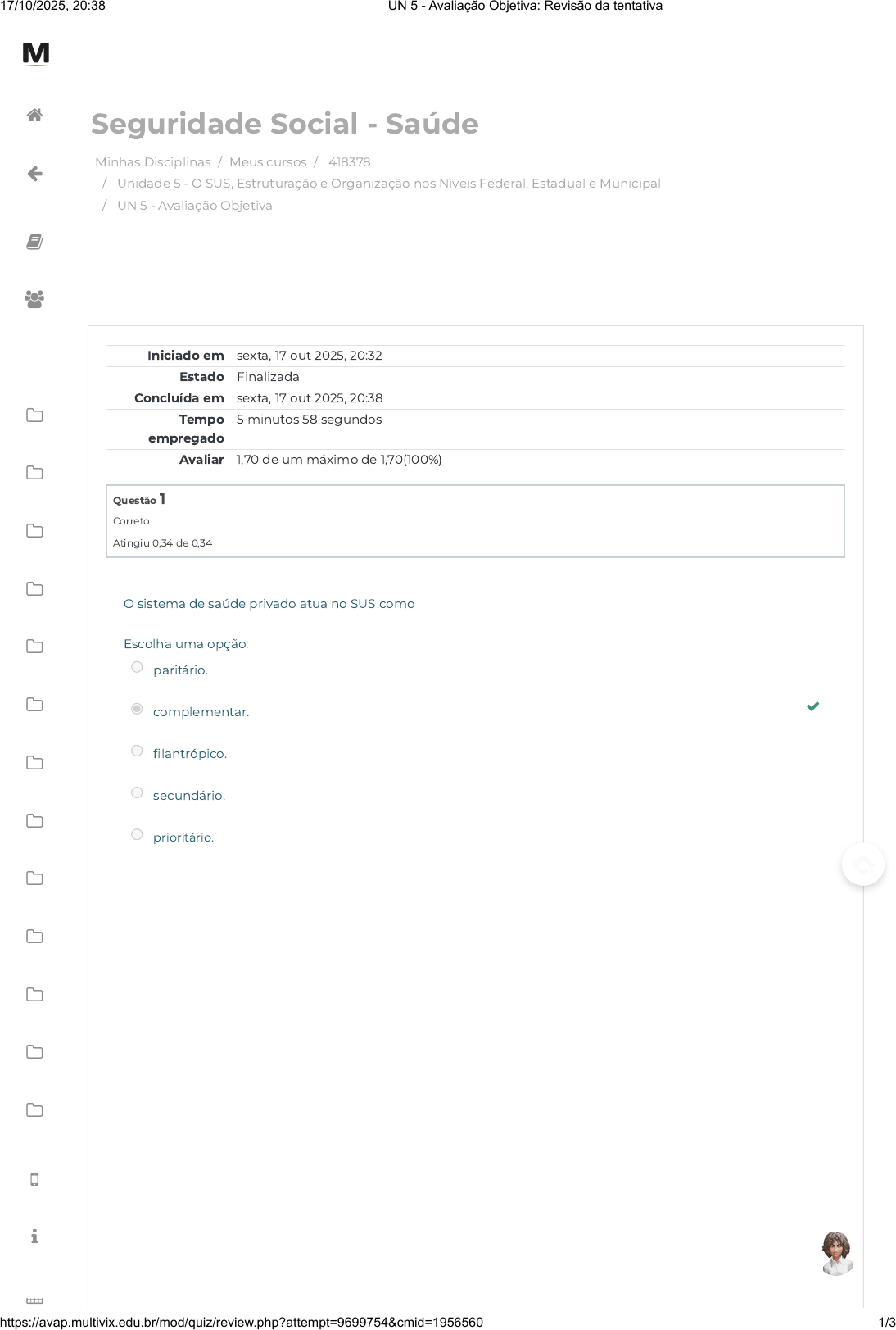 Minhas Disciplinas / Meus cursos / 418378 / Unidade 5 - O SUS, Estruturação e Organização nos Níveis Federal, Estadual e Municipal / UN 5 - Avaliação Objetiva Seguridade Social - Saúde Iniciado em sexta, 17 out 2025, 20:32 Estado Finalizada Concluída em sexta, 17 out 2025, 20:38 Tempo empregado 5 minutos 58 segundos Avaliar 1,70 de um máximo de 1,70(100%) Questão 1 Correto Atingiu 0,34 de 0,34 O sistema de saúde privado atua no SUS como Escolha uma opção: paritário. complementar. filantrópico. secundário. prioritário. 17/10/2025, 20:38 UN 5 - Avaliação Objetiva: Revisão da tentativa https://avap.multivix.edu.br/mod/quiz/review.php?attempt=9699754&cmid=1956560 1/3 https://avap.multivix.edu.br/my/ https://avap.multivix.edu.br/course/view.php?id=36066 https://avap.multivix.edu.br/course/view.php?id=36066§ion=6 https://avap.multivix.edu.br/mod/quiz/view.php?id=1956560 https://avap.multivix.edu.br/my/ https://avap.multivix.edu.br/course/view.php?id=36066 https://avap.multivix.edu.br/user/index.php?id=36066 https://avap.multivix.edu.br/course/view.php?id=36066§ion=1 https://avap.multivix.edu.br/course/view.php?id=36066§ion=2 https://avap.multivix.edu.br/course/view.php?id=36066§ion=3 https://avap.multivix.edu.br/course/view.php?id=36066§ion=4 https://avap.multivix.edu.br/course/view.php?id=36066§ion=5 https://avap.multivix.edu.br/course/view.php?id=36066§ion=6 https://avap.multivix.edu.br/course/view.php?id=36066§ion=7 https://avap.multivix.edu.br/course/view.php?id=36066§ion=8 https://avap.multivix.edu.br/course/view.php?id=36066§ion=9 https://avap.multivix.edu.br/course/view.php?id=36066§ion=10 https://avap.multivix.edu.br/course/view.php?id=36066§ion=11 https://avap.multivix.edu.br/course/view.php?id=36066§ion=12 https://avap.multivix.edu.br/course/view.php?id=36066§ion=13 https://avap.multivix.edu.br/hooks/portal/ https://avap.multivix.edu.br/mod/page/view.php?id=1252%2F%22%20target%3D%22_blank https://avap.multivix.edu.br/calendar/view.php/ https://avap.multivix.edu.br/ https://avap.multivix.edu.br/ https://avap.multivix.edu.br/ https://avap.multivix.edu.br/ Questão 2 Correto Atingiu 0,34 de 0,34 Questão 3 Correto Atingiu 0,34 de 0,34 Questão 4 Correto Atingiu 0,34 de 0,34 São competências do município na organização do SUS Escolha uma opção: Planejar, controlar e avaliar as ações e os serviços de saúde, gerir e executar os serviços públicos de saúde. Planejar, organizar, controlar e avaliar as ações e os serviços de saúde, gerir e executar os serviços públicos de saúde. Planejar, organizar, gerir e executar os serviços públicos de saúde. Planejar, organizar, controlar e avaliar as ações e os serviços de saúde. Organizar, controlar e avaliar as ações e os serviços de saúde, gerir e executar os serviços públicos de saúde. Dos princípios do SUS, o que dispõe sobre atender a todos, sem distinções ou restrições, oferecendo toda a atenção necessária, sem qualquer custo, é o princípio denominado de Escolha uma opção: universalidade. integralidade. participação Social. eficiência. equidade. Sobre o campo de atuação do SUS é correto afirmar que faz parte da Escolha uma opção: Saúde da população em geral. Vigilância do meio ambiente. Saúde das pessoas residentes na zona rural, somente. Saúde do trabalhador. Saúde dos animais domésticos. 17/10/2025, 20:38 UN 5 - Avaliação Objetiva: Revisão da tentativa https://avap.multivix.edu.br/mod/quiz/review.php?attempt=9699754&cmid=1956560 2/3 https://avap.multivix.edu.br/my/ https://avap.multivix.edu.br/course/view.php?id=36066 https://avap.multivix.edu.br/user/index.php?id=36066 https://avap.multivix.edu.br/course/view.php?id=36066§ion=1 https://avap.multivix.edu.br/course/view.php?id=36066§ion=2 https://avap.multivix.edu.br/course/view.php?id=36066§ion=3 https://avap.multivix.edu.br/course/view.php?id=36066§ion=4 https://avap.multivix.edu.br/course/view.php?id=36066§ion=5 https://avap.multivix.edu.br/course/view.php?id=36066§ion=6 https://avap.multivix.edu.br/course/view.php?id=36066§ion=7 https://avap.multivix.edu.br/course/view.php?id=36066§ion=8 https://avap.multivix.edu.br/course/view.php?id=36066§ion=9 https://avap.multivix.edu.br/course/view.php?id=36066§ion=10 https://avap.multivix.edu.br/course/view.php?id=36066§ion=11 https://avap.multivix.edu.br/course/view.php?id=36066§ion=12 https://avap.multivix.edu.br/course/view.php?id=36066§ion=13 https://avap.multivix.edu.br/hooks/portal/ https://avap.multivix.edu.br/mod/page/view.php?id=1252%2F%22%20target%3D%22_blank https://avap.multivix.edu.br/calendar/view.php/ https://avap.multivix.edu.br/ https://avap.multivix.edu.br/ https://avap.multivix.edu.br/ https://avap.multivix.edu.br/ Questão 5 Correto Atingiu 0,34 de 0,34 A Lei Orgânica do Sistema Único de Saúde – SUS, Lei de n° 8080/90, não prevê Escolha uma opção: que é prioridade do sistema de saúde privado a execução da política de saúde. saúde como um direito fundamental. que é dever do Estado promover os serviços de saúde. que o dever do Estado não exclui o das pessoas, da família, das empresas e da sociedade. que é dever do Estado assegurar acesso universal e igualitário aos serviços de saúde. ◄ Conteúdo Online Seguir para... Conteúdo Online ► 17/10/2025, 20:38 UN 5 - Avaliação Objetiva: Revisão da tentativa https://avap.multivix.edu.br/mod/quiz/review.php?attempt=9699754&cmid=1956560 3/3 https://avap.multivix.edu.br/mod/scorm/view.php?id=1956559&forceview=1 https://avap.multivix.edu.br/mod/scorm/view.php?id=1956561&forceview=1 https://avap.multivix.edu.br/my/ https://avap.multivix.edu.br/course/view.php?id=36066 https://avap.multivix.edu.br/user/index.php?id=36066 https://avap.multivix.edu.br/course/view.php?id=36066§ion=1 https://avap.multivix.edu.br/course/view.php?id=36066§ion=2 https://avap.multivix.edu.br/course/view.php?id=36066§ion=3 https://avap.multivix.edu.br/course/view.php?id=36066