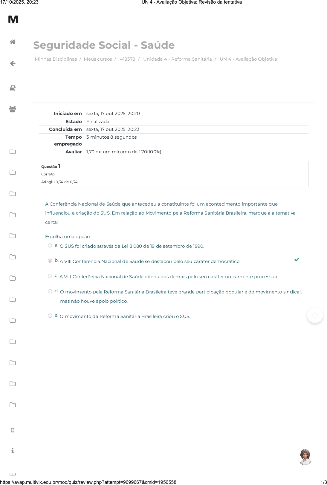 Minhas Disciplinas / Meus cursos / 418378 / Unidade 4 - Reforma Sanitária / UN 4 - Avaliação Objetiva Seguridade Social - Saúde Iniciado em sexta, 17 out 2025, 20:20 Estado Finalizada Concluída em sexta, 17 out 2025, 20:23 Tempo empregado 3 minutos 8 segundos Avaliar 1,70 de um máximo de 1,70(100%) Questão 1 Correto Atingiu 0,34 de 0,34 A Conferência Nacional de Saúde que antecedeu a constituinte foi um acontecimento importante que influenciou a criação do SUS. Em relação ao Movimento pela Reforma Sanitária Brasileira, marque a alternativa certa: Escolha uma opção: a. O SUS foi criado através da Lei 8.080 de 19 de setembro de 1990. b. A VIII Conferência Nacional de Saúde se destacou pelo seu caráter democrático. c. A VIII Conferência Nacional de Saúde diferiu das demais pelo seu caráter unicamente processual. d. O movimento pela Reforma Sanitária Brasileira teve grande participação popular e do movimento sindical, mas não houve apoio político. e. O movimento da Reforma Sanitária Brasileira criou o SUS. 17/10/2025, 20:23 UN 4 - Avaliação Objetiva: Revisão da tentativa https://avap.multivix.edu.br/mod/quiz/review.php?attempt=9699667&cmid=1956558 1/3 https://avap.multivix.edu.br/my/ https://avap.multivix.edu.br/course/view.php?id=36066 https://avap.multivix.edu.br/course/view.php?id=36066§ion=5 https://avap.multivix.edu.br/mod/quiz/view.php?id=1956558 https://avap.multivix.edu.br/my/ https://avap.multivix.edu.br/course/view.php?id=36066 https://avap.multivix.edu.br/user/index.php?id=36066 https://avap.multivix.edu.br/course/view.php?id=36066§ion=1 https://avap.multivix.edu.br/course/view.php?id=36066§ion=2 https://avap.multivix.edu.br/course/view.php?id=36066§ion=3 https://avap.multivix.edu.br/course/view.php?id=36066§ion=4 https://avap.multivix.edu.br/course/view.php?id=36066§ion=5 https://avap.multivix.edu.br/course/view.php?id=36066§ion=6 https://avap.multivix.edu.br/course/view.php?id=36066§ion=7 https://avap.multivix.edu.br/course/view.php?id=36066§ion=8 https://avap.multivix.edu.br/course/view.php?id=36066§ion=9 https://avap.multivix.edu.br/course/view.php?id=36066§ion=10 https://avap.multivix.edu.br/course/view.php?id=36066§ion=11 https://avap.multivix.edu.br/course/view.php?id=36066§ion=12 https://avap.multivix.edu.br/course/view.php?id=36066§ion=13 https://avap.multivix.edu.br/hooks/portal/ https://avap.multivix.edu.br/mod/page/view.php?id=1252%2F%22%20target%3D%22_blank https://avap.multivix.edu.br/calendar/view.php/ https://avap.multivix.edu.br/ https://avap.multivix.edu.br/ https://avap.multivix.edu.br/ https://avap.multivix.edu.br/ Questão 2 Correto Atingiu 0,34 de 0,34 Questão 3 Correto Atingiu 0,34 de 0,34 A reforma sanitária foi o principal movimento na luta pela criação do SUS no Brasil. O principal evento para a criação das propostas do SUS foi: Escolha uma opção: a. A IX Conferência Nacional de Saúde de 1993. b. A Conferência Internacional de Alma Ata. c. A política de saúde realizada pelo Regime Militar. d. A Assembleia Nacional Constituinte que gerou a Constituição Federal de 1988. e. A Conferência Nacional de Saúde de 1986. Apesar das tentativas do Regime Militar, a população brasileira continuou lutando pela saúde pública, de modo que com o passar dos anos, o chamado Movimento Sanitarista foi ganhando mais adeptos e simpatizantes e com isso se fortalecendo. No Brasil, essa luta teve como bandeira de defesa da Escolha uma opção: a. Reforma Sanitária e Saúde. b. Educação e Saúde. c. Democracia e Reforma Sanitária. d. Eleições diretas e Saúde. e. Democracia e Saúde. 17/10/2025, 20:23 UN 4 - Avaliação Objetiva: Revisão da tentativa https://avap.multivix.edu.br/mod/quiz/review.php?attempt=9699667&cmid=1956558 2/3 https://avap.multivix.edu.br/my/ https://avap.multivix.edu.br/course/view.php?id=36066 https://avap.multivix.edu.br/user/index.php?id=36066 https://avap.multivix.edu.br/course/view.php?id=36066§ion=1 https://avap.multivix.edu.br/course/view.php?id=36066§ion=2 https://avap.multivix.edu.br/course/view.php?id=36066§ion=3 https://avap.multivix.edu.br/course/view.php?id=36066§ion=4 https://avap.multivix.edu.br/course/view.php?id=36066§ion=5 https://avap.multivix.edu.br/course/view.php?id=36066§ion=6 https://avap.multivix.edu.br/course/view.php?id=36066§ion=7 https://avap.multivix.edu.br/course/view.php?id=36066§ion=8 https://avap.multivix.edu.br/course/view.php?id=36066§ion=9 https://avap.multivix.edu.br/course/view.php?id=36066§ion=10 https://avap.multivix.edu.br/course/view.php?id=36066§ion=11 https://avap.multivix.edu.br/course/view.php?id=36066§ion=12 https://avap.multivix.edu.br/course/view.php?id=36066§ion=13 https://avap.multivix.edu.br/hooks/portal/ https://avap.multivix.edu.br/mod/page/view.php?id=1252%2F%22%20target%3D%22_blank https://avap.multivix.edu.br/calendar/view.php/ https://avap.multivix.edu.br/ https://avap.multivix.edu.br/ https://avap.multivix.edu.br/ https://avap.multivix.edu.br/ Questão 4 Correto Atingiu 0,34 de 0,34 Questão 5 Correto Atingiu 0,34 de 0,34 Antes de se falar em Reforma Sanitária, os países do mundo já eram precursores em políticas de saúde. Esse movimento, intitulado de surgimento da medicina social, surgiu junto ao Estado Moderno e teve início na Escolha uma opção: a. Alemanha, França e Rússia. b. Alemanha, Estados Unidos e Inglaterra. c. Alemanha, França e Inglaterra. d. França, Estados Unidos e Inglaterra. e. Alemanha, França e Estados Unidos. O Movimento Sanitarista brasileiro se organizou através de vertentes de atuação em locais que eram de articulação mais viável durante o Regime Militar. As três principais vertentes são o Escolha uma opção: a. Movimento Estudantil e a CEBES, os Médicos Residentes e a Academia. b. Movimento Sanitarista e a CEBES, os Médicos Residentes e a Academia. c. Movimento Sanitarista e a CEBES, os Médicos de Família e a Academia. d. Movimento Estudantil, os Médicos Residentes 