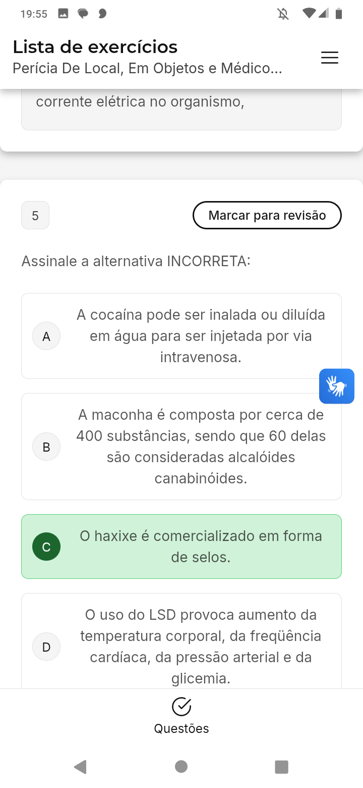 19:55 Lista de exercícios Perícia De Local, Em Objetos e Médico... corrente elétrica no organismo, 5 Marcar para revisão Assinale a alternativa INCORRETA: A cocaína pode ser inalada ou diluída A em água para ser injetada por via intravenosa. A maconha é composta por cerca de 400 substâncias, sendo que 60 delas são consideradas alcalóides canabinóides. haxixe é comercializado em forma de selos. uso do LSD provoca aumento da temperatura corporal, da freqüência D cardíaca, da pressão arterial e da glicemia. Questões
