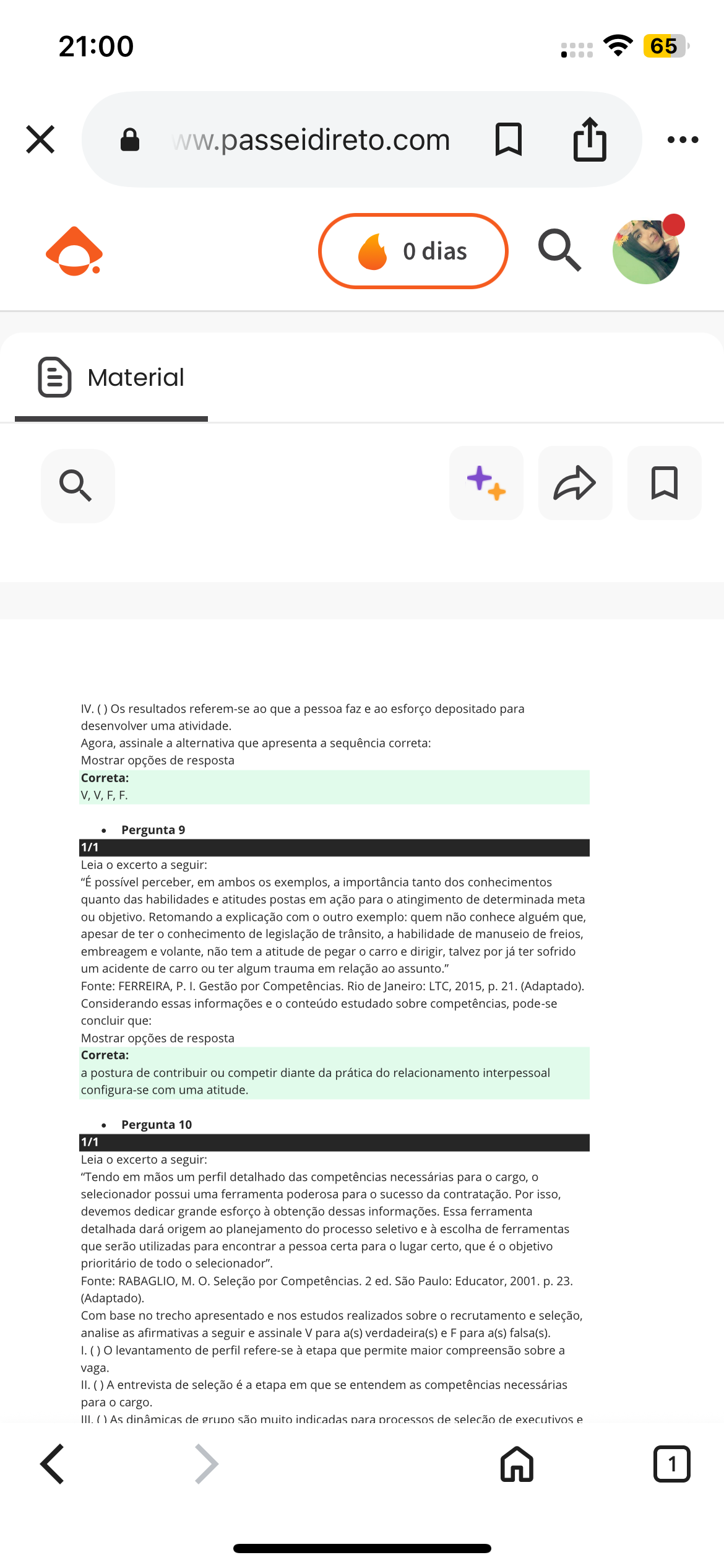 21:00 65 X ww.passeidireto.com 0 dias Material IV. () Os resultados referem-se ao que a pessoa faz e ao esforço depositado para desenvolver uma atividade. Agora, assinale a alternativa que apresenta a sequência correta: Mostrar opções de resposta Correta: Pergunta 9 1/1 Leia excerto a seguir: possível perceber, em ambos os exemplos, a importância tanto dos conhecimentos quanto das habilidades e atitudes postas em ação para atingimento de determinada meta ou objetivo. Retomando a explicação com outro exemplo: quem não conhece alguém que, apesar de ter conhecimento de legislação de trânsito, a habilidade de manuseio de freios, embreagem e volante, não tem a atitude de pegar carro e dirigir, talvez por já ter sofrido um acidente de carro ou ter algum trauma em relação ao assunto." Fonte: FERREIRA, P.I. Gestão por Competências. Rio de Janeiro: LTC, 2015, p. 21. (Adaptado). Considerando essas informações e conteúdo estudado sobre competências, pode-se concluir que: Mostrar opções de resposta Correta: a postura de contribuir ou competir diante da prática do relacionamento interpessoal configura-se com uma atitude. Pergunta 10 1/1 Leia excerto a seguir: "Tendo em mãos um perfil detalhado das competências necessárias para cargo, selecionador possui uma ferramenta poderosa para sucesso da contratação. Por isso, devemos dedicar grande esforço à obtenção dessas informações. Essa ferramenta detalhada dará origem ao planejamento do processo seletivo e à escolha de ferramentas que serão utilizadas para encontrar a pessoa certa para lugar certo, que é objetivo prioritário de todo selecionador". Fonte: RABAGLIO, M. Seleção por Competências. 2 ed. São Paulo: Educator, 2001. 23. (Adaptado). Com base no trecho apresentado e nos estudos realizados sobre recrutamento e seleção, analise as afirmativas a seguir e assinale V para a(s) verdadeira(s) e F para a(s) falsa(s). levantamento de perfil refere-se à etapa que permite maior compreensão sobre a vaga. II. () A entrevista de seleção é a etapa em que se entendem as competências necessárias para cargo. III. As dinâmicas de grupo são muito indicadas para processos de seleção de executivos e 1