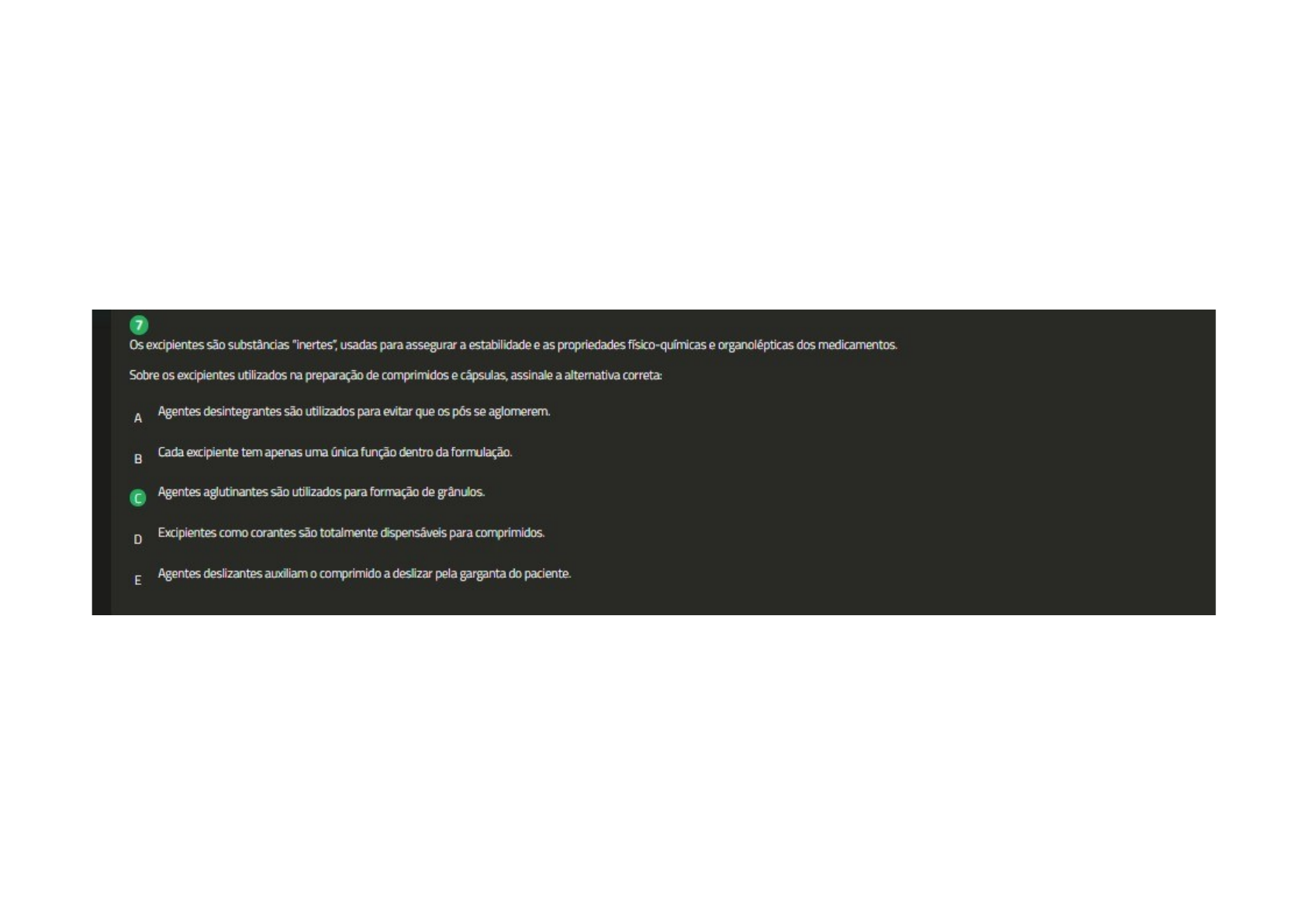 7 Os excipientes são substâncias "inertes", usadas para assegurar a estabilidade e as propriedades físico-químicas e organolépticas dos medicamentos. Sobre os excipientes utilizados na preparação de comprimidos e cápsulas, assinale a alternativa correta: A Agentes desintegrantes são utilizados para evitar que os pós se aglomerem. Cada excipiente tem apenas uma única função dentro da formulação. Agentes aglutinantes são utilizados para formação de grânulos. D Excipientes como corantes são totalmente dispensáveis para comprimidos. E Agentes deslizantes auxiliam 0 comprimido a deslizar pela garganta do paciente.