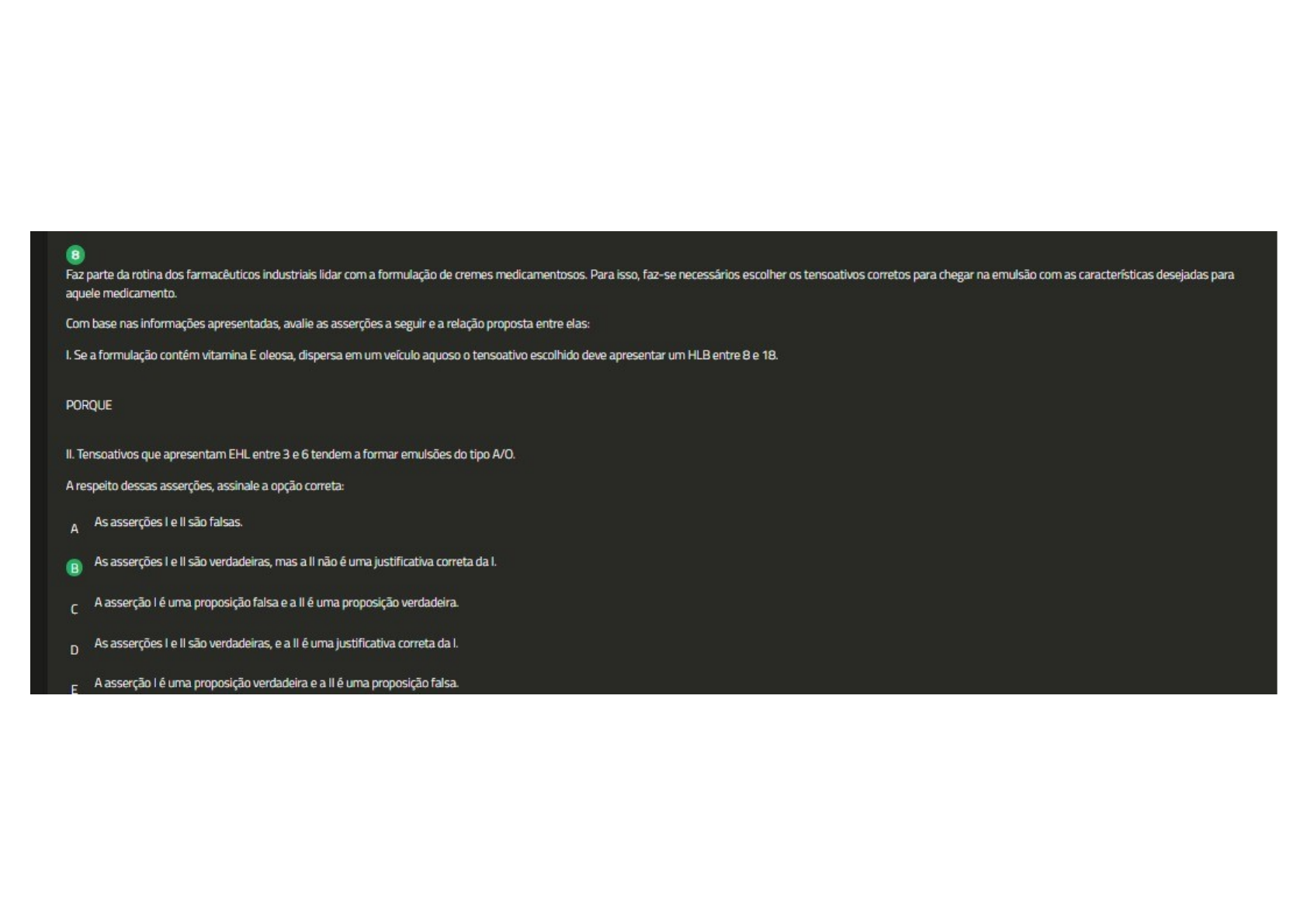 8 Faz parte da rotina dos farmacêuticos industriais lidar com a formulação de cremes medicamentosos. Para isso, faz-se necessários escolher os tensoativos corretos para chegar na emulsão com as características desejadas para aquele medicamento. Com base nas informações apresentadas, avalie as asserções a seguir e a relação proposta entre elas: I. Se a formulação contém vitamina E oleosa, dispersa em um veículo aquoso 0 tensoativo escolhido deve apresentar um HLB entre 8 e 18. PORQUE Tensoativos que apresentam EHL entre 3 e 6 tendem a formar emulsões do tipo A/O. A respeito dessas asserções, assinale a opção correta: A As asserções le são falsas. As asserções I e são verdadeiras, mas a II não é uma justificativa correta da I. A asserção lé uma proposição falsa e a é uma proposição verdadeira. D As asserções I e são verdadeiras, e a é uma justificativa correta da I. E A asserção lé uma proposição verdadeira e a é uma proposição falsa.