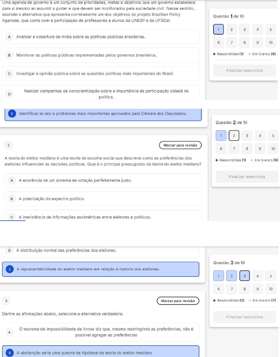 EXERCICIO Tema 7 - Implementação de Políticas Públicas- 10,0 ACERTOS 1 Uma agenda de governo é um conjunto de prioridades, metas e objetivos que um governo estabelece para si mesmo ao assumir o poder e que devem ser monitorados pela sociedade civil. Nesse sentido, assinale a alternativa que apresenta corretamente um dos objetivos do projeto Brazilian Policy Agendas, que conta com a participação de professores e alunos da UNESP e da UFSCar. Analisar a cobertura da mídia sobre as políticas públicas brasileiras. LETRA: E 2 A teoria do eleitor mediano é uma teoria da escolha social que descreve como as preferências da Petrobras influenciam as decisões políticas. Qual é o principal pressuposto da teoria do eleitor mediano? LETRA: E 3 Dentre as afirmações abaixo, selecione a alternativa verdadeira: A- O teorema da impossibilidade de Arrow diz que, mesmo restringindo as preferências, não é possível agregar as preferências B- A abstenção seria uma quebra de hipótese da teoria do eleitor mediano C- Preferências com pico múltiplo indicam que as preferências podem ser agregadas sem problemas D- Plebiscito não é uma ferramenta de democracia direta E- De acordo com a teoria do eleitor mediano, os candidatos não buscam a maximização dos votos. LETRA: A 4 Dentre as afirmações abaixo, selecione a alternativa incorreta sobre a teoria da escolha pública: A- Os burocratas buscam maximizar o bem-estar da sociedade. B- A teoria quebra a hipótese de Estado benevolente. C- Nem sempre as privatizações são eficientes. D- O governo contratar empresas privadas para fornecer serviços públicos pode ser um instrumento eficiente. E- A teoria do Leviatã tem como premissa que a burocrata e o órgão do governo funcionem como um ser. LETRA: A 5 Dentre as afirmações abaixo, selecione a alternativa incorreta sobre Definição de agenda: A- O processo de Definição de agenda possui diversas dimensões, como a agenda institucional B- A última dimensão da Definição de agenda é a agenda de decisão C- Os indicadores podem interferir sozinhos na agenda política D- Desamparo e controle é uma narrativa que possui relação com a transformação de um assunto de interesse para o problema E- Eventos em foco são situações que podem ajudar na mudança da agenda política. LETRA: A 6 Com o quadro de preferências abaixo, podemos afirmar que: Manoel Joaquim Pedro 1 C B A 2 A C B 3 B A C A- Uma votação majoritária não violaria a propriedade de transitividade B- Uma votação majoritária agregaria as preferências C- Uma votação majoritária teria o projeto A eleito. LETRA: D 7 Dentre as afirmações abaixo, selecione a alternativa correta a respeito do modelo de Lindahl: A- O modelo de Lindahl segue o princípio do benefício para cobrar impostos. B- As pessoas possuem incentivos para revelar sua disposição a pagar pelo bem público. C- As pessoas sempre têm conhecimento sobre a precificação do bem público. D- O modelo de Lindahl prevê a taxa paga pelo consumidor igual ao custo marginal dividido pelo número de pessoas beneficiadas pelo bem público. E- Não existem consumidores nesse modelo. LETRA: D 8 A implementação eficaz de políticas públicas requer mecanismos de controle e prestação de contas que garantam que os recursos públicos sejam utilizados de maneira adequada e que os interesses da sociedade sejam protegidos. Um desses mecanismos é o "accountability", um termo que tem destaque no cenário brasileiro. O que é accountability no contexto do controle de políticas públicas no Brasil? A- Um instrumento para promover a centralização do poder em órgãos públicos. B- Um mecanismo de controle utilizado exclusivamente por órgãos do Poder Executivo. C- Um processo que requer profissionais especializados, necessariamente da iniciativa privada. D- Um instrumento importante para controlar o comportamento dos burocratas, envolvendo.... LETRA: D 9 Dentre as afirmações abaixo, selecione a alternativa incorreta sobre os mecanismos de controle do governo: A- O TCU é responsável por fiscalizar se o governo está cumprindo a LRF B- O procurador-geral da república é o responsável pelo MPF e pelo MPU C- O chefe da CGU é indicado pelo presidente da república D- A Polícia Federal tem como uma de suas funções punir irregularidades praticadas por funcionários públicos E- O TCU tem ministros escolhidos pelo Congresso Nacional e pelo presidente da república. LETRA: D 10 No Brasil, existem diversos órgãos responsáveis por fiscalizar e monitorar a aplicação dos recursos públicos e a gestão dos órgãos públicos. Esses órgãos são fundamentais para garantir a transparência, a eficiência e a legalidade das ações do Estado. Nesse sentido, qual órgão é responsável por realizar auditorias e fiscalizações nos órgãos públicos no Brasil? A- Receita Federal. B- Tribunal de Contas da União (TCU). C- Controladoria Geral da União (CGU). D- Ministério da Economia. E- Supremo Tribunal Federal (STF). LETRA: B image6.png image7.png image8.png image9.png image10.png image11.png image12.png image13.png image1.png image2.png image3.png image4.png image5.png
