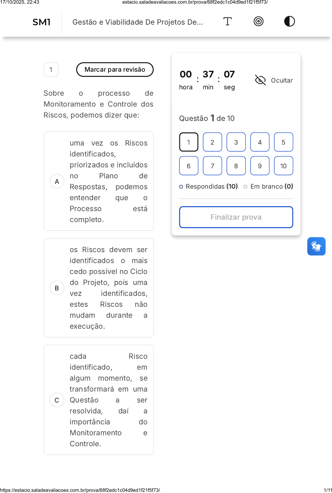 A B C 1 Marcar para revisão Sobre o processo de Monitoramento e Controle dos Riscos, podemos dizer que: uma vez os Riscos identificados, priorizados e incluídos no Plano de Respostas, podemos entender que o Processo está completo. os Riscos devem ser identificados o mais cedo possível no Ciclo do Projeto, pois uma vez identificados, estes Riscos não mudam durante a execução. cada Risco identificado, em algum momento, se transformará em uma Questão a ser resolvida, daí a importância do Monitoramento e Controle. 00 hora : 37 min : 07 seg Ocultar Questão 1 de 10 Respondidas (10) Em branco (0) Finalizar prova 1 2 3 4 5 6 7 8 9 10 SM1 Gestão e Viabilidade De Projetos De… 17/10/2025, 22:43 estacio.saladeavaliacoes.com.br/prova/68f2edc1c04d9ed1f21f5f73/ https://estacio.saladeavaliacoes.com.br/prova/68f2edc1c04d9ed1f21f5f73/ 1/11 D E A B é na fase de Proposta que todos os Riscos são efetivamente identificados, pois de outra forma não haveria como considerar no Orçamento. o Monitoramento e Controle dos Riscos deve ser contínuo, mesmo porque, por se tratar de um processo dinâmico, Riscos novos podem surgir. 2 Marcar para revisão Quando dizemos que Risco é uma condição incerta, significa que: o Risco pode ter um impacto negativo ou positivo no Projeto. o Risco é muito relativo e depende do tipo de Contrato feito entre as partes. 17/10/2025, 22:43 estacio.saladeavaliacoes.com.br/prova/68f2edc1c04d9ed1f21f5f73/ https://estacio.saladeavaliacoes.com.br/prova/68f2edc1c04d9ed1f21f5f73/ 2/11 C D E A B o Risco está sempre associado a uma Probabilidade. Assim, pode ou não se materializar. a incerteza quanto à ocorrência significa o desconhecimento quanto à gravidade do impacto. os Riscos, uma vez identificados com precisão, têm uma grande probabilidade de se materializar. 3 Marcar para revisão O PMBOK determina seis processos para o gerenciamento dos recursos. Qual desses processos é responsável pela elaboração da documentação de funções, responsabilidades e habilidades dos recursos? Planejar o Gerenciamento dos Recursos Estimar os Recursos das Atividades 17/10/2025, 22:43 estacio.saladeavaliacoes.com.br/prova/68f2edc1c04d9ed1f21f5f73/ https://estacio.saladeavaliacoes.com.br/prova/68f2edc1c04d9ed1f21f5f73/ 3/11 C D E Adquirir Recursos Desenvolver a Equipe Gerenciar a Equipe 4 Marcar para revisão O PMBOK define quatro processos quando se trata do gerenciamento de custos. Nesse contexto, avalie as asserções abaixo e a relação entre elas. I - A estimativa de custos de um projeto é realizada com base nas informações que se conhecem naquele momento. PORQUE II - Uma vez realizada as estimativas não são necessárias validações e refinações futuras. Assinale a alternativa correta: 17/10/2025, 22:43 estacio.saladeavaliacoes.com.br/prova/68f2edc1c04d9ed1f21f5f73/ https://estacio.saladeavaliacoes.com.br/prova/68f2edc1c04d9ed1f21f5f73/ 4/11 A B C D E A asserção I é uma proposição falsa, e a II é uma proposição verdadeira. As asserções I e II são proposições verdadeiras, mas a II não é uma justificativa da I. As asserções I e II são proposições verdadeiras, e a II é uma justificativa da I. As asserções I e II são proposições falsas. A asserção I é uma proposição verdadeira, e a II é uma proposição falsa. 5 Marcar para revisão O que são "Informações Restritas"? 17/10/2025, 22:43 estacio.saladeavaliacoes.com.br/prova/68f2edc1c04d9ed1f21f5f73/ https://estacio.saladeavaliacoes.com.br/prova/68f2edc1c04d9ed1f21f5f73/ 5/11 A B C D E São informações que somente podem ser acessadas dentro da organização. São informações acessadas apenas por alguns fornecedores da organização. São informações que não precisam ser protegidas. São informações que são destinadas a um grupo específico dentro da organização. São informações que são divulgadas nas mídias (TV e Internet). 6 Marcar para revisão Quando falamos em Plano de Resposta aos Riscos, podemos afirmar que: 17/10/2025, 22:43 estacio.saladeavaliacoes.com.br/prova/68f2edc1c04d9ed1f21f5f73/ https://estacio.saladeavaliacoes.com.br/prova/68f2edc1c04d9ed1f21f5f73/ 6/11 A B C D E No Plano de resposta aos Riscos devem ser incluídos todos os Riscos identificados. Os Riscos que devem ser objeto de tratativa no Plano limitam-se àqueles que podem trazer prejuízo ao Projeto. No que se refere às estratégias para lidar com o Risco, quando falamos em Prevenir estamos falando em diminuir a probabilidade de ocorrência. Compartilhar um Risco significa garantir a materialização de um risco positivo. Quando falamos em mitigar um Risco estamos falando de diminuir a probabilidade do Risco se materializar. 7 Marcar para revisão 17/10/2025, 22:43 estacio.saladeavaliacoes.com.br/prova/68f2edc1c04d9ed1f21f5f73/ https://estacio.saladeavaliacoes.com.br/prova/68f2edc1c04d9ed1f21f5f73/ 7/11 A B C D E Quando falamos em Riscos e Questões, é certo dizer que: Riscos e Questões são palavras distintas para um mesmo conceito e tratam de ocorrências futuras que podem ou não ocorrer. um Risco sempre se tornará uma Questão a ser devidamente tratada. o grau de Severidade de uma Questão é obtido pelo produto da probabilidade pelo impacto. um Risco está sempre associado a uma probabilidade enquanto uma Questão trata de algo que já ocorreu. a priorização da Questão é obtida multiplicando a Probabilidade pelo Impacto. 17/10/2025, 22:43 estacio.saladeavaliacoes.com.br/prova/68f2edc1c04d9ed1f21f5f73/ https://estacio.saladeavaliacoes.com.br/prova/68f2edc1c04d9ed1f21f5f73/ 8/11 A B C D E 8 Marcar para revisão Quando falamos em Análise Qualitativa e Matriz de Probabilidade e Impacto, podemos afirmar que: o resultado da análise qualitativa é a priorização dos Riscos. como resultado da análise qualitativa teremos os riscos devidamente quantificados com precisão. a priorização é feita com base no impacto que o Risco pode causar ao Projeto. os riscos identificados como sendo de mai