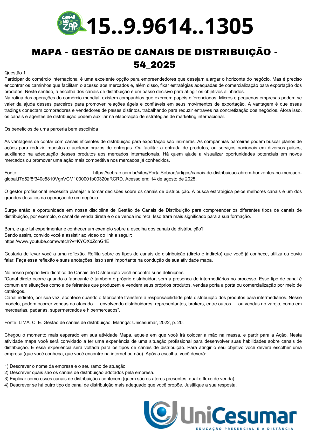 Questão 1 Participar do comércio internacional é uma excelente opção para empreendedores que desejam alargar o horizonte do negócio. Mas é preciso encontrar os caminhos que facilitam o acesso aos mercados e, além disso, fixar estratégias adequadas de comercialização para exportação dos produtos. Neste sentido, a escolha dos canais de distribuição é um passo decisivo para atingir os objetivos alinhados. Na rotina das operações do comércio mundial, existem companhias que exercem papéis diferenciados. Micros e pequenas empresas podem se valer da ajuda desses parceiros para promover relações ágeis e confiáveis em seus movimentos de exportação. A vantagem é que essas tradings conectam compradores e vendedores de países distintos, trabalhando para reduzir entraves na concretização dos negócios. Afora isso, os canais e agentes de distribuição podem auxiliar na elaboração de estratégias de marketing internacional. Os benefícios de uma parceria bem escolhida As vantagens de contar com canais eficientes de distribuição para exportação são inúmeras. As companhias parceiras podem buscar planos de ações para reduzir impostos e acelerar prazos de entregas. Ou facilitar a entrada de produtos, ou serviços nacionais em diversos países, auxiliando na adequação desses produtos aos mercados internacionais. Há quem ajude a visualizar oportunidades potenciais em novos mercados ou promover uma ação mais competitiva nos mercados já conhecidos. Fonte: https://sebrae.com.br/sites/PortalSebrae/artigos/canais-de-distribuicao-abrem-horizontes-no-mercado- global,f7d52f8f340c5810VgnVCM1000001b00320aRCRD. Acesso em: 14 de agosto de 2025. O gestor profissional necessita planejar e tomar decisões sobre os canais de distribuição. A busca estratégica pelos melhores canais é um dos grandes desafios na operação de um negócio. Surge então a oportunidade em nossa disciplina de Gestão de Canais de Distribuição para compreender os diferentes tipos de canais de distribuição, por exemplo, o canal de venda direta e o de venda indireta. Isso trará mais significado para a sua formação. Bom, e que tal experimentar e conhecer um exemplo sobre a escolha dos canais de distribuição? Sendo assim, convido você a assistir ao vídeo do link a seguir: https://www.youtube.com/watch?v=KYOXdZcnG4E Gostaria de levar você a uma reflexão. Reflita sobre os tipos de canais de distribuição (direto e indireto) que você já conhece, utiliza ou ouviu falar. Faça essa reflexão e suas anotações, isso será importante na condução de sua atividade mapa. No nosso próprio livro didático de Canais de Distribuição você encontra suas definições. “Canal direto ocorre quando o fabricante é também o próprio distribuidor, sem a presença de intermediários no processo. Esse tipo de canal é comum em situações como a de feirantes que produzem e vendem seus próprios produtos, vendas porta a porta ou comercialização por meio de catálogos. Canal indireto, por sua vez, acontece quando o fabricante transfere a responsabilidade pela distribuição dos produtos para intermediários. Nesse modelo, podem ocorrer vendas no atacado — envolvendo distribuidores, representantes, brokers, entre outros — ou vendas no varejo, como em mercearias, padarias, supermercados e hipermercados”. Fonte: LIMA, C. E. Gestão de canais de distribuição. Maringá: Unicesumar, 2022, p. 20. Chegou o momento mais esperado em sua atividade Mapa, aquele em que você irá colocar a mão na massa, e partir para a Ação. Nesta atividade mapa você será convidado a ter uma experiência de uma situação profissional para desenvolver suas habilidades sobre canais de distribuição. E essa experiência será voltada para os tipos de canais de distribuição. Para atingir o seu objetivo você deverá escolher uma empresa (que você conheça, que você encontre na internet ou não). Após a escolha, você deverá: 1) Descrever o nome da empresa e o seu ramo de atuação. 2) Descrever quais são os canais de distribuição adotados pela empresa. 3) Explicar como esses canais de distribuição acontecem (quem são os atores presentes, qual o fluxo de venda). 4) Descrever se há outro tipo de canal de distribuição mais adequado que você propõe. Justifique a sua resposta. 15..9.9614..1305 MAPA - GESTÃO DE CANAIS DE DISTRIBUIÇÃO - 54_2025 https://www.instagram.com/excellenceeducacional/p/DG1XaOaREOS/ https://www.instagram.com/excellenceeducacional/p/DG1XaOaREOS/