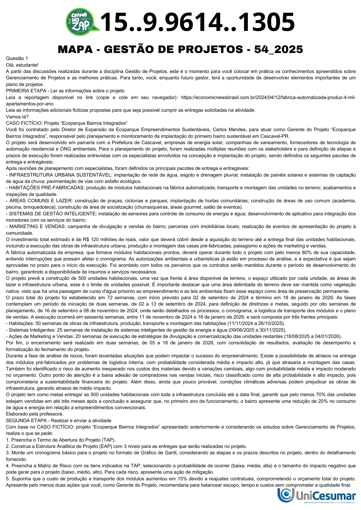 Questão 1 Olá, estudante! A partir das discussões realizadas durante a disciplina Gestão de Projetos, este é o momento para você colocar em prática os conhecimentos apreendidos sobre Gerenciamento de Projetos e as melhores práticas. Para tanto, você, enquanto futuro gestor, terá a oportunidade de desenvolver elementos importantes de um plano de projetos. PRIMEIRA ETAPA - Ler as informações sobre o projeto Leia a reportagem disponível no link (copie e cole em seu navegador): https://economicnewsbrasil.com.br/2024/04/12/fabrica-automatizada-produz-4-mil- apartamentos-por-ano Leia as informações adicionais fictícias propostas para que seja possível cumprir as entregas solicitadas na atividade. Vamos lá? CASO FICTÍCIO: Projeto “Ecoparque Bairros Integrados” Você foi contratado pelo Diretor de Expansão da Ecoparque Empreendimentos Sustentáveis, Carlos Mendes, para atuar como Gerente do Projeto “Ecoparque Bairros Integrados”, responsável pelo planejamento e monitoramento da implantação do primeiro bairro sustentável em Cascavel-PR. O projeto será desenvolvido em parceria com a Prefeitura de Cascavel, empresas de energia solar, companhias de saneamento, fornecedores de tecnologia de automação residencial e ONG ambientais. Para o planejamento do projeto, foram realizadas múltiplas reuniões com os stakeholders e para definição de etapas e prazos de execução foram realizadas entrevistas com os especialistas envolvidos na concepção e implantação do projeto, sendo definidos os seguintes pacotes de entrega e entregáveis: Após reuniões de planejamento com especialistas, foram definidos os principais pacotes de entrega e entregáveis: - INFRAESTRUTURA URBANA SUSTENTÁVEL: implantação de rede de água, esgoto e drenagem pluvial; instalação de painéis solares e sistemas de captação de água da chuva; pavimentação de vias com asfalto ecológico. - HABITAÇÕES PRÉ-FABRICADAS: produção de módulos habitacionais na fábrica automatizada; transporte e montagem das unidades no terreno; acabamentos e inspeções de qualidade. - ÁREAS COMUNS E LAZER: construção de praças, ciclovias e parques; implantação de hortas comunitárias; construção de áreas de uso comum (academia, piscina, brinquedoteca); construção de área de socialização (churrasqueiras, áreas gourmet, salão de eventos). - SISTEMAS DE GESTÃO INTELIGENTE: instalação de sensores para controle de consumo de energia e água; desenvolvimento de aplicativo para integração dos moradores com os serviços do bairro; - MARKETING E VENDAS: campanha de divulgação e vendas do bairro; parcerias com imobiliárias locais; realização de eventos de apresentação do projeto à comunidade. O investimento total estimado é de R$ 120 milhões de reais, valor que deverá cobrir desde a aquisição do terreno até a entrega final das unidades habitacionais, incluindo a execução das obras de infraestrutura urbana, produção e montagem das casas pré-fabricadas, paisagismo e ações de marketing e vendas. A fábrica automatizada da empresa, que fornece módulos habitacionais prontos, deverá operar durante todo o projeto com pelo menos 80% de sua capacidade, evitando interrupções que possam afetar o cronograma. As autorizações ambientais e urbanísticas já estão em processo de análise, e a expectativa é que sejam aprovadas no prazo para o início da execução. Foi acordado com todos os parceiros que os contratos serão mantidos durante o período de desenvolvimento do bairro, garantindo a disponibilidade de insumos e serviços necessários. O projeto prevê a construção de 500 unidades habitacionais, uma vez que frente à área disponível de terreno, o espaço utilizado por cada unidade, as áreas de lazer e infraestrutura urbana, esse é o limite de unidades possível. É importante destacar que uma área delimitada do terreno deve ser mantida como vegetação nativa, visto que há uma passagem de curso d'água próximo ao empreendimento e as leis ambientais fixam esse espaço como área de preservação permanente. O prazo total do projeto foi estabelecido em 72 semanas, com início previsto para 02 de setembro de 2024 e término em 18 de janeiro de 2026. As fases contemplam um período de iniciação de duas semanas, de 02 a 13 de setembro de 2024, para definição de diretrizes e metas, seguido por oito semanas de planejamento, de 16 de setembro a 08 de novembro de 2024, onde serão detalhados os processos, o cronograma, a logística de transporte dos módulos e o plano de vendas. A execução ocorrerá em sessenta semanas, entre 11 de novembro de 2024 e 18 de janeiro de 2026, e será composta por três frentes principais: - Habitações: 50 semanas de obras de infraestrutura, produção, transporte e montagem das habitações (11/11/2024 a 26/10/2025). - Sistemas Inteligentes: 25 semanas de instalação de sistemas inteligentes de gestão de energia e água (09/06/2025 a 30/11/2025). - Ações de Marketing e Vendas: 20 semanas de execução de estratégias de divulgação e comercialização das unidades restantes (18/08/2025 a 04/01/2026). Por fim, o encerramento será realizado em duas semanas, de 05 a 18 de janeiro de 2026, com consolidação de resultados, avaliação de desempenho e formalização do fechamento do projeto. Durante a fase de análise de riscos, foram levantadas situações que podem impactar o sucesso do empreendimento. Existe a possibilidade de atrasos na entrega dos módulos pré-fabricados por problemas de logística interna, com probabilidade considerada média e impacto alto, já que atrasaria a montagem das casas. Também foi identificado o risco de aumento inesperado nos custos dos materiais devido a variações cambiais, algo com probabilidade média e impacto moderado no orçamento. Outro ponto de atenção é a baixa adesão de compradores nas vendas iniciais, risco classificado como de alta probabilidade e alto impacto, pois comprometeria 
