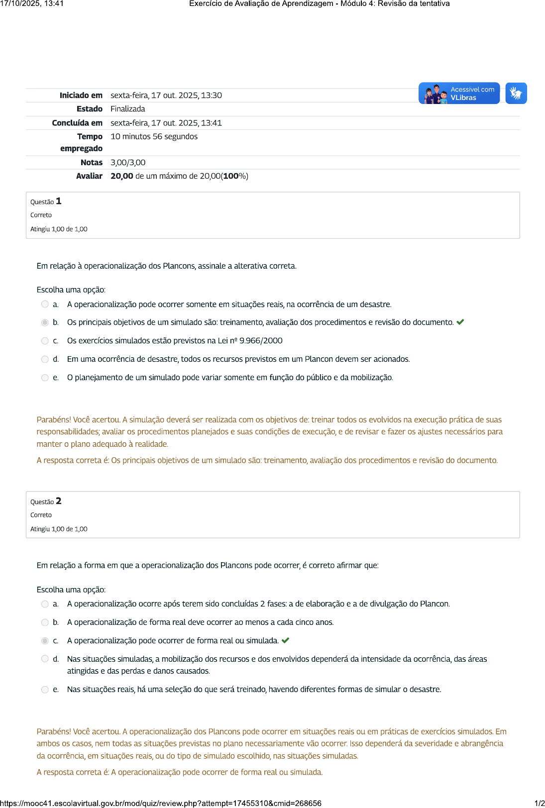 17/10/2025, 13:41 Exercício de Avaliação de Aprendizagem - Módulo 4: Revisão da tentativa Acessível com Iniciado em sexta-feira, 17 out. 2025, 13:30 VLibras Estado Finalizada Concluída em sexta-feira, 17 out. 2025, 13:41 Tempo 10 minutos 56 segundos empregado Notas 3,00/3,00 Avaliar 20,00 de um máximo de 20,00(100%) Questão 1 Correto Atingiu 1,00 de 1,00 Em relação à operacionalização dos Plancons, assinale a alterativa correta. Escolha uma opção: a. A operacionalização pode ocorrer somente em situações reais, na ocorrência de um desastre. b. Os principais objetivos de um simulado são: treinamento, avaliação dos procedimentos e revisão do documento. C. Os exercícios simulados estão previstos na Lei 9.966/2000 d. Em uma ocorrência de desastre, todos os recursos previstos em um Plancon devem ser acionados. e. planejamento de um simulado pode variar somente em função do público e da mobilização. Parabéns! Você acertou. A simulação deverá ser realizada com os objetivos de: treinar todos os evolvidos na execução prática de suas responsabilidades; avaliar os procedimentos planejados e suas condições de execução, e de revisar e fazer os ajustes necessários para manter plano adequado à realidade. A resposta correta é: Os principais objetivos de um simulado são: treinamento, avaliação dos procedimentos e revisão do documento. Questão 2 Correto Atingiu 1,00 de 1,00 Em relação a forma em que a operacionalização dos Plancons pode ocorrer, é correto afirmar que: Escolha uma opção: a. A operacionalização ocorre após terem sido concluídas 2 fases: a de elaboração e a de divulgação do Plancon. b. A operacionalização de forma real deve ocorrer ao menos a cada cinco anos. C. A operacionalização pode ocorrer de forma real ou simulada. d. Nas situações simuladas, a mobilização dos recursos e dos envolvidos dependerá da intensidade da ocorrência, das áreas atingidas e das perdas e danos causados. e. Nas situações reais, há uma seleção do que será treinado, havendo diferentes formas de simular desastre. Parabéns! Você acertou. A operacionalização dos Plancons pode ocorrer em situações reais ou em práticas de exercícios simulados. Em ambos os casos, nem todas as situações previstas no plano necessariamente vão ocorrer. Isso dependerá da severidade e abrangência da ocorrência, em situações reais, ou do tipo de simulado escolhido, nas situações simuladas. A resposta correta é: A operacionalização pode ocorrer de forma real ou simulada. 1/217/10/2025, 13:41 Exercício de Avaliação de Aprendizagem - Módulo 4: Revisão da tentativa Questão 3 Correto Atingiu 1,00 de 1,00 Assinale a opção correta sobre os aspectos referentes à revisão dos planos de contingência, podemos afirmar Acessível com VLibras Escolha uma opção: a. As revisões programadas são opcionais, pois não incluem a avaliação do Plancon. b. As revisões por situações simuladas decorrem da avaliação realizada durante 0 treinamento. C. As revisões por situações reais devem ser feitas durante a ocorrência do desastre. d. Cada tipo de revisão (programada, por simulados e por situações reais) revisa uma parte diferente do Plancon. e. Nas revisões decorrentes dos simulados, qualquer participante está apto a realizar a revisão do Plancon. Parabéns! Você acertou. As revisões são processos importantes para manter 0 Plancon adequado à realidade local e por isso não são opcionais, devendo ocorrer de maneira estruturada e com um responsável específico. A resposta correta é: As revisões por situações simuladas decorrem da avaliação realizada durante treinamento. 2/2