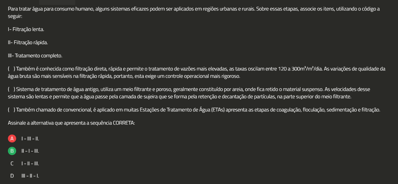 Para tratar água para consumo humano, alguns sistemas eficazes podem ser aplicados em regiões urbanas e rurais. Sobre essas etapas, associe itens, utilizando 0 código a seguir: Filtração lenta. II- Filtração rápida. III- Tratamento completo. Também é conhecida como filtração direta, rápida e permite 0 tratamento de vazões mais elevadas, as taxas oscilam entre 120 a 300m³/m²/dia. As variações de qualidade da água bruta são mais sensíveis na filtração rápida, portanto, esta exige um controle operacional mais rigoroso. Sistema de tratamento de água antigo, utiliza um meio filtrante e poroso, geralmente constituído por areia, onde fica retido 0 material suspenso. As velocidades desse sistema são lentas e permite que a água passe pela camada de sujeira que se forma pela retenção e decantação de partículas, na parte superior do meio filtrante. Também chamado de convencional, é aplicado em muitas Estações de Tratamento de Água (ETAs) apresenta as etapas de coagulação, floculação, sedimentação e filtração. Assinale a alternativa que apresenta a sequência CORRETA: A III II. III. I III. D III II I.