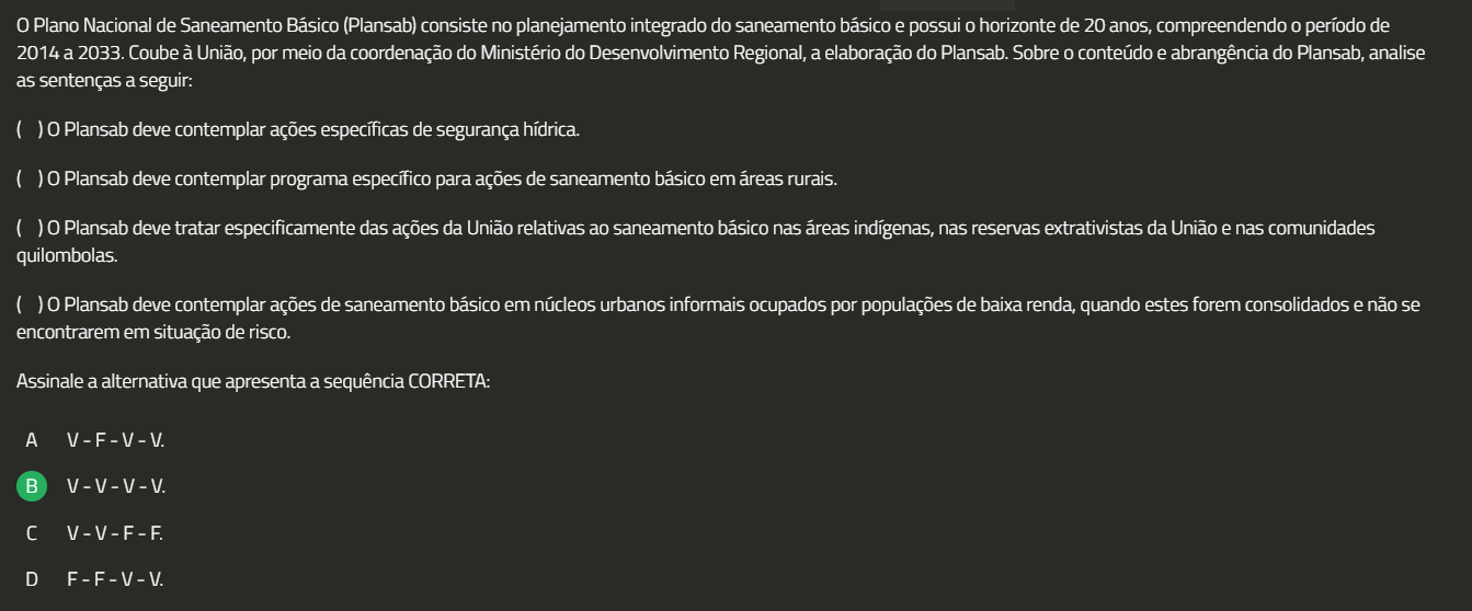 0 Plano Nacional de Saneamento Básico (Plansab) consiste no planejamento integrado do saneamento básico e possui 0 horizonte de 20 anos, compreendendo 0 período de 2014 a 2033. Coube à União, por meio da coordenação do Ministério do Desenvolvimento Regional, a elaboração do Plansab. Sobre 0 conteúdo e abrangência do Plansab, analise as sentenças a seguir: ( ) 0 Plansab deve contemplar ações específicas de segurança hídrica. ( ) 0 Plansab deve contemplar programa específico para ações de saneamento básico em áreas rurais. ( ) 0 Plansab deve tratar especificamente das ações da União relativas ao saneamento básico nas áreas indígenas, nas reservas extrativistas da União e nas comunidades quilombolas. 0 Plansab deve contemplar ações de saneamento básico em núcleos urbanos informais ocupados por populações de baixa renda, quando estes forem consolidados e não se encontrarem em situação de risco. Assinale a alternativa que apresenta a sequência CORRETA: A V-F-V-V. V-V-V-V. V-V-F-F. D F-F-V-V.