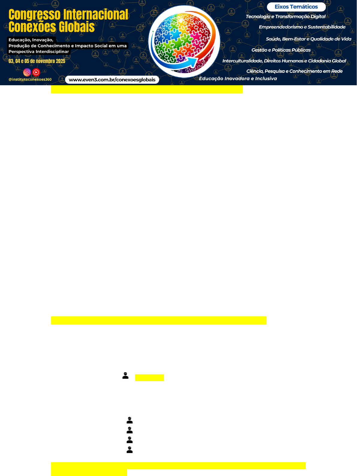 Nas páginas ímpares, a partir da página 3, inserir os sobrenomes dos autores, alinhados à esquerda, em Times, 10 pt, usando o seguinte formato: Para um autor: Silva Para dois autores: Silva e Souza Para três ou mais autores: Silva et al. Capítulo X (Não preencher, campo será preenchido pelos editores) TÍTULO DO CAPÍTULO (TIMES, CAIXA ALTA, 14 pt., NEGRITO, ESPAÇAMENTO SIMPLES, ALINHADO À ESQUERDA NÃO DEVE ULTRAPASSAR TRÊS LINHAS). Registrar os nomes dos autores (Times 12, espaçamento simples, alinhados à esquerda). Nome completo do autor principal1 Nome completo do autor2 Nome completo do autor3 Nome completo do autor4 Nome completo do autor5 Resumo (Times, 12 pt., negrito): O Resumo é um texto conciso e com linguagem objetiva, evitando retirar frases inteiras do texto original, sem citações diretas ou indiretas e de símbolos. Deverá ser escrito em parágrafo único, contendo as principais informações, como a introdução, o objetivo de pesquisa, a metodologia utilizada, os principais resultados, discussão e as considerações finais. Deve conter entre 200 e 250 palavras (Times, 12 pt., justificado, espaçamento simples). Registre de três a cinco palavras-chave após o Resumo. Elas devem ser apresentadas em ordem alfabética, separadas por ponto final. Apenas a primeira letra maiúscula. (Times, 12 pt., justificado). Palavras-chave (Times, 12 pt., negrito): Palavra 1. Palavra 2. Palavra 3. Palavra 4. Palavra 5. [Iniciar o corpo do texto na próxima página, mesmo que sobre espaço] TÓPICOS (OS TÍTULOS DOS TÓPICOS DEVERÃO SER REDIGIDOS EM TIMES, CAIXA ALTA, 12 pt., NEGRITO, ALINHADOS À ESQUERDA, E NÃO DEVERÁ ULTRAPASSAR A EXTENSÃO DE UMA LINHA. NÃO ENUMERAR OU PONTUAR) Subtópicos (Times, 12 pt., negrito, apenas a inicial maiúscula, alinhado à esquerda) O texto deve ser redigido em Times, 12 pt. Deverá seguir as Normas e Diretrizes do Edital e do Modelo. O espaçamento entre linhas deve ser simples, sendo necessário adicionar um espaço simples (1,0) apenas entre os tópicos e subtópicos. Colocar recuo de 1,25 na primeira linha de cada parágrafo. Itálico deve ser utilizado apenas para expressões estrangeiras. Não utilizar sublinhado. Os Artigos deverão ter a extensão entre 10 e 15 páginas e seguir as normas e diretrizes do Edital e deste Modelo. Qualquer dúvida entre em contato pelo endereço eletrônico institutoconexoes@outlook.com O espaçamento entre linhas deve ser simples, sendo necessário adicionar um espaço simples (1,0) apenas: entre os tópicos e subtópicos; após citações diretas com mais de três linhas; antes e depois de ilustrações (quadros, tabelas, figuras, gráficos); antes e após textos apresentados na forma de lista, utilizando marcadores (como no exemplo da estrutura do texto apresentado abaixo). Colocar recuo de 1,25 na primeira linha de cada parágrafo. Itálico deve ser utilizado apenas para expressões estrangeiras. Não utilizar sublinhado. Este documento já se encontra no padrão proposto e pode ser editado para acomodar o seu Artigo. O arquivo final do Capítulo de Livro deve ser submetido em formato WORD (doc; docx), com envio em duas formas: um arquivo com a identificação dos autores e o segundo arquivo sem nenhuma identificação dos autores. Sugere-se que o trabalho tenha a seguinte estrutura: · INTRODUÇÃO: A Introdução deve conter: contextualização do problema de pesquisa, questão de pesquisa, objetivos e justificativa. · METODOLOGIA: A Metodologia deve apresentar as características da pesquisa, os procedimentos para a coleta de dados e a técnica de análise dos dados utilizada. · RESULTADOS E DISCUSSÕES: Esta seção é destinada a apresentar e discutir os resultados da pesquisa. Sugere-se a utilização de ilustrações em forma de gráficos, quadros e figuras. Certifique-se de que as ilustrações estejam legíveis · CONSIDERAÇÕES FINAIS: É importante aprofundar a argumentação nas conclusões, além de mencionar se o objetivo do estudo foi plenamente atendido. Incluir sugestões de continuidade do trabalho. · Agradecimentos (quando houver): Podem ser mencionadas as expressões de reconhecimento a colaboradores, entidades e agências. · REFERÊNCIAS: esse item deve conter os dados de qualquer citação feita no texto. As referências bibliográficas deverão atender às Normas da ABNT/NBR-6023, ou as Normas da APA 7ª. Edição 2020. Formatação de Subtópicos (Times, 12 pt., negrito, apenas a inicial maiúscula) Os textos deverão seguir as Normas da ABNT NBR 10520:2023 para citação, ou as Normas da APA 7ª. Edição 2020. As referências poderão ser elaboradas utilizando-se apenas os elementos essenciais da Norma ABNT NBR 6023:2018, ou das Normas da APA 7ª. Edição 2020. A adequada formatação das referências é de responsabilidade dos autores e influenciará na avaliação dos trabalhos. ILUSTRAÇÕES Para ilustrações do tipo gráficas, fotografias e ilustrações/esquemas deverá ser utilizado o tempo Figura. As Figuras devem ser relacionadas no corpo do texto o mais próximo possível, utilizando-se as seguintes formatações: Figura 1 quando no meio da sentença ou (FIGURA 1) quando no final da sentença. A figura deverá apresentar uma legenda acima da figura e centralizada, numerada sequencialmente, e a fonte deve ser apontada abaixo do texto e centralizada, e deve-se separar a figura do texto com espaço simples antes da legenda e após a fonte, desse modo: Figura 1 - (Times New Roman, tamanho 10 e em negrito) - Título da Figura. (Times New Roman, tamanho 10, primeira letra Maiúscula, centralizado e com espaçamento simples). Fonte: Deve-se indicar a entidade responsável pelo levantamento dos dados. Utilize a fonte Times New Roman, tamanho 10, centralizado e com espaçamento simples. Os Quadros deverão ser utilizados para apresentar compilados de dados de outros autores, organizados pelo autor (numéricos ou não). Os quadros deverão ser relacionados no 