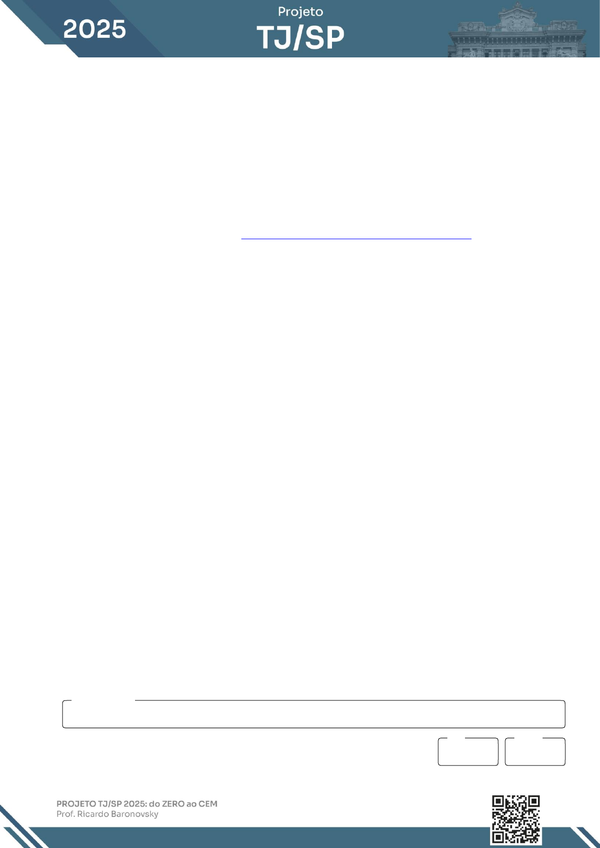 1 1º SIMULADO INÉDITO 001. PROVA OBJETIVA ESCREVENTE TÉCNICO JUDICIÁRIO CURSO COMPLETO - https://go.hotmart.com/L98840369Y?dp=1 ⬥ Este Simulado foi construído observando os mesmos moldes e perfil da sua prova (já no pós-edital 2025). ⬥ No dia oficial, você terá 5 (cinco) horas para resolver 70 questões com 5 (cinco) alternativas (além do Gabarito e Redação) ⬥ Por isto, lembre-se em distribuir seu tempo de prova, contemplando estas "três partes" – por exemplo: 200 minutos para a Prova Objetiva (cerca de 2,8 minutos por questão) + 60 minutos para a Redação + 40 minutos para o Gabarito. ⬥ As questões deste simulado foram elaboradas (i) nos moldes do novo formato de prova do TJ/SP (edital de 2025); (ii) no "novo perfil da VUNESP"; (iii) na quantidade esperada de questões por matéria; (iv) com foco nos temas preferidos pelo seu certame nas últimas provas; e (v) seguindo, inclusive, a mesma diagramação do caderno de provas da VUNESP. ⬥ Recomendo - também no dia da prova - que façam pelo menos uma pausa rápida para se alimentar, beber água e/ou usar o banheiro. ⬥ Tenha sobre sua mesa apenas um relógio e os itens necessários para resolver o simulado (acaso deseje imprimir ele). ⬥ Deixe todas as distrações longe, principalmente o celular. ⬥ Não caia na tentação de tentar localizar as questões durante o simulado. Se porventura você ficar ansioso em descobrir uma resposta, marque a questão e confira ela somente após terminar todas as 70 questões. ⬥ Um dia antes de realizar o simulado - se possível - peça a compreensão dos familiares e coabitantes para que respeitem estes "200 minutos" do seu treino. ⬥ Por fim, espero que resolva as questões com a maior seriedade possível. Este simulado será um excelente diagnóstico dos pontos que você precisa estudar para chegar em alta performance. Boa prova! Prof. Ricardo Baronovsky. AGUARDE DOMINGO (PREFERENCIALMENTE) PARA REALIZAR ESTE SIMULADO. Sala Carteira Nome do candidato https://go.hotmart.com/L98840369Y?dp=1 1 LÍNGUA PORTUGUESA 1. A informação pressuposta na história em quadrinhos é: (A) Nem sempre o que é proibido pode ser feito. (B) A juba do leão não é um lugar adequado para grudar chiclete. (C) A criança não deveria estar mascando chiclete nesse lugar. (D) A proibição de uma ação pode despertar um desejo de realizá-la. (E) O leão não deve ingerir alimentos humanos. 2. No primeiro quadrinho, o núcleo do sujeito do verbo “é” encontra-se na alternativa: (A) proibido (B) grudar (C) chiclete (D) juba (E) leão A série “Adolescência” e o recado da geração Alfa para o ensino superior Brilhante, impactante, disruptiva e paradoxalmente brutal sem apresentar nenhuma cena explícita de violência. Adolescência é a mais nova série que figura no topo da lista das mais vistas nas últimas semanas e, reconhecidamente, como uma das mais inovadoras, seja na forma como foi filmada (plano- sequência), assim como na maneira que aborda um assunto que vem causando um profundo incômodo nas famílias, nas instituições de ensino e na sociedade como um todo. Adolescência não é uma série de ficção policial que tem como objetivo descobrir quem matou, mas instigar uma desafiadora reflexão sobre por que nossos adolescentes vêm cometendo atitudes extremas, sem um “motivo aparente”. A chamada geração Alfa (nascidos a partir de 2010) traz preocupações e enfrentamentos diferentes das gerações nascidas nas décadas anteriores. Os pais dessas gerações temiam os perigos existentes nas ruas – o mal a que estávamos expostos nesse ambiente. Hoje esse medo ainda é real e pertinente, mas para os pais da geração Alfa ainda existe um novo temor, explicitado na série – o acesso a um mundo desconhecido por nós, localizado dentro das redes sociais e acessado pelos computadores desses adolescentes, de seus quartos. Um mundo digital cercado por símbolos (emojis), decifrados apenas por quem faz parte dessa geração e que colocam as gerações anteriores como totais analfabetos digitais. Insels, redpills, bluepills, teoria do 80/20, política do cancelamento, cyberbullying e manosfera são algumas das expressões que compõem o novo dialeto dessa geração, que são nativos digitais e que trazem características e comportamentos muito específicos. Na geração Alfa, a exposição à tecnologia e a telas é muito forte. Com muitos estímulos e acostumados a usar meios digitais para se entreter e buscar informações, requerem uma educação mais dinâmica, ativa, multiplataforma e personalizada. Essa geração tem como características a flexibilidade, a autonomia e um potencial maior para inovar e buscar soluções para problemas de forma colaborativa. Gostam de ser protagonistas, colocar a mão na massa e aprender com situações concretas. 2 A geração Alfa não escreve mais cartas, manda mensagens pelo WhatsApp ou pelas redes sociais. Não faz mais diários, posta vídeos no TikTok, ou propaga suas ideias via X (antigo Twitter). As pesquisas já não são mais feitas em enciclopédias, mas sim no “Senhor Google”. A geração Alfa, com seus símbolos e comportamentos próprios, escancarados na série Adolescência, atualmente está com seus representantes mais velhos na casa dos 15 anos e mais dois ou três anos ocuparão as salas do ensino superior. Não podemos ainda esquecer que a partir de 2020 temos uma nova geração, a Beta, nativos da inteligência artificial… (Hugo Tourinho Filho) (in: https://jornal.usp.br/) 3. Com base no texto, assinale a alternativa com a informação correta. (A) O texto aponta que os adolescentes da geração Alfa vivem em um universo digital repleto de referências desconhecidas pelas gerações anteriores, o que demonstra uma característica atemporal em que a geração posterior procura criar formas distintas das gerações anteriores. (B) O texto permite inferir que os adolescentes da geração Alfa vivem em um univer