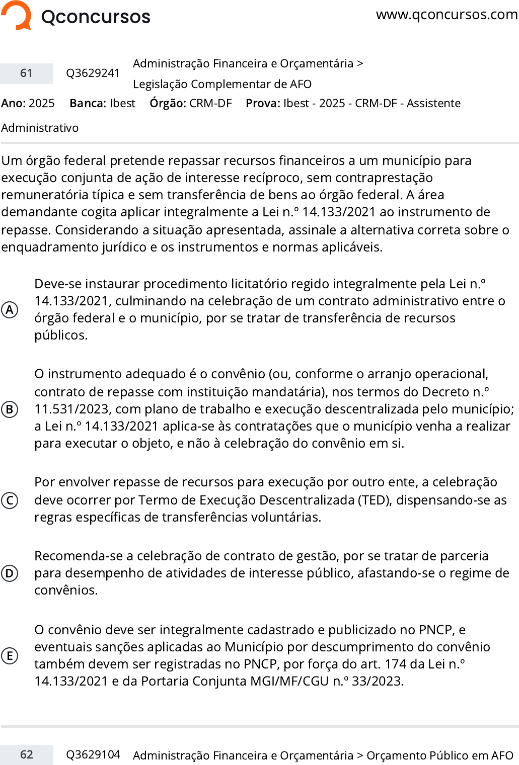 www.qconcursos.com Ano: 2025 Banca: Ibest Órgão: CRM-DF Um órgão federal pretende repassar recursos financeiros a um município para execução conjunta de ação de interesse recíproco, sem contraprestação remuneratória típica e sem transferência de bens ao órgão federal. A área demandante cogita aplicar integralmente a Lei n.º 14.133/2021 ao instrumento de repasse. Considerando a situação apresentada, assinale a alternativa correta sobre o enquadramento jurídico e os instrumentos e normas aplicáveis. A Deve-se instaurar procedimento licitatório regido integralmente pela Lei n.º 14.133/2021, culminando na celebração de um contrato administrativo entre o órgão federal e o município, por se tratar de transferência de recursos públicos. B O instrumento adequado é o convênio (ou, conforme o arranjo operacional, contrato de repasse com instituição mandatária), nos termos do Decreto n.º 11.531/2023, com plano de trabalho e execução descentralizada pelo município; a Lei n.º 14.133/2021 aplica-se às contratações que o município venha a realizar para executar o objeto, e não à celebração do convênio em si. C Por envolver repasse de recursos para execução por outro ente, a celebração deve ocorrer por Termo de Execução Descentralizada (TED), dispensando-se as regras específicas de transferências voluntárias. D Recomenda-se a celebração de contrato de gestão, por se tratar de parceria para desempenho de atividades de interesse público, afastando-se o regime de convênios. E O convênio deve ser integralmente cadastrado e publicizado no PNCP, e eventuais sanções aplicadas ao Município por descumprimento do convênio também devem ser registradas no PNCP, por força do art. 174 da Lei n.º 14.133/2021 e da Portaria Conjunta MGI/MF/CGU n.º 33/2023. 61 Q3629241 >Administração Financeira e Orçamentária Legislação Complementar de AFO Prova: Ibest - 2025 - CRM-DF - Assistente Administrativo 62 Q3629104 >Administração Financeira e Orçamentária Orçamento Público em AFO https://www.qconcursos.com/ https://www.qconcursos.com/questoes-de-concursos/bancas/ibest https://www.qconcursos.com/questoes-de-concursos/institutos/crm-df https://www.qconcursos.com/questoes-de-concursos/questoes/153fd519-9d https://www.qconcursos.com/questoes-de-concursos/disciplinas/administracao-administracao-financeira-e-orcamentaria https://www.qconcursos.com/questoes-de-concursos/disciplinas/administracao-administracao-financeira-e-orcamentaria/legislacao-complementar-de-afo https://www.qconcursos.com/questoes-de-concursos/provas/ibest-2025-crm-df-assistente-administrativo https://www.qconcursos.com/questoes-de-concursos/provas/ibest-2025-crm-df-assistente-administrativo https://www.qconcursos.com/questoes-de-concursos/questoes/9a9bdf30-9d https://www.qconcursos.com/questoes-de-concursos/disciplinas/administracao-administracao-financeira-e-orcamentaria https://www.qconcursos.com/questoes-de-concursos/disciplinas/administracao-administracao-financeira-e-orcamentaria/orcamento-publico-em-afo Ano: 2025 Banca: IV - UFG Órgão: UFG O orçamento público é um dos principais instrumentos de planejamento e gestão do Estado, servindo não apenas para controlar receitas e despesas, mas também para definir prioridades governamentais, promover a justiça social e estabilizar a economia. No âmbito das finanças públicas, ele desempenha três importantes funções, sendo elas: A repartitiva, coordenadora e equalizadora. B diretiva, redistributiva e estimuladora. C planejadora, reguladora e reorganizadora. D alocativa, distributiva e estabilizadora. Ano: 2025 Banca: UFSM Órgão: UFSM Em relação às Receitas e Despesas Públicas, assinale V (verdadeiro) ou F (falso) em cada afirmativa a seguir. ( ) As Despesas de Capital contribuem, direta mente, para a formação ou a aquisição de um bem de capital. ( ) As Receitas de Capital são arrecadadas dentro do exercício financeiro e diminuem as disponibilidades financeiras do Estado. ( ) As Receitas Correntes incluem, entre outras, arrecadação de impostos, taxas, contribuições e transferências correntes. A sequência correta é A V – V – F. B F – V – V. C F – F – V. D V – F – F. Prova: IV - UFG - 2025 - UFG - Administrador 63 Q3628808 >Administração Financeira e Orçamentária Receita Pública , Despesa Pública Prova: UFSM - 2025 - UFSM - Assistente em Administração https://www.qconcursos.com/questoes-de-concursos/bancas/iv-ufg https://www.qconcursos.com/questoes-de-concursos/institutos/ufg https://www.qconcursos.com/questoes-de-concursos/bancas/ufsm https://www.qconcursos.com/questoes-de-concursos/institutos/ufsm https://www.qconcursos.com/questoes-de-concursos/provas/iv-ufg-2025-ufg-administrador https://www.qconcursos.com/questoes-de-concursos/provas/iv-ufg-2025-ufg-administrador https://www.qconcursos.com/questoes-de-concursos/questoes/d1fc839b-9d https://www.qconcursos.com/questoes-de-concursos/disciplinas/administracao-administracao-financeira-e-orcamentaria https://www.qconcursos.com/questoes-de-concursos/disciplinas/administracao-administracao-financeira-e-orcamentaria/receita-publica https://www.qconcursos.com/questoes-de-concursos/disciplinas/administracao-administracao-financeira-e-orcamentaria/despesa-publica https://www.qconcursos.com/questoes-de-concursos/provas/ufsm-2025-ufsm-assistente-em-administracao https://www.qconcursos.com/questoes-de-concursos/provas/ufsm-2025-ufsm-assistente-em-administracao E V – F – V. Ano: 2025 Banca: UFSM Órgão: UFSM Orçamento Público é o instrumento de que dispõe o Poder Público, em qualquer de suas esferas, para expressar, em determinado período de tempo, o seu programa de atuação, discriminando a origem e o montante dos recursos a serem obtidos, bem como os dispêndios a serem efetuados. A respeito do Ciclo Orçamentário, é correto afirmar que A a fase de elaboração do orçamento é de competência exclusiva do Poder Legislativo. B