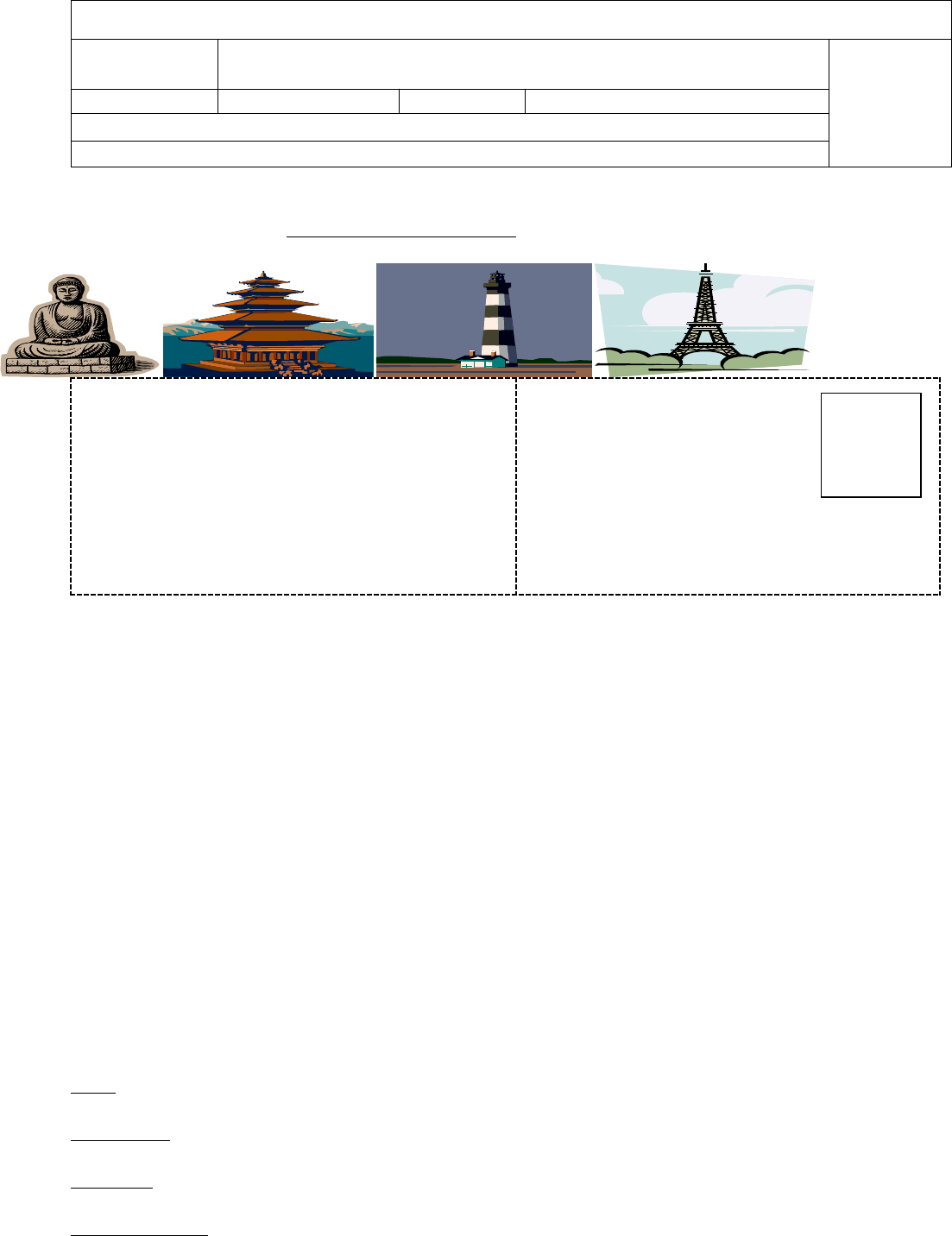 CETI – CENTRO DE ENSINO INTEGRAL PROF. PINHEIRO MACHADO Aluno (a) NOTA Professor Antenor Filho Inglês Data: Data: / / Sala: ( ) Série: ( ) Turma: ( ) Turno: ( ) 1ª Verificação da Aprendizagem – 2ª CHAMADA TEXT COMPREENSION Trade postcards with us! Correspondence this side only Send us a postcard in on envelop with your address, a postcard stamp, and what would you like to know about the ANDRILL Project, or a question you have about Antarctica, and we’ll send a postcard to you from the ice! POSTCARDPlace Correct Postage here Address only this side ARISE McMurdo station Project G-091-M PSC 469 Box 800 APO AP 96599-1035 U.S.A 01. (ENEM/2010) - Os cartões postais costumam ser utilizados por viajantes que desejam enviar noticias dos lugares que visitam, a parentes e amigos. Publicado no site do projeto ANDRILL, o texto em formato de cartão – postal tem o propósito de: a) comunicar o endereço da nova sede do projeto nos Estados Unidos. b) convidar colecionadores de cartões-postais a se reunirem em um evento. c) anunciar uma nova coleção de selos para angariar fundos para a Antártica. d) divulgar as pessoas a possibilidade de receberem um cartão-postal da Antártica. e) solicitar que as pessoas visitem o site do mencionado projeto com maior frequência. 02. (Antenor/2014) - Complete com (AM – IS – ARE) as frases abaixo. a) He ...................... a great Singer. (Ele é um grande cantor.) b) John and Paul ...................... my brothers. (John e Paul são meus irmãos.) c) I ................... a good engineer. (Eu sou um bom engenheiro.) d) They ................... my classmates. (Elas são minhas colegas de classe.) 03. (Antenor/2014) - Substitua as palavras sublinhadas pelo Pronome Pessoal correspondente. a) John is reading a good book. _______________________________________________________________________ b) Betty and I are playing tennis. _______________________________________________________________________ c) That dog is black and white. _______________________________________________________________________ d) Mary and Sally are sleeping now. _______________________________________________________________________ 04. (Antenor/2014) - Complete com THIS e THESE as frases abaixo. a) ................................. man here is my father. b) …………………….. tables were broken. c) My mother is ………..…………. woman over there. d) ……………………. hairs in my house are new. 05. (Antenor/2014) - Complete com THERE IS e THERE ARE. a) ……………………. Many monarchies in the world nowadays. b) ……………………. a new bank near this city. c) ……………………. many cars in the streets d) In my house, ………………….. a beautiful garden. 06. (Antenor/2014) - Passe para as formas Negativa e Interrogativa as frases abaixo. a) There is a new program for computers. _______________________________________________________________________ _______________________________________________________________________ b) There are many girls in my classroom. _______________________________________________________________________ _______________________________________________________________________ c) There is a yellow rose in the vase. _______________________________________________________________________ _______________________________________________________________________ d) There are two boys in the club. _______________________________________________________________________ _______________________________________________________________________ 07. (UFPI) – Assinale a alternativa correta. “............ a clock on the wall?” a) There are b) There is not c) Is there d) There were e) Are there 08. (Antenor/2014) – In my university …….. many American citizens. a) There are b) There is c) There was d) There is not e) Were there GOOD LUCK AND GOOD TEST FOR YOU! image1.wmf image2.wmf image3.wmf image4.wmf