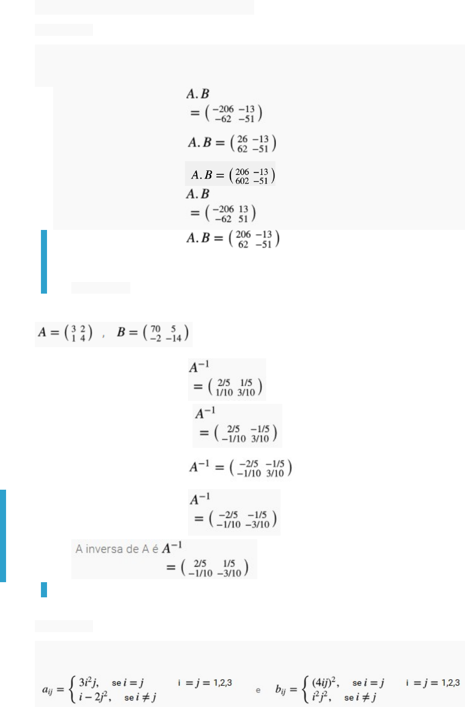 Avaliação 1 - Métodos Numéricos QUESTAO 1 Dados as seguintes matrizes A e B determine: 1. A matriz AxB é: 2. A matriz AxB é: 3. A matriz AxB é: 4. A matriz AxB é: A matriz AxB é: Correto QUESTAO 2 Dados as seguintes matrizes A e B determine: A matriz inversa de A. 1. A inversa de A é 2. A inversa de A é: Correto 3. A inversa de A é 4. A inversa de A é 5. QUESTAO 3 Dadas as leis de formação determinar as matrizes A e B correspondentes. 1. As matrizes A e B são: e 2. As matrizes A e B são: e 3. As matrizes A e B são: e Correto 4. As matrizes A e B são: e 5. As matrizes A e B são: e QUESTAO 4 Quando se fala em matrizes podemos dizer que a mesma está definida como: 1. A matriz se define com relação apenas aos números de linhas. 2. A matriz se define com relação apenas um único número relacionado aos números de linhas e colunas. 3. A matriz se define com relação aos números de linhas e colunas. Correto 4. A relação aos números de linhas e colunas não define uma matriz. 5. A matriz se define com relação apenas aos números de colunas. QUESTAO 5 Quando se fala em determinante podemos dizer que o mesmo está definido como: 1. O Determinante é a multiplicação do número de linha pelo número de colunas, 2. O Determinante é um número real associado à uma matriz linha. 3. O Determinante é um número real associado à uma matriz Quadrada de ordem n. Correto 4. O Determinante é um número real associado à uma matriz de ordem nxm, com n diferente de m. 5. O Determinante é um número real associado à uma matriz coluna. image6.png image7.png image8.png image9.png image10.png image11.png image12.png image13.png image14.png image15.png image16.png image17.png image1.png image2.png image3.png image4.png image5.png
