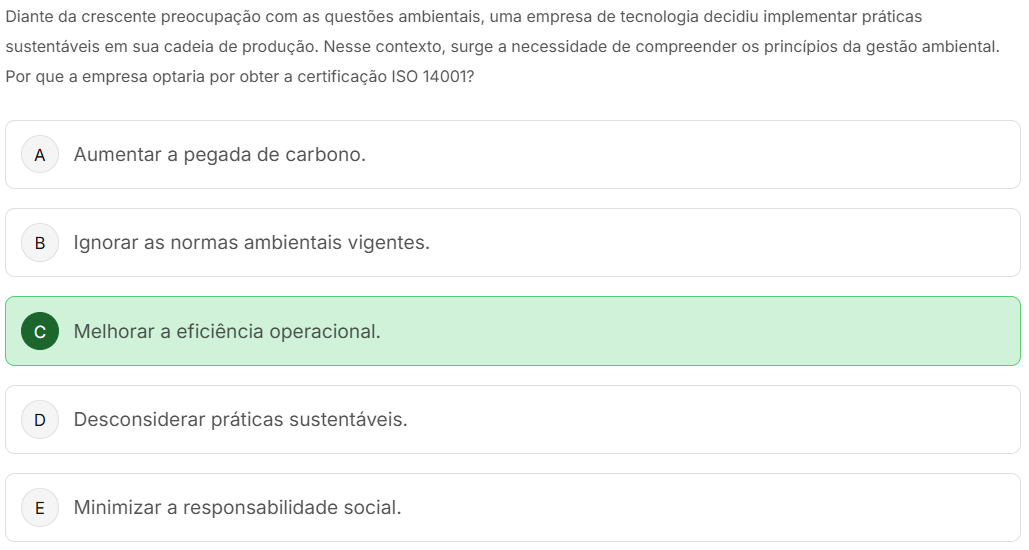 Diante da crescente preocupação com as questões ambientais, uma empresa de tecnologia decidiu implementar práticas sustentáveis em sua cadeia de produção. Nesse contexto, surge a necessidade de compreender princípios da gestão ambiental. Por que a empresa optaria por obter a certificação ISO 14001? A Aumentar a pegada de carbono. Ignorar as normas ambientais vigentes. Melhorar a eficiência operacional. D Desconsiderar práticas sustentáveis. E Minimizar a responsabilidade social.