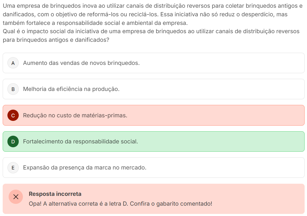 Uma empresa de brinquedos inova ao utilizar canais de distribuição reversos para coletar brinquedos antigos e danificados, com objetivo de reformá-los ou reciclá-los. Essa iniciativa não só reduz desperdício, mas também fortalece a responsabilidade social e ambiental da empresa. Qual é impacto social da iniciativa de uma empresa de brinquedos ao utilizar canais de distribuição reversos para brinquedos antigos e danificados? A Aumento das vendas de novos brinquedos. Melhoria da eficiência na produção. Redução no custo de matérias-primas. D Fortalecimento da responsabilidade social. E Expansão da presença da marca no mercado. X Resposta incorreta Opa! A alternativa correta é a letra D. Confira gabarito comentado!