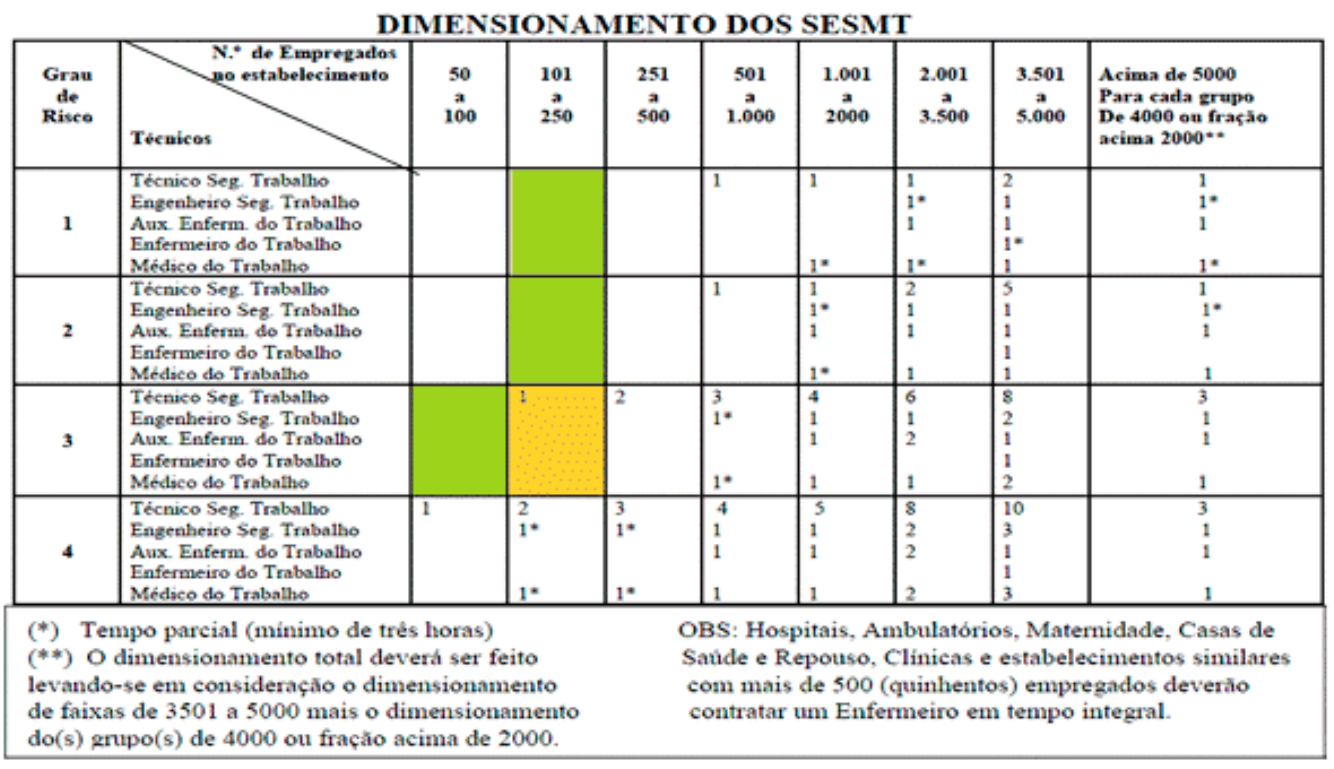 DIMENSIONAMENTO DOS SESMT de Empregados Grau no estabelecimento 50 101 251 501 1.001 2.001 3.501 Acima de 5000 de a a a a a a a Para cada grupo Risco 100 250 500 1.000 2000 3.500 5.000 De 4000 ou fração Técnicos acima 2000** Técnico Seg. Trabalho 1 2 1 Engenheiro Seg. Trabalho 1 1 Aux. Enferm. do Trabalho Enfermeiro do Trabalho Médico do Trabalho Técnico Seg. Trabalho 1 2 5 1 Engenheiro Seg. Trabalho 1 1 2 Aux. do Trabalho 1 1 1 1 Enfermeiro do Trabalho Médico do Trabalho 1 1 1 Técnico Seg. Trabalho 1 2 4 6 8 3 Engenheiro Seg. Trabalho 1 1 2 1 3 Aux. Enferm. do Trabalho 1 2 1 1 Enfermeiro do Trabalho I Médico do Trabalho 1 1 2 1 Técnico Seg. Trabalho 1 2 3 4 5 8 10 3 Engenheiro Seg. Trabalho 1 1 2 3 1 4 Aux. Enferm. do Trabalho 1 1 2 1 Enfermeiro do Trabalho 1 Médico do Trabalho 1 1 2 3 1 (*) Tempo parcial (mínimo de três horas) OBS: Hospitais, Ambulatórios, Maternidade, Casas de (**) o dimensionamento total deverá ser feito Saúde e Repouso, Clínicas estabelecimentos similares levando-se em consideração o dimensionamento com mais de 500 (quinhentos) empregados deverão de faixas de 3501 a 5000 mais o contratar um Enfermeiro em tempo integral. do(s) grupo(s) de 4000 ou fração acima de 2000.