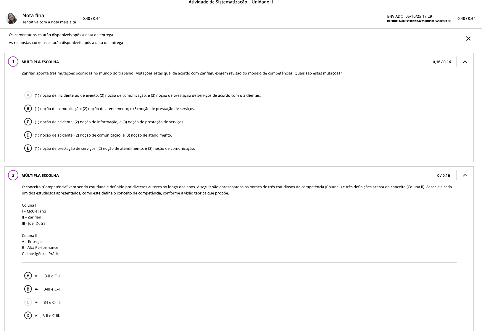 Atividade de Sistematização Unidade Nota final ENVIADO: 05/10/25 17:29 Tentativa com a nota mais alta RECIBO: 34788363FDDD42758DB580EA58C0CECC Os comentários estarão disponíveis após a data de entrega X As respostas corretas estarão disponíveis após a data de entrega 1 MÚLTIPLA ESCOLHA 0,16/0,16 Zarifian aponta três mutações ocorridas no mundo do trabalho. Mutações estas que, de acordo com Zarifian, exigem revisão do modelo de competências. Quais são estas mutações? A (1) noção de incidente ou de evento; (2) noção de comunicação; e (3) noção de prestação de serviços de acordo com a clientes. B (1) noção de comunicação; (2) noção de atendimento; e (3) noção de prestação de serviços. (1) noção de acidente; (2) noção de informação; e (3) noção de prestação de serviços. D (1) noção de acidente; (2) noção de comunicação; e (3) noção de atendimento. E (1) noção de prestação de serviços; (2) noção de atendimento; e (3) noção de comunicação. 2 MÚLTIPLA ESCOLHA conceito "Competência" vem sendo estudado e definido por diversos autores ao longo dos anos. A seguir são apresentados os nomes de três estudiosos da competência (Coluna I) e três definições acerca do conceito (Coluna II). Associe a cada um dos estudiosos apresentados, como este define conceito de competência, conforme a visão teórica que propõe. Coluna McClelland II Zarifian III Joel Dutra Coluna A Entrega Alta Performance Inteligência Prática A A- III, B-II e C-I. B A- II, B-III e C-I. A- II, B-I e C-III. D B-II e C-III.E A- III, B-I e C-II. 3 MÚLTIPLA ESCOLHA 0,16/0,16 o pesquisador francês Philippe Zarifian defende que Competência não se associa a um conjunto de qualificações do indivíduo, mas às realizações desse em determinado contexto, ou seja, a INTELIGÊNCIA PRÁTICA. Zarifian, em seu livro, Objetivo Competência por uma nova lógica, estabelece um novo modelo de competências, desenvolvendo três noções: a noção de Incidente (ou Evento), a noção de Comunicação e a noção de Serviço. Sobre a Noção de Comunicação podemos dizer que esta implica: A Rápidas mudanças e incertezas politico-econômicas que a sociedade e, as empresas por sua vez, têm enfrentado. B Crença de que tarefa que seja realizada, qualquer produto que seja fabricado, qualquer serviço que seja oferecido deve ter foco no cliente. c Dificuldade de entendimento nas organizações. D Necessidade cada vez mais premente de interação entre as diversas áreas da organização em compartilhar regras, formas de trabalho, entre outras. E Necessidade de mobilizar recursos para resolver as diversas situações com as quais se depara. 4 MÚLTIPLA ESCOLHA 0,16/0,16 Analise a definição de competência a seguir: "Competência está associada ao saber agir responsável; saber engajar-se; saber aprender; saber agir por meio de uma visão estratégica e não a um conhecimento específico." Qual estudioso utiliza tal definição? A Joel Dutra B Zarifian Le Boterf D Prahalad E McClelland