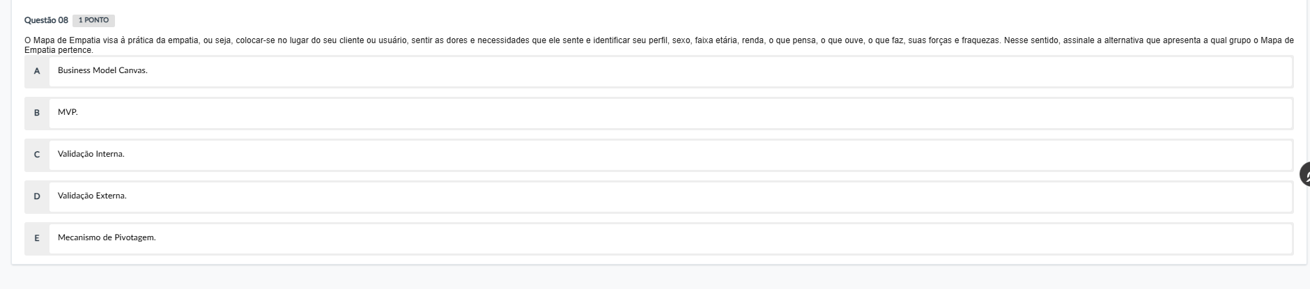 Questão 08 1 PONTO Mapa de Empatia visa à da empatia, ou seja, colocar-se no lugar do seu cliente ou usuário, sentir as dores e necessidades que ele sente e identificar seu perfil, sexo, faixa etária, renda, 0 que pensa, 0 que ouve, 0 que faz, suas forças e fraquezas. Nesse sentido, assinale a alternativa que apresenta a qual grupo 0 Mapa de Empatia pertence. A Business Model Canvas. B MVP. C Validação Interna. D Validação Externa. E Mecanismo de Pivotagem.
