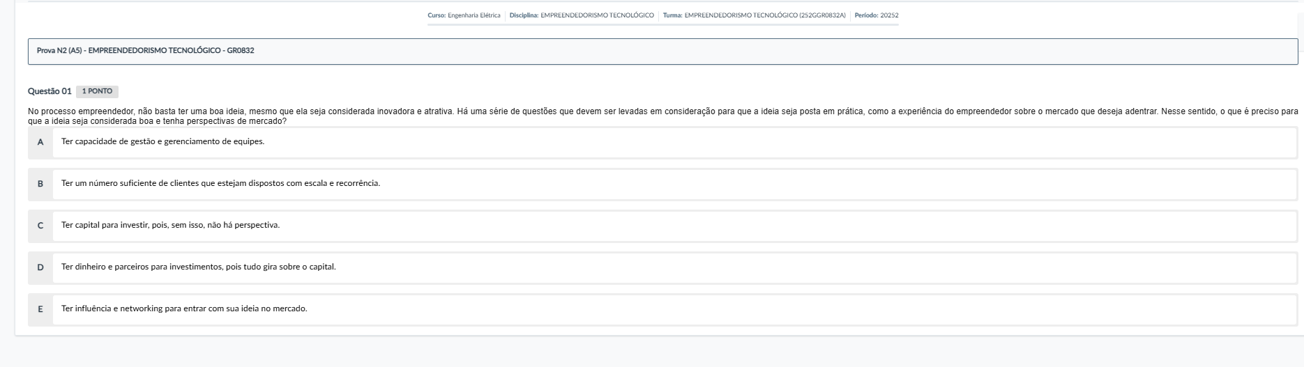 Curso: Engenharia Elétrica Disciplina: EMPREENDEDORISMO TECNOLÓGICO Turma: EMPREENDEDORISMO TECNOLÓGICO (252GGR0832A) 20252 Prova N2 (A5) EMPREENDEDORISMO TECNOLÓGICO GR0832 Questão 01 1 PONTO No processo empreendedor, não basta ter uma boa ideia, mesmo que ela seja considerada inovadora e uma de questões que devem ser levadas em consideração para que a ideia seja posta em prática, como a experiência do empreendedor sobre 0 mercado que deseja adentrar. Nesse sentido, 0 que é preciso para que a ideia seja considerada boa e tenha perspectivas de mercado? A Ter capacidade de gestão e gerenciamento de equipes. B Ter um suficiente de clientes que estejam dispostos com escala e recorrência. C Ter capital para investir, pois, sem isso, não há perspectiva. D Ter dinheiro e parceiros para investimentos, pois tudo gira sobre capital. E Ter influência e networking para entrar com sua ideia no mercado.