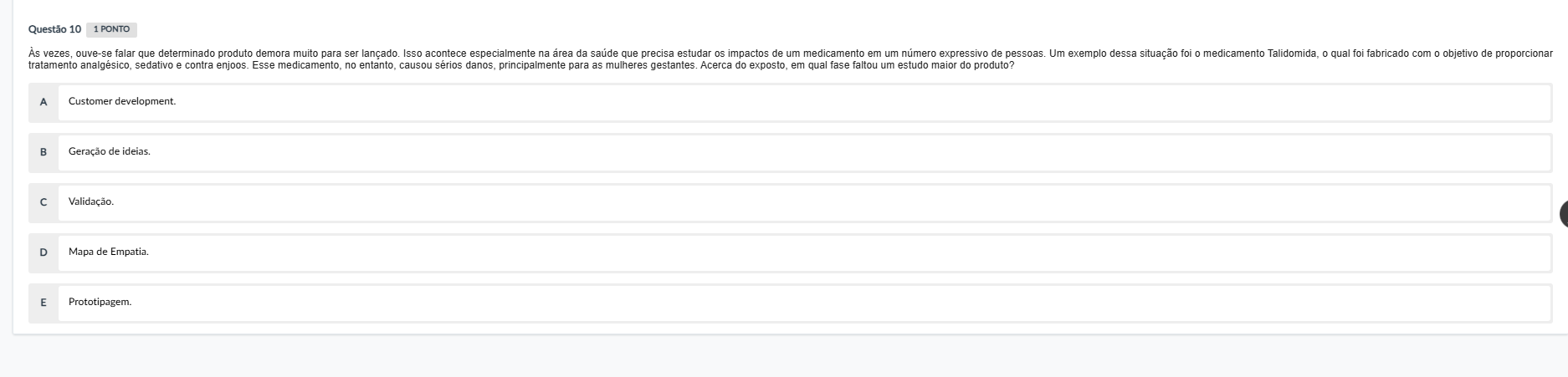 Questão 10 1 PONTO Às vezes, ouve-se falar que determinado produto demora muito para ser lançado. Isso acontece especialmente na area da que precisa estudar impactos de um medicamento em um numero expressivo de pessoas. Um exemplo dessa situação foi 0 medicamento Talidomida, 0 qual foi fabricado com 0 objetivo de proporcionar tratamento analgésico, sedativo e contra enjoos. Esse medicamento, no entanto, causou danos, principalmente para as mulheres gestantes. Acerca do exposto, em qual fase faltou um estudo maior do produto? A Customer development. B Geração de ideias. C Validação. D Mapa de Empatia. E Prototipagem.