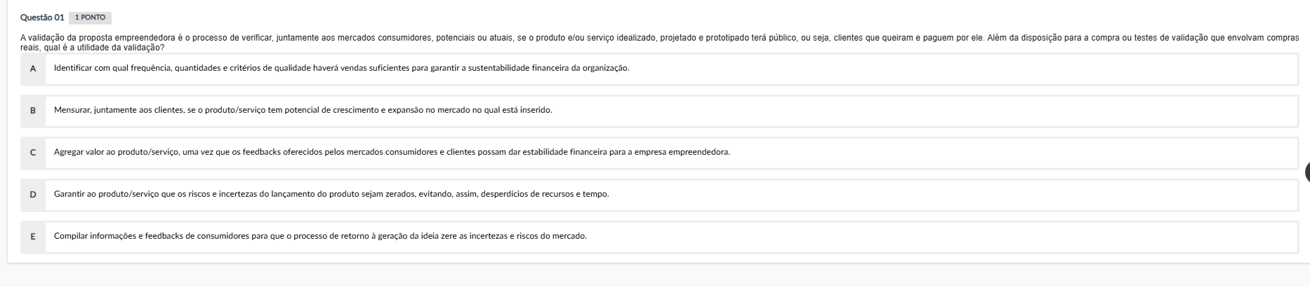 Questão 01 1 PONTO A validação da proposta empreendedora é 0 processo de verificar, juntamente aos mercados consumidores, potenciais ou atuais, se 0 produto e/ou serviço idealizado, projetado e prototipado público, ou seja, clientes que queiram e paguem por ele. Alem da disposição para a compra ou testes de validação que envolvam compras reais, qual a utilidade da validação? A Identificar com qual frequência, quantidades e critérios de qualidade havera vendas suficientes para garantir a sustentabilidade financeira da organização. B Mensurar, juntamente aos clientes, se produto/serviço tem potencial de crescimento e expansão no mercado no qual está inserido. C Agregar valor ao produto/serviço, uma vez que os feedbacks oferecidos pelos mercados consumidores e clientes possam dar estabilidade financeira para a empresa empreendedora. D Garantir ao produto/serviço que os riscos e incertezas do lançamento do produto sejam zerados, evitando, assim, desperdicios de recursos e tempo. E Compilar informações e feedbacks de consumidores para que processo de retorno à geração da ideia zere as incertezas e riscos do mercado.