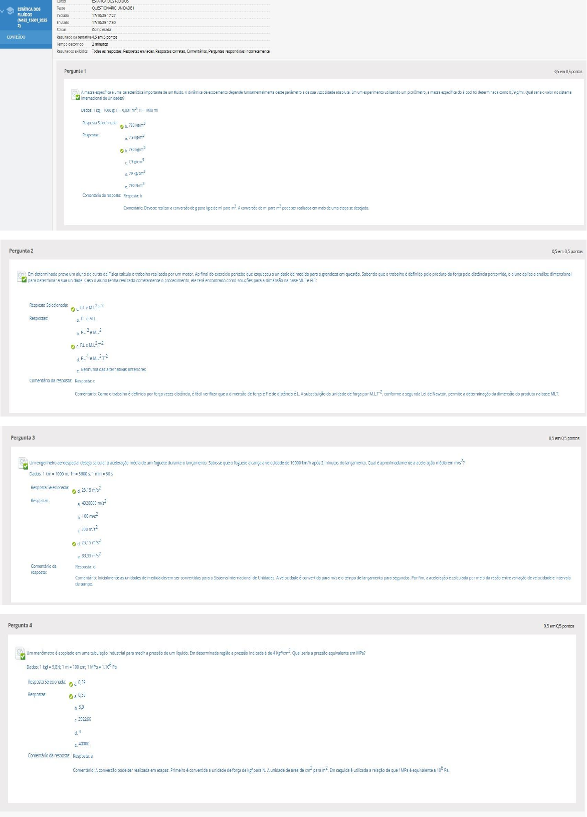 Lurso FLUIDOS ESTÁTICA DOS Teste QUESTIONÁRIO FLUÍDOS Iniciado 17/10/25 17:27 (N452 15601 2025 Enviado 17/10/25 17:30 2) Status Completada CONTEÚDO Resultado da tentativa em pontos Tempo decorrido 2 minutos Resultados exibidos Todas as respostas, Respostas enviadas, Respostas corretas, Perguntas respondidas incorretamente Pergunta 0.5 pontos massa específica uma característica importante de um A dinâmica de escoamento depende fundamentalmente deste parâmetro de sua viscosidade Em um experimento utilizando um picnômetro, massa específica do álcool foi determinada como g/ml. Qual seria valor no sistema internacional de Unidades? Dados Resposta Selecionada: Respostas: Comentário da resposta: Resposta b Comentário: Deve-se realizar conversão de para kg de ml para conversão de ml para pode ser realizada em mais de uma etapa se Pergunta 2 0,5 em 0,5 pontos Em determinada prova um aluno do curso de Física calcula trabalho realizado por um motor. Ao final do exercício percebe que esqueceu unidade de medida para grandeza em Sabendo que trabalho definido pelo produto da força pela distância percorrida, aluno aplica análise dimensional para determinar sua Caso aluno tenha realizado corretamente 0 procedimento, ele terá encontrado como soluções para dimensão na base MLT FLT: Resposta Respostas: 2 Nenhuma das alternativas anteriores Comentário da resposta: Resposta: Comentário: Como trabalho é definido por força vezes distância, fácil verificar que dimensão de força é de distância A substituição da unidade de força por conforme segunda Lei de permite a determinação da dimensão do produto na base MLT. Pergunta 3 0,5 0,5 pontos Um engenheiro aeroespacial deseja calcular a aceleração média de um foguete durante Sabe-se que foguete alcança velocidade de 10000 km/h após 2 minutos do lançamento Qual é aproximadamente a aceleração média em Dados: km 1000 1h 3600 min Resposta Selecionada: Respostas: 4320000 m/s2 100 300 23,15 83,33 Comentário da Resposta: resposta: Comentário: Inicialmente as unidades de medida devem ser convertidas para Sistema Internacional de A velocidade é convertida para m/s eo tempo de lançamento para segundos. Por fim, a aceleração é calculada por meio da razão entre variação de velocidade intervalo de tempo. Pergunta 4 em 0,5 pontos Um manômetro é acoplado em uma tubulação industrial para medir pressão de um Em determinada região pressão indicada de Qual seria pressão equivalente em MPa? Dados: kgf 9,8N; m 100 MPa Resposta Selecionada: Respostas: 0,39 392266 40000 Comentário da resposta: a Comentário: A conversão pode ser realizada em Primeiro é convertida unidade de força de kgf para N. A unidade de área de cm2 para Em seguida é utilizada relação de que 1MPa é equivalentePergunta 5 em 0,5 pontos Dois líquidos distintos são misturados em um vasilhame específico para esta São utilizados 300 ml do primeiro líquido 500 ml do segundo líquido. Sabendo que as massas específicas são respectivamente de 1,2 g/ml 0,8 g/ml, massa específica da mistura será de: Resposta Selecionada: 0.95 g/ml Respostas: 0,95 g/ml 0,9 g/ml d. Comentário da Resposta: b resposta: Comentário: Para obter resposta correta deve se inicialmente calcular as massas do líquido do líquido 2. Isto é possivel por meio do volume utilizado da massa específica de cada um dos componentes. Em seguida massa total da mistura dividida pelo volume total da mistura conforme definição de massa específica. Pergunta 6 0,5 em 0,5 pontos Um galão contendo 20 de um líquido é encontrado em uma Infelizmente nenhuma etiqueta ou marcação indica qual líquido A fim de identificá-lo um funcionário toma uma alíquota de 100 ml e pesa em uma balança de frasco vazio apresenta massa de Com alíquota 0 frasco apresenta massa de A tabela abaixo mostra os possíveis líquidos contidos no vasilhame Qual foi líquido encontrado na firma? Líquido Densidade (g/ml) Álcool 0,789 Querosene 0,82 Óleo lubrificante 0,879 Água Resposta Selecionada: Óleo Respostas: Álcool. a. Querosene b. Óleo Água. e. Nenhuma das alternativas anteriores. Comentário da resposta: Comentário: resultado é obtido pela comparação da massa específica do líquido com os valores É importante notar que 0 volume do líquido utilizado no cálculo, não volume do recipiente. Pergunta 7 0 em 0,5 pontos Um líquido de peso específico de 8000 mantido em um reservatório cilindrico de raio igual 0,5 m altura igual a 1,5 m. Em determinado dia feito uma medida qual se verifica profundidade de m dentro do Sendo assim, calcule a massa de líquido armazenada. Resposta Selecionada: Respostas: Pergunta 8 0,5 em 0,5 pontos Um lubrificante A cuja viscosidade absoluta é de 0,99 utilizado por uma indústria. Em determinada visita técnica um vendedor apresenta um lubrificante similar aA com viscosidade cinemática de 0.0011 massa específica igual a A firma necessita de um lubrificante com menor resistência ao Com base nessas informações, qual é lubrificante apresentado que possui tal Qual a viscosidade absoluta de B? Resposta Selecionada: fluido possui menor resistência ao A viscosidade absoluta de Bé igual Respostas: fluido A possui menor resistência ao A viscosidade absoluta de igual a 0,935 Pa.s fluido A possui menor resistência ao A viscosidade absoluta de B igual Pa.s b. fluido possui menor resistência ao A viscosidade absoluta de igual 0,935 Pas fluido possui menor resistência ao A viscosidade absoluta de igual a 0,850 São e. Comentário da resposta: Resposta: Comentário: Para comparar viscosidade dos dois lubrificantes cálculo da viscosidade absoluta de Como a viscosidade absoluta determina resistência ao escoamento, possui melhores características para aplicação desejada.Pergunta 9 0,5 em 0,5 pontos Um manômetro é um medidor de pressão utilizado para efetuar medidas de pressão na escala efetiva. Em uma tubulação de água a pressão indicada por um manômetro