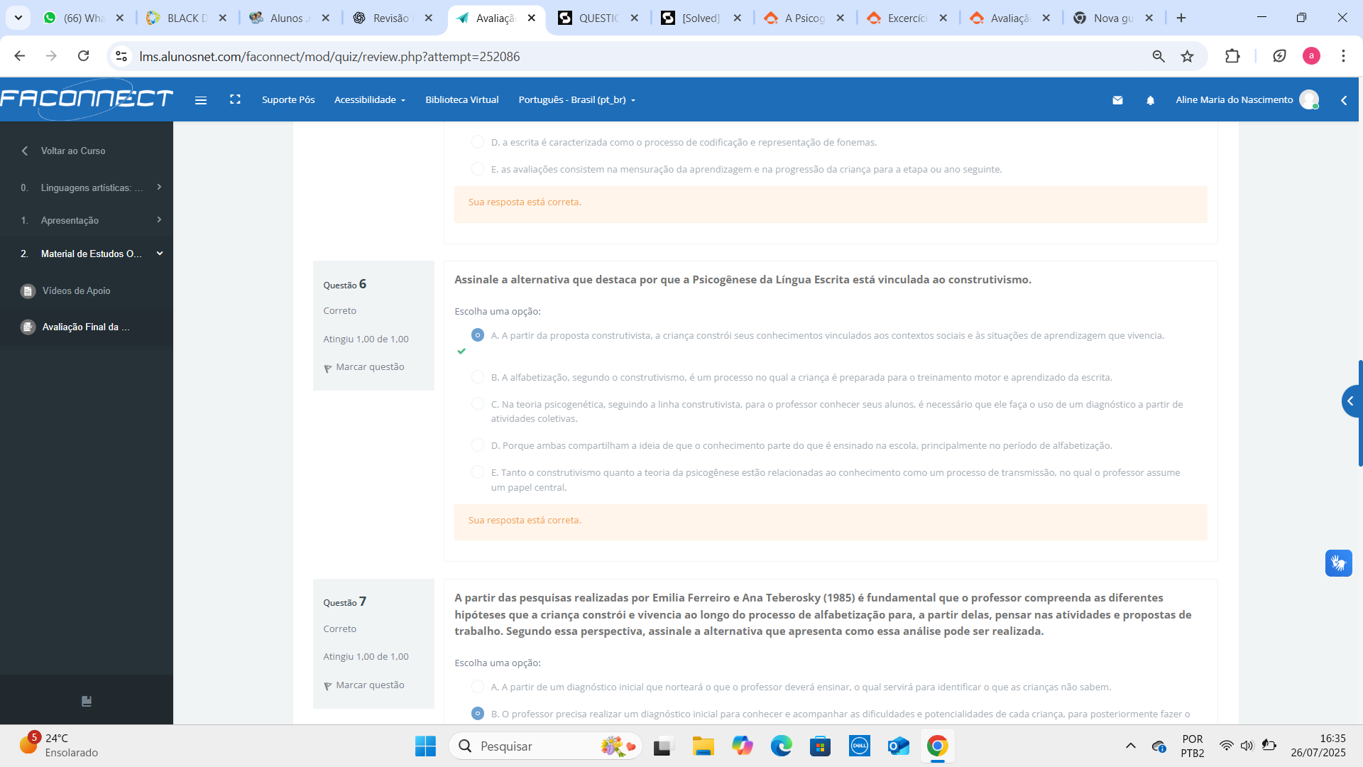 (66) Wha BLACK Alunos Revisão Avaliaçã QUESTIC [Solved] A Excercíci Avaliaçã Nova gu + X a FACONNECT Suporte Pós Acessibilidade Biblioteca Virtual Português Brasil (pt_br) Aline Maria do Nascimento D. a escrita é caracterizada como 0 processo de codificação e representação de fonemas. Voltar ao Curso E. as avaliações consistem na mensuração da aprendizagem e na progressão da criança para a etapa ou ano seguinte. 0. Linguagens artísticas: > Sua resposta está correta. 1. Apresentação > 2. Material de Estudos O. Questão 6 Assinale a alternativa que destaca por que a Psicogênese da Língua Escrita está vinculada ao construtivismo. Vídeos de Apoio Correto Escolha uma opção: Avaliação Final da Atingiu 1,00 de 1,00 A. A partir da proposta construtivista, a criança constrói seus conhecimentos vinculados aos contextos sociais e às situações de aprendizagem que vivencia. Marcar questão B. A alfabetização, segundo construtivismo, é um processo no qual a criança é preparada para treinamento motor e aprendizado da escrita. C. Na teoria psicogenética, seguindo a linha construtivista, para 0 professor conhecer seus alunos, é necessário que ele faça uso de um diagnóstico a partir de atividades coletivas. D. Porque ambas compartilham a ideia de que conhecimento parte do que é ensinado na escola, principalmente no de alfabetização. E. Tanto construtivismo quanto a teoria da psicogênese estão relacionadas ao conhecimento como um processo de transmissão, no qual professor assume um papel central. Sua resposta está correta. Questão 7 A partir das pesquisas realizadas por Emilia Ferreiro e Ana Teberosky (1985) é fundamental que professor compreenda as diferentes hipóteses que a criança constrói e vivencia ao longo do processo de alfabetização para, a partir delas, pensar nas atividades e propostas de Correto trabalho. Segundo essa perspectiva, assinale a alternativa que apresenta como essa análise pode ser realizada. Atingiu 1.00 de 1.00 Escolha uma opção: Marcar questão A. A partir de um diagnóstico inicial que norteará 0 que 0 professor deverá ensinar, qual servirá para identificar que as crianças não sabem. B.O professor precisa realizar um diagnóstico inicial para conhecer e acompanhar as dificuldades e potencialidades de cada criança, para posteriormente fazer 5 24°C POR 16:35 Pesquisar Ensolarado PTB2 26/07/2025