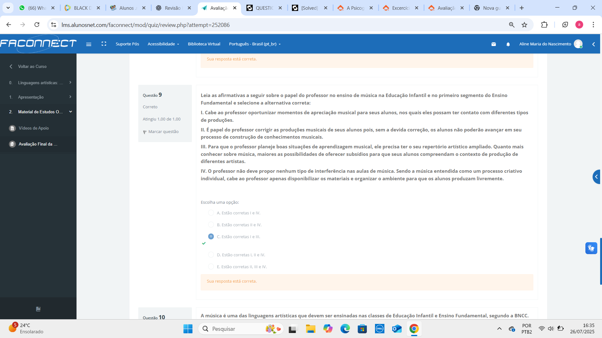 (66) Wha BLACK Alunos Revisão Avaliaçã QUESTIC [Solved] A Excercíc Avaliaçã Nova gu X + X Ims.alunosnet.com/faconnect/mod/quiz/review.php?attempt=252086 4 a : FACONNECT Suporte Pós Acessibilidade Biblioteca Virtual Português Brasil (pt_br) Aline Maria do Nascimento Sua resposta está correta. Voltar ao Curso 0. Linguagens artísticas: > 1. Apresentação > Questão 9 Leia as afirmativas a seguir sobre papel do professor no ensino de música na Educação Infantil e no primeiro segmento do Ensino Fundamental e selecione a alternativa correta: Correto 2. Material de Estudos I. Cabe ao professor oportunizar momentos de apreciação musical para seus alunos, nos quais eles possam ter contato com diferentes tipos Atingiu 1,00 de 1,00 de produções. Vídeos de Apoio Marcar questão II. É papel do professor corrigir as produções musicais de seus alunos pois, sem a devida correção, os alunos não poderão avançar em seu processo de construção de conhecimentos musicais. Avaliação Final da III. Para que professor planeje boas situações de aprendizagem musical, ele precisa ter seu repertório artístico ampliado. Quanto mais conhecer sobre música, maiores as possibilidades de oferecer subsídios para que seus alunos compreendam contexto de produção de diferentes artistas. IV. professor não deve propor nenhum tipo de interferência nas aulas de música. Sendo a música entendida como um processo criativo individual, cabe ao professor apenas disponibilizar os materiais e organizar O ambiente para que os alunos produzam livremente. Escolha uma opção: A. Estão corretas e IV. B. Estão corretas e IV. C. Estão corretas e III. D. Estão corretas I, e IV. E. Estão corretas II, III e IV. Sua resposta está correta. Ouestão 10 A música é uma das linguagens artísticas que devem ser ensinadas nas classes de Educação Infantil e Ensino Fundamental, segundo a BNCC. 5 24°C POR 16:35 Ensolarado Pesquisar PTB2 26/07/2025