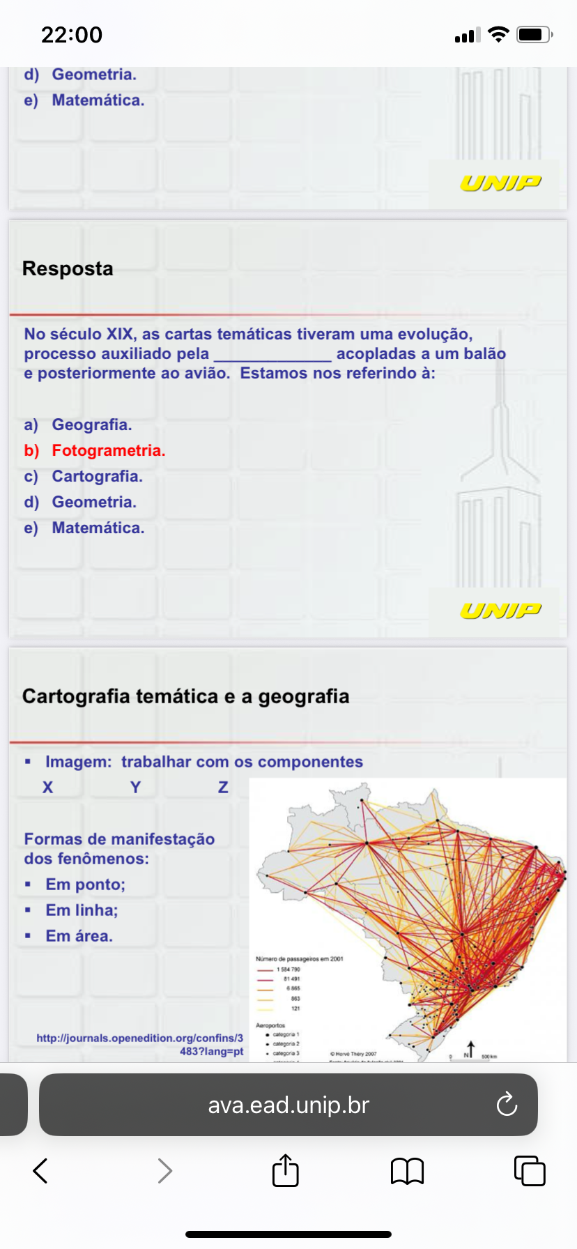 22:00 d) Geometria. e) Matemática. UNIP Resposta No século XIX, as cartas temáticas tiveram uma evolução, processo auxiliado pela acopladas a um balão e posteriormente ao avião. Estamos nos referindo à: a) Geografia. b) Fotogrametria. c) Cartografia. d) Geometria. e) Matemática. UNIP Cartografia temática e a geografia Imagem: trabalhar com os componentes X Y Z Formas de manifestação dos fenômenos: Em ponto; Em linha; Em área. de passageiros em 2001 121 Aeroportos http://journals.openedition.org/confins/3 . . categoria 2 483?lang=pt categoria 3 Thery 2007 500km ava.ead.unip.br